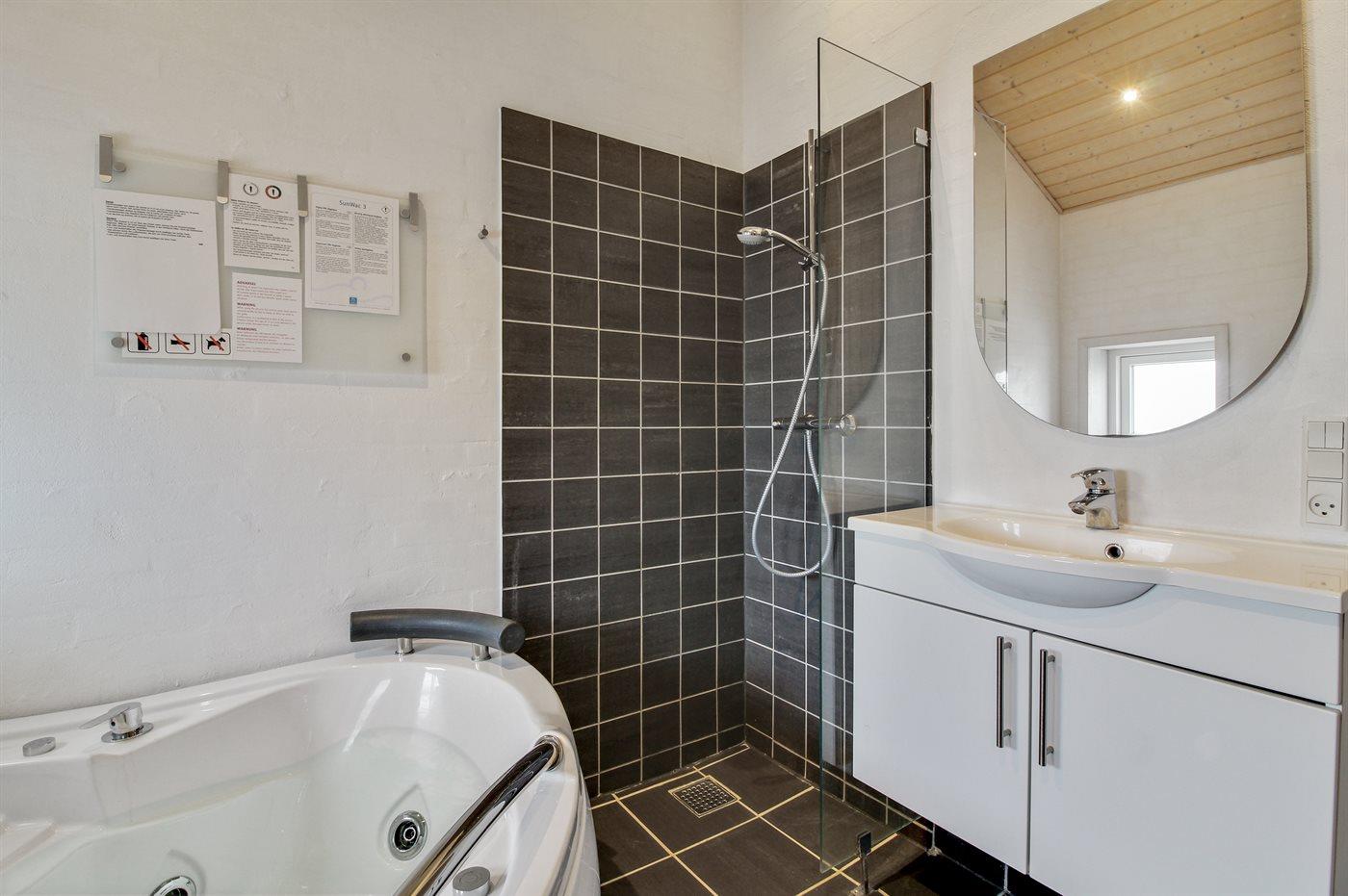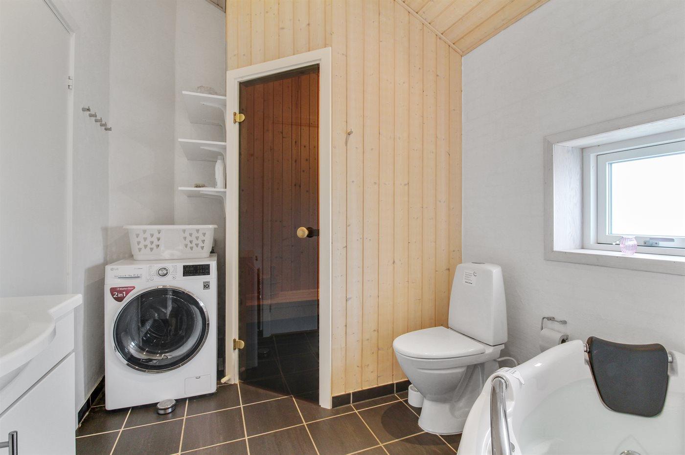 Der er 2 badeværelser med bruseniche og 2 toiletter. Der er gulvvarme på 2 badeværelser. I saunaen er der mulighed for afslapning.