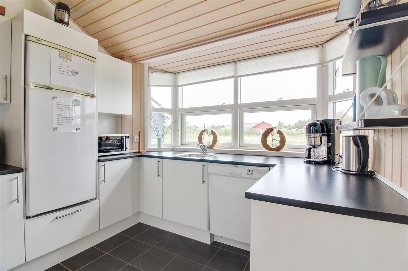 Køkkenet er udstyret med 1 køleskab. Der er 4 keramiske kogeplader, varmluftovn, mikrobølgeovn samt opvaskemaskine. Desuden findes der en Airfryer.