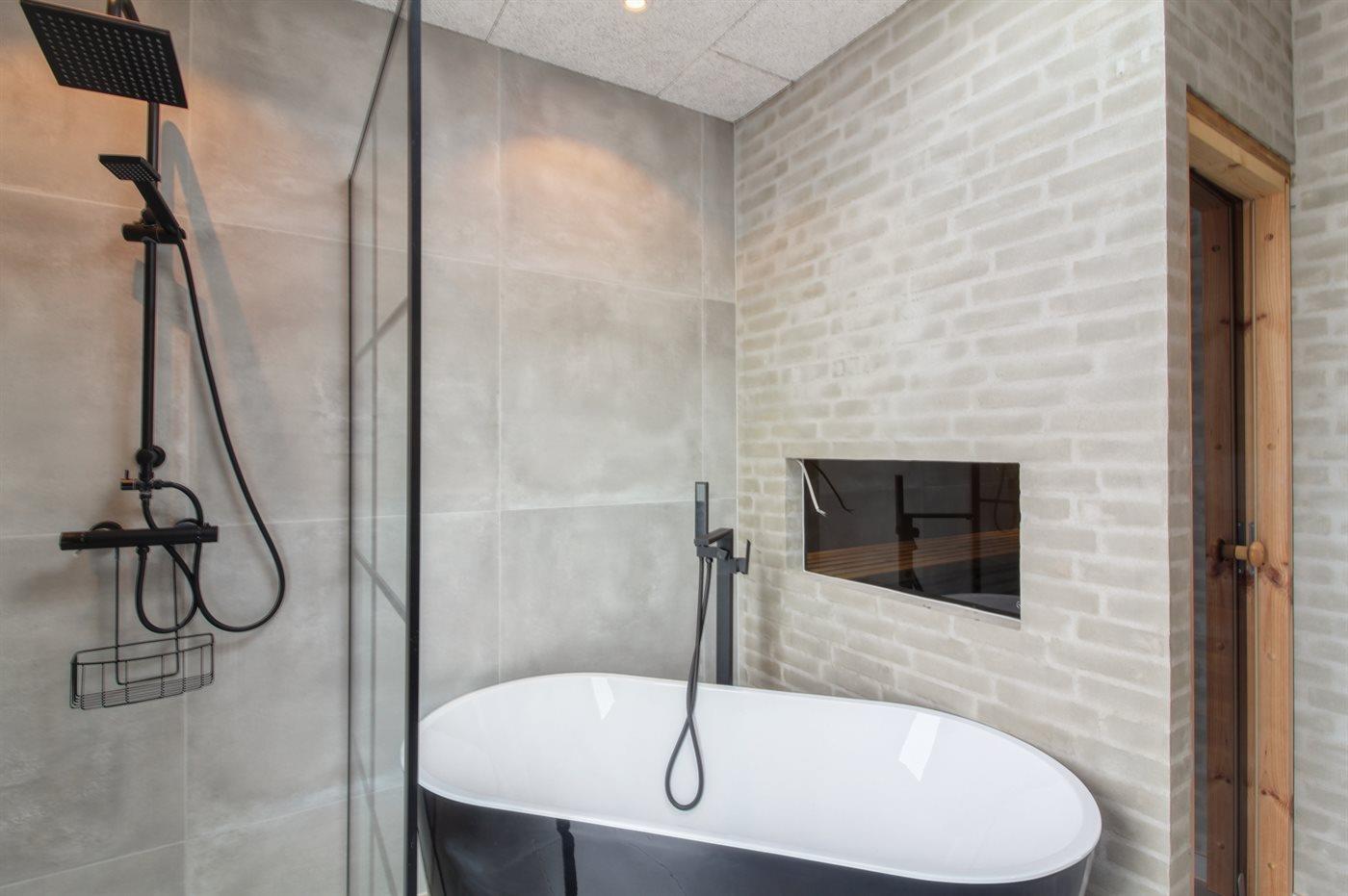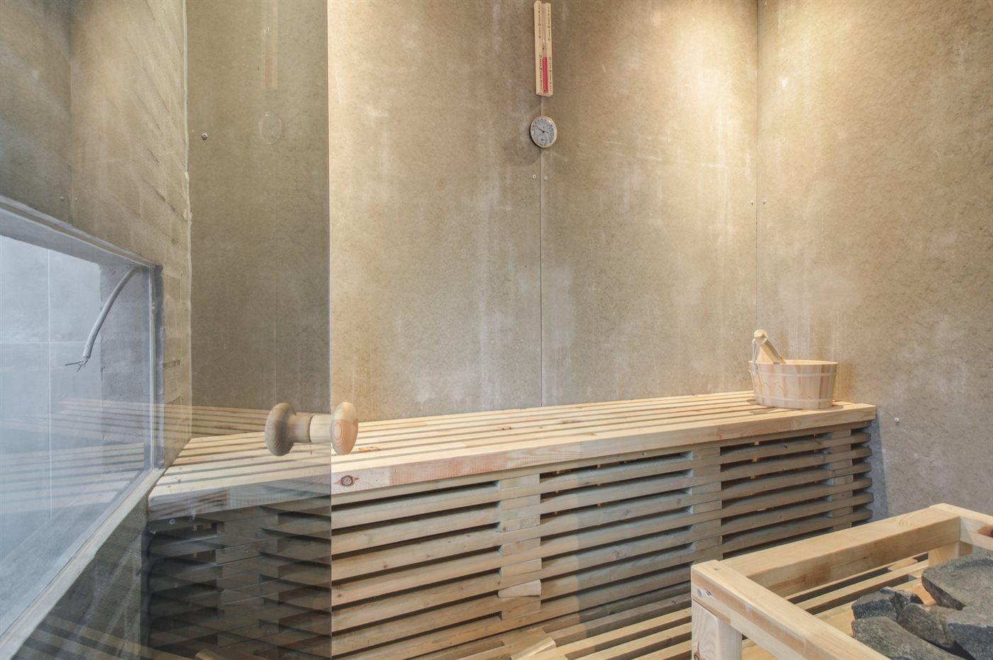 Der er 2 badeværelser med bruseniche og 2 toiletter. Badekar. I saunaen er der mulighed for afslapning.