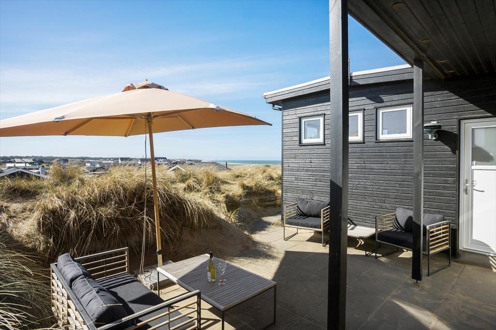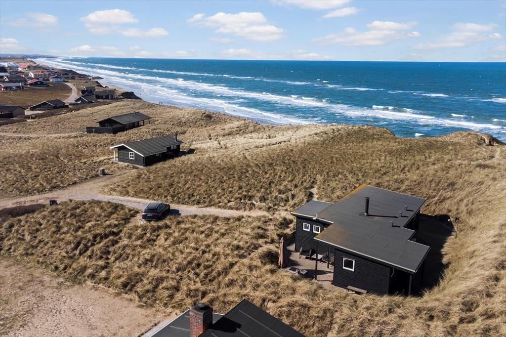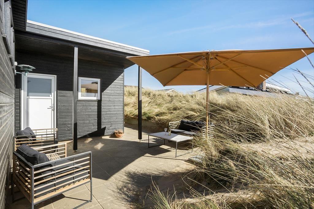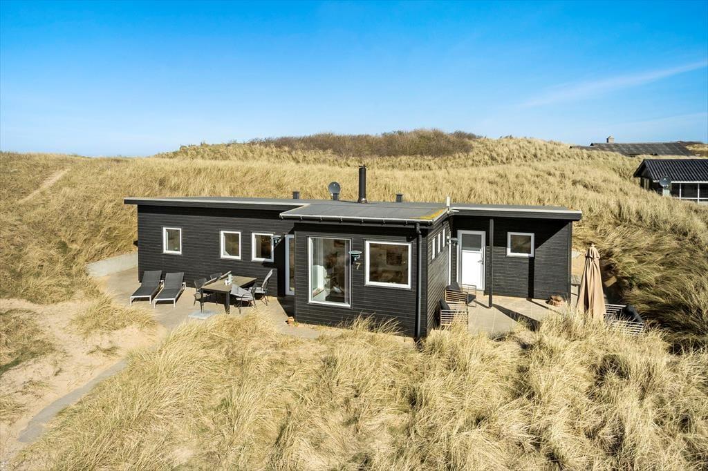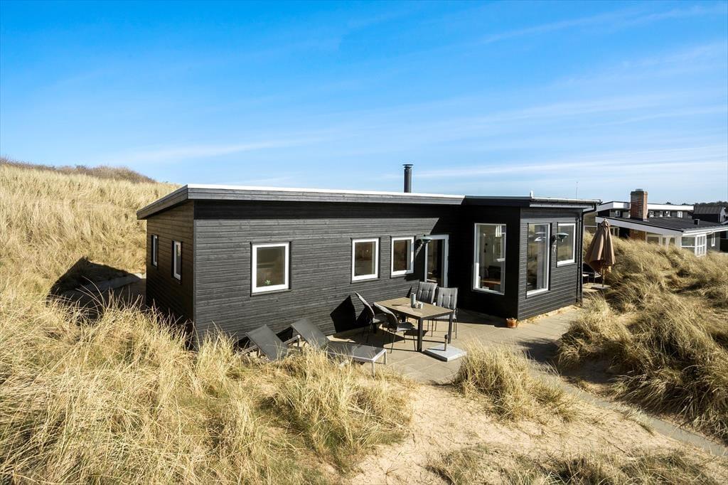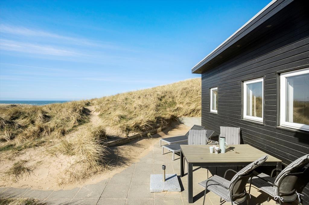 Sommerhuset ligger på en stor klitgrund, der smelter sammen med de naturskønne omgivelser. Og takket være det kuperede landskab ligger terrassemiljøet i læ mellem klitterne, så I kan nyde sol og sommerliv i ugenerede rammer, når I slapper af i havemøblerne, griller og leger. At sommerhuset ligger for enden af vejen betyder selvfølgelig også noget for den fredfyldte fornemmelse, som hersker her – på trods af at I bor så tæt på stranden og Vesterhavet.
