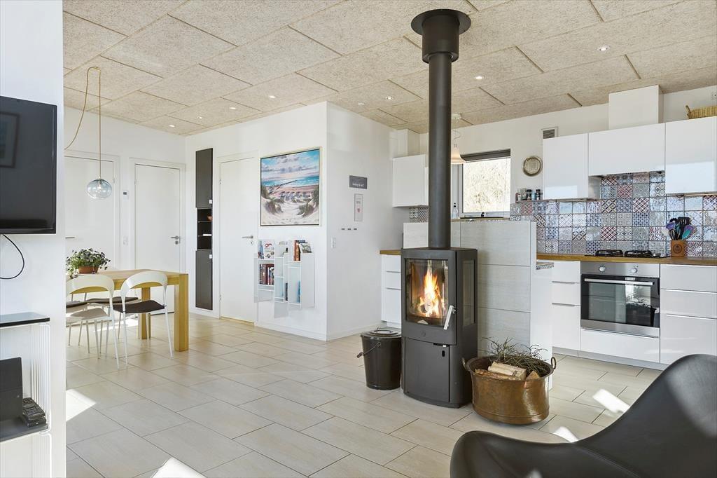 Feriestemningen er i top inden døre, hvor rummene har en dejlig lys atmosfære og er indrettede med møbler af god kvalitet. Den gode rumfornemmelse kommer også af, at der er gulvvarme i hele huset, og med varmepumpe og brændeovn oveni kan I se frem til et behageligt indeklima året rundt. Husets mange vinduer sørger for et dejligt lysindfald, og udsigten til klitterne er selvfølgelig også med til at pynte. Opholdsrummet er indrettet med et flot åbent køkken, en god spiseplads og en komfortabel sofaafdeling med tv med Chromecast. Et pænt badeværelse med bruser hører også med til planløsningen foruden tre gode soveværelser, hvoraf det ene ligger for sig som et anneks i direkte forlængelse af sommerhuset.