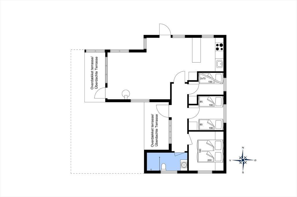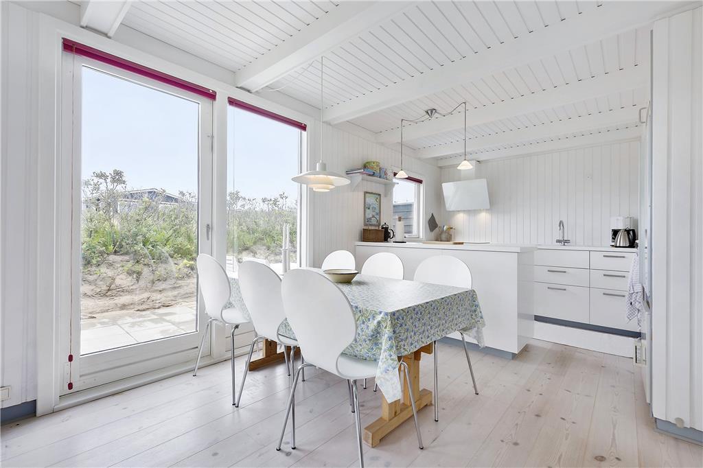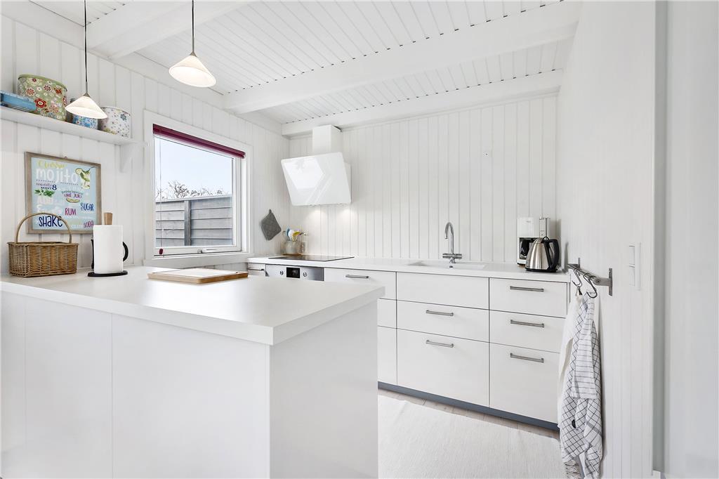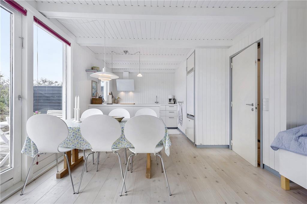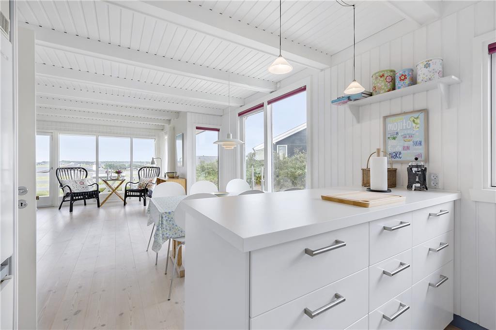 Hjertet af det 68 m2 charmerende hus, er det åbne køkken-alrum; Her kan hyggen hurtigt sprede sig, enten ved hjælp af brændeovnen på en regnvejrsdag, eller fra de store vinduespartier som virkelig lukker det fantastiske nordjyske lys ind og skaber en skøn stemning. Køkkenet er moderne med gode hårde-hvidevarer og overalt er her lyst og venligt. Fra stuen er der to udgange til de gode terrassearealer, hvorfra udsigten er fantastisk. Der er mulighed for både at benytte sig af en dobbeltseng, enkeltsenge eller en køjeseng, som de tre værelser tilbyder og huset er derfor godt egnet til både familier og par som ønsker at tilbringe noget kvalitetstid sammen.
