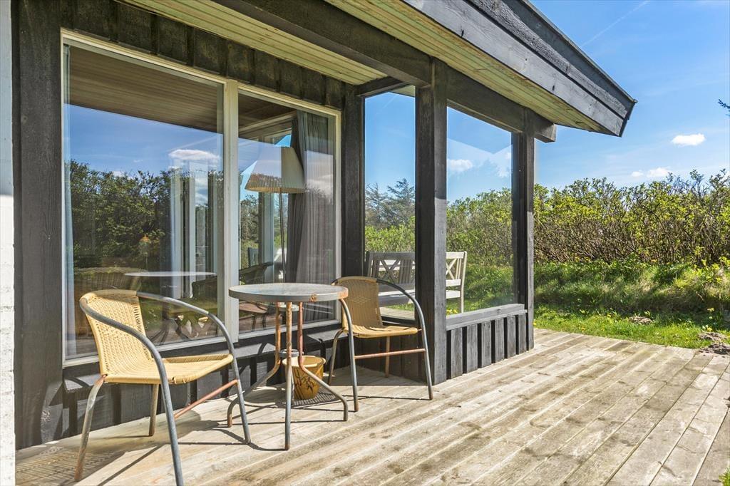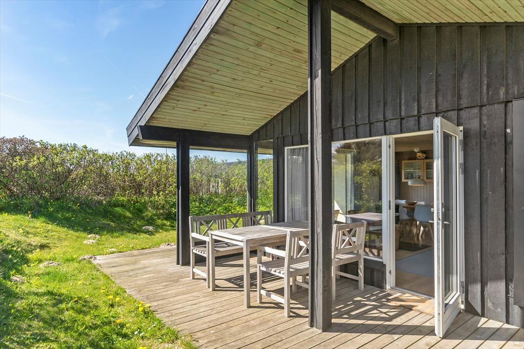 Sommerhuset ligger på en dejlig grund med en fin udsigt til vandet. Der er udgang til en terrasse fra både køkken-alrummet og dagligstuen, hvilket giver mulighed for at følge solen rundt hele dagen. Der er naturligvis grill, havemøbler og liggestole til rådighed.