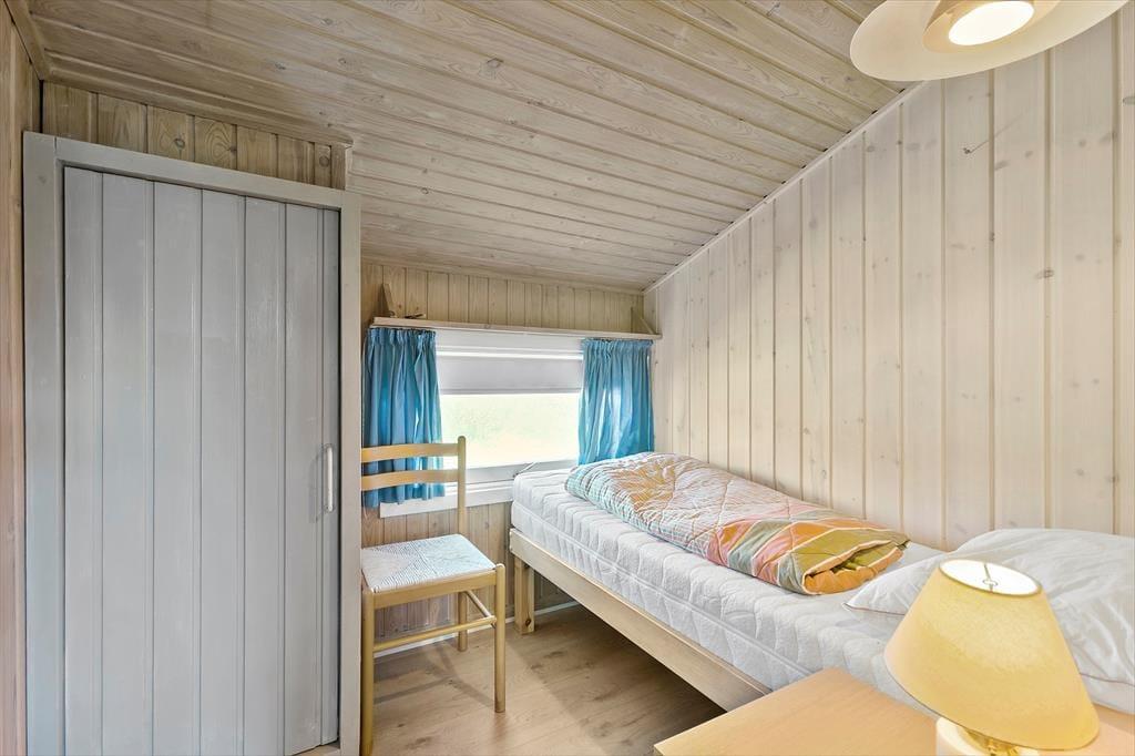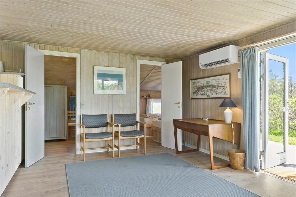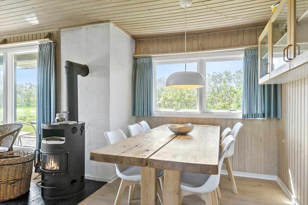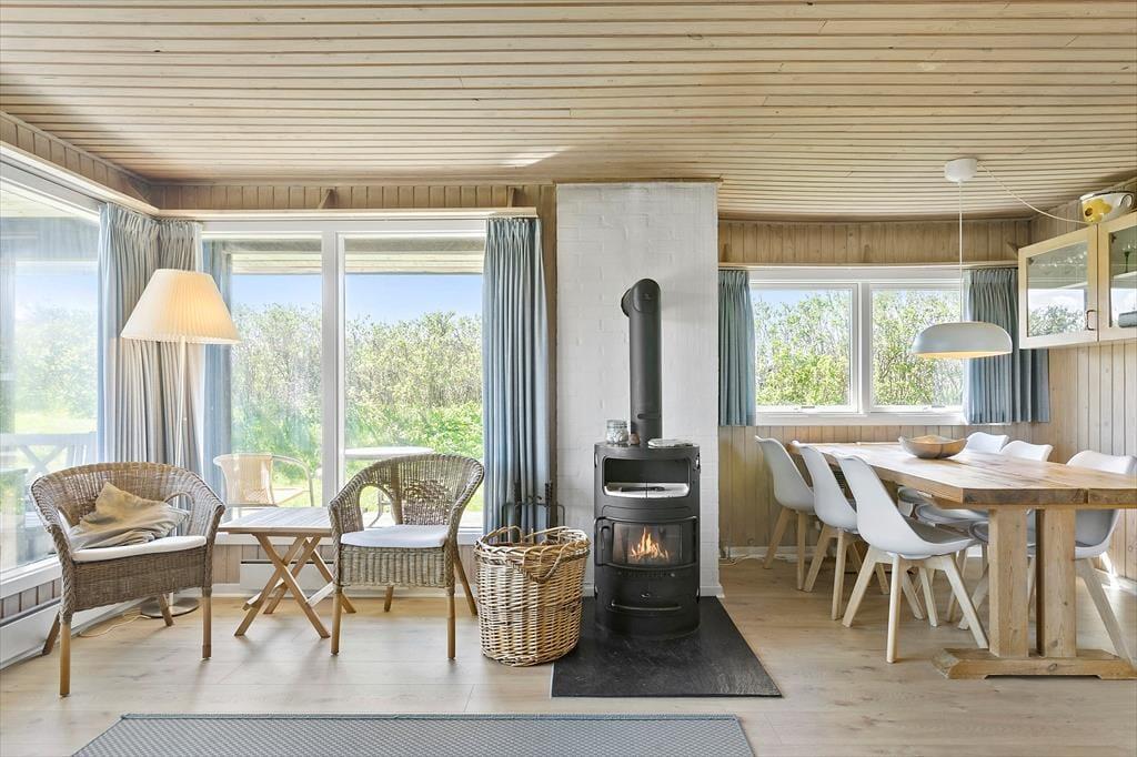 Dette 119m² store sommerhus indeholder to stuer; et køkken-alrum i den ældre del af huset, hvor der både er plads til at spise og slappe af, samt en dagligstue i den nye del med behagelige møbler, en god udsigt og plads til hygge og samvær. Begge stuer indeholder brændeovn og er indrettet i en hyggelig gammel stil. Sommerhuset er op til 7 personer. I huset er der tre soveværelser til rådighed: ét soveværelse med en dobbeltseng og to meget små værelser – det ene med en enkeltseng og det andet med to enkeltsenge. Disse to værelser egner sig bedst til børn. Badeværelset er flot og nyrenoveret og indeholder en rummelig bruseniche og vaskemaskine. I annekset, ved siden af garagen, er der også et værelse med en dobbeltseng og med separat bruseniche og toilet.