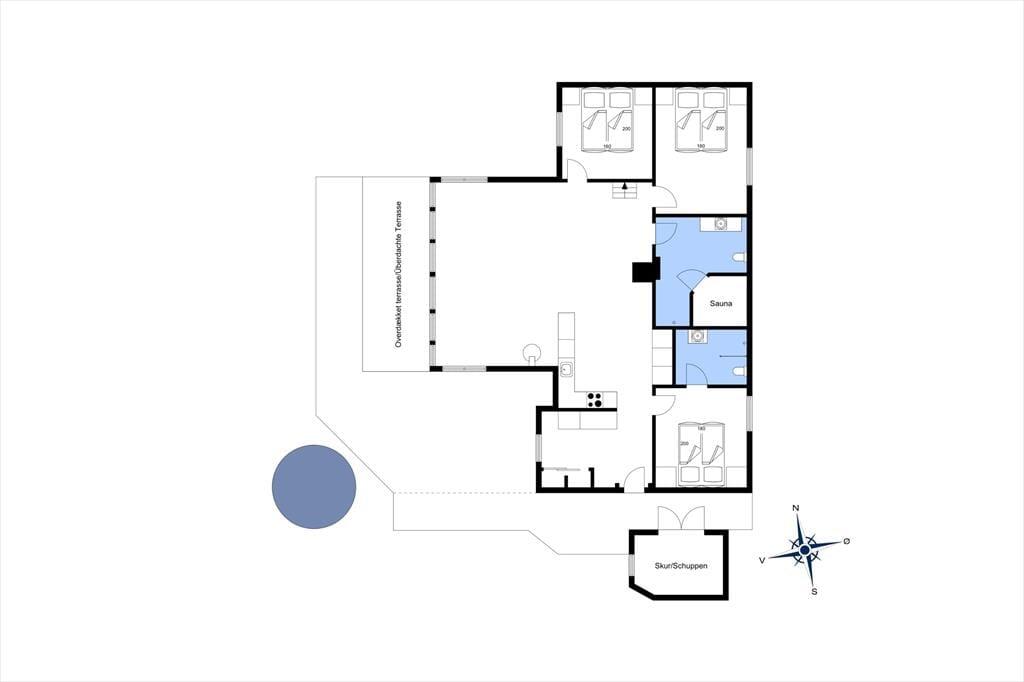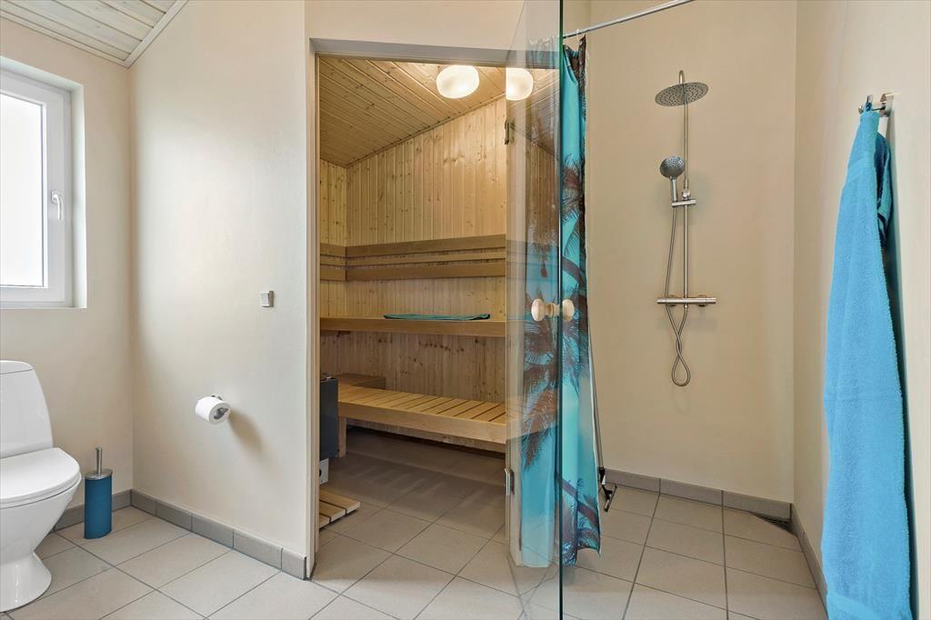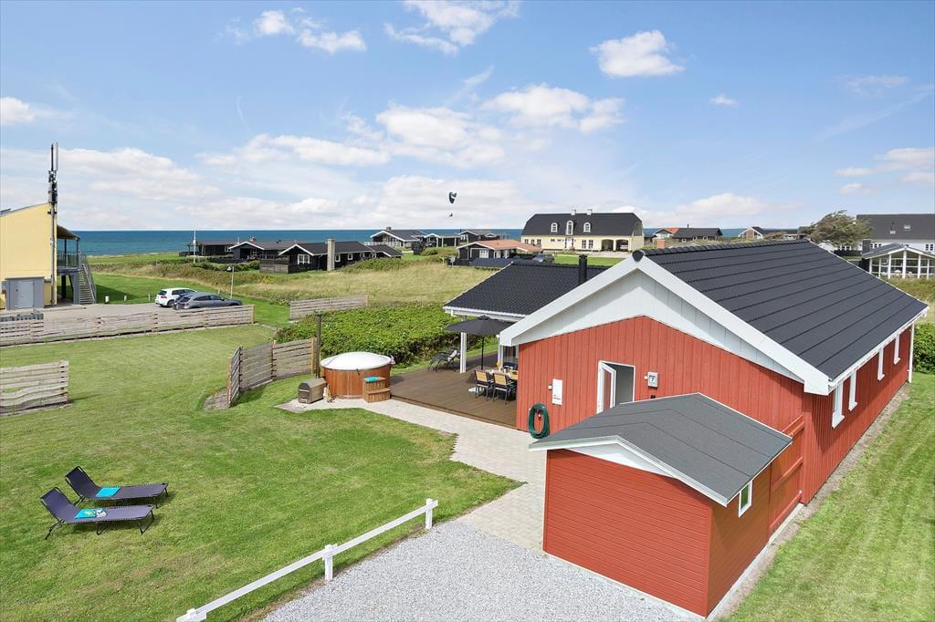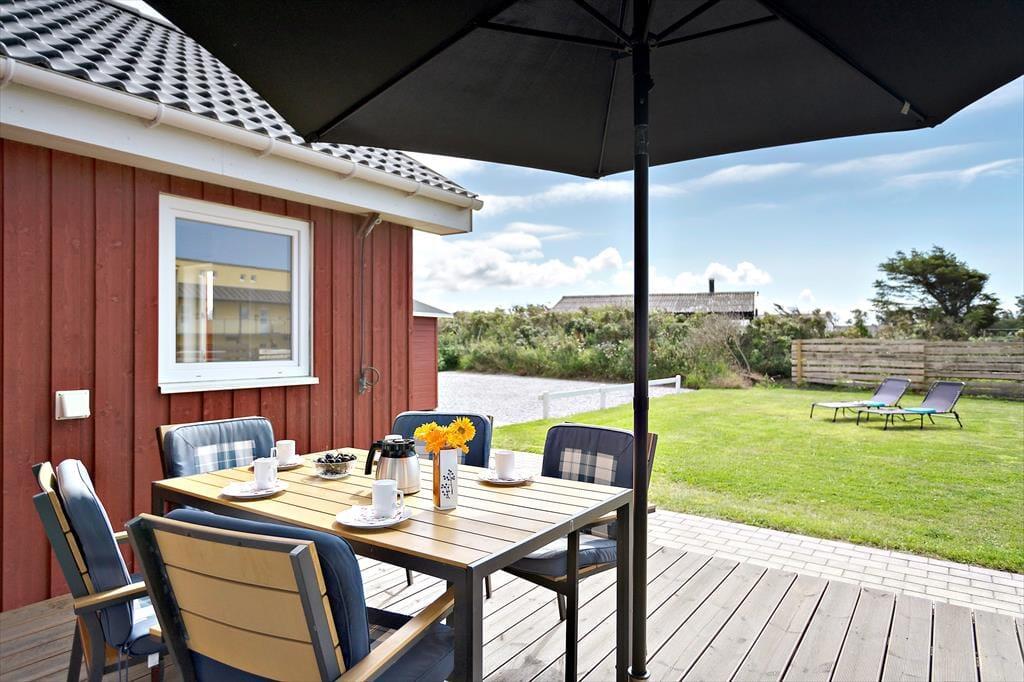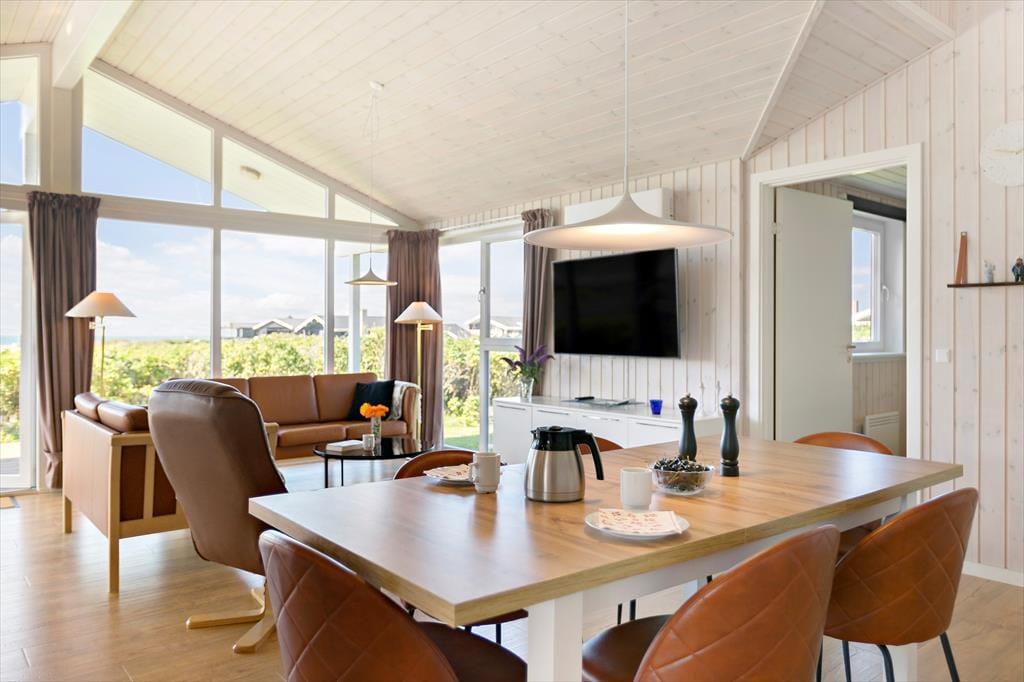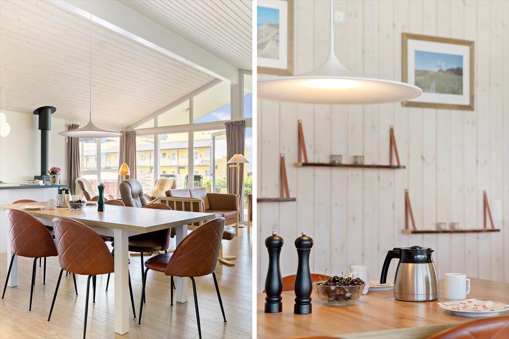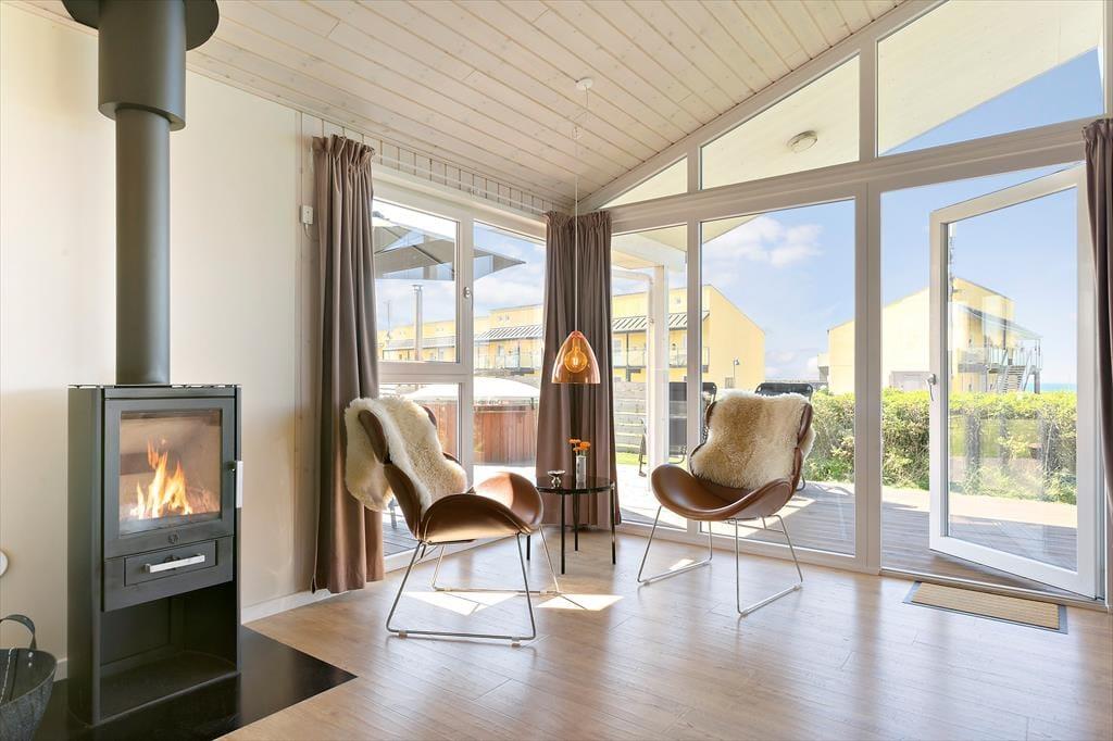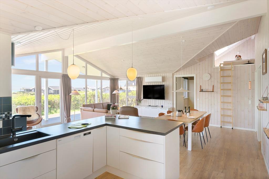 På grund af den attraktive beliggenhed kan I nyde synet af Vesterhavet, når I hygger jer inden døre. Et kæmpe gavlvindue i opholdsrummet vender mod vest og dermed ud mod vandet, og det giver naturligvis også et skønt lysindfald med så store vinduespartier. I det hele taget er atmosfæren lys og indbydende i sommerhuset, der er opført i 2020 og indrettet på enkel og stilren vis. Sommerhusets tre soveværelser er alle udstyret med gode dobbeltsenge og garderobeskabe, og i den rummelige entré er der vaskesøjle og god plads til overtøjet. Fra entréen er der åben forbindelse til et flot køkken og videre ind i stuen, hvor en brændeovn står klar til at sprede hygge og varme på kølige dage. Trænger I til lidt ekstra varme, kan I forkæle jer selv med en tur i saunaen, der ligger på det største af husets to badeværelser.