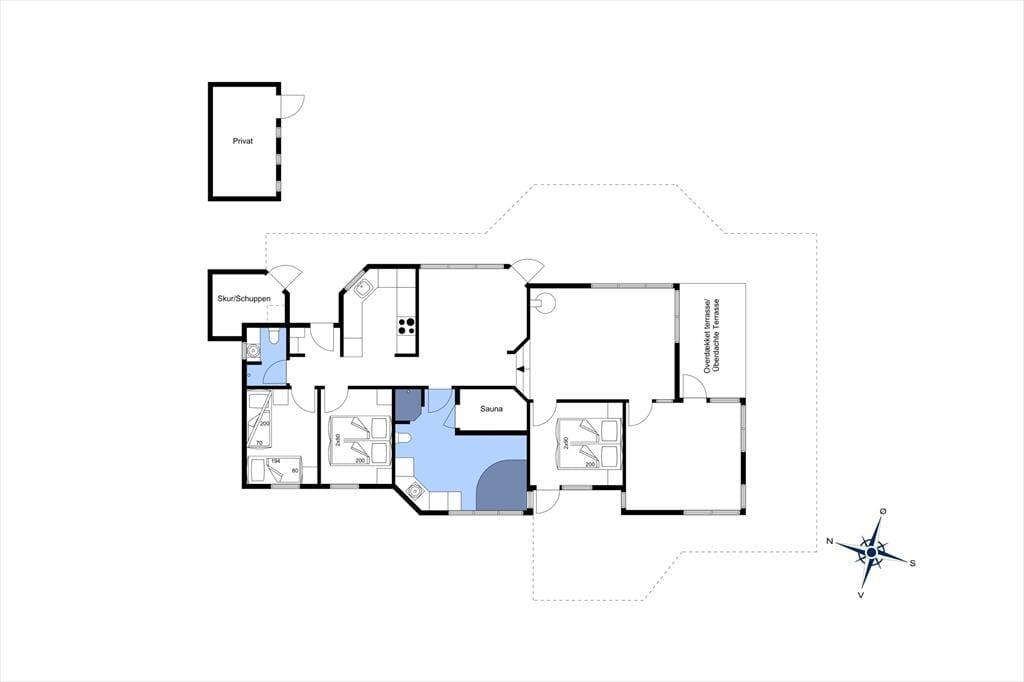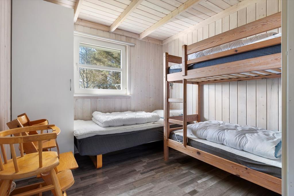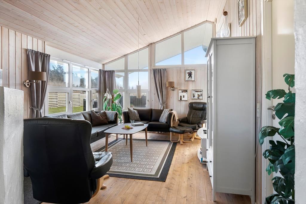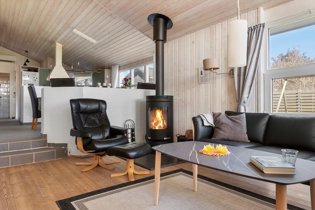 Hele familien kan sagtens være med, for både store og små kan trives i det 118 m2 store sommerhus. På de tre soveværelser er der i alt syv sengepladser – og så er der for øvrigt madrasser på hemsen, hvis I vil bruge den som en alternativ soveplads eller som hyggekrog i løbet af dagen. Der er nu også masser af plads til at hygge sig i husets lyse opholdsafdeling, hvor et velindrettet køkken-alrum ligger i åben forbindelse med en stue, der lokker med brændeovn, bløde siddemøbler og TV med Chromecast. Fra stuen går turen videre til en dejlig udestue, der er udstyret med store vinduer og har direkte udgang til terrassen. Trænger I til varme og afslapning, er det heldigt, at der er både spabad og sauna på det største af husets to badeværelser.