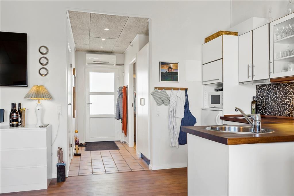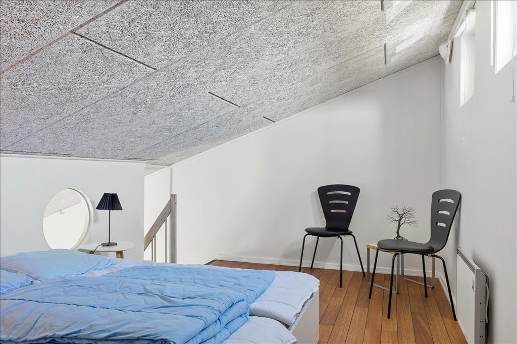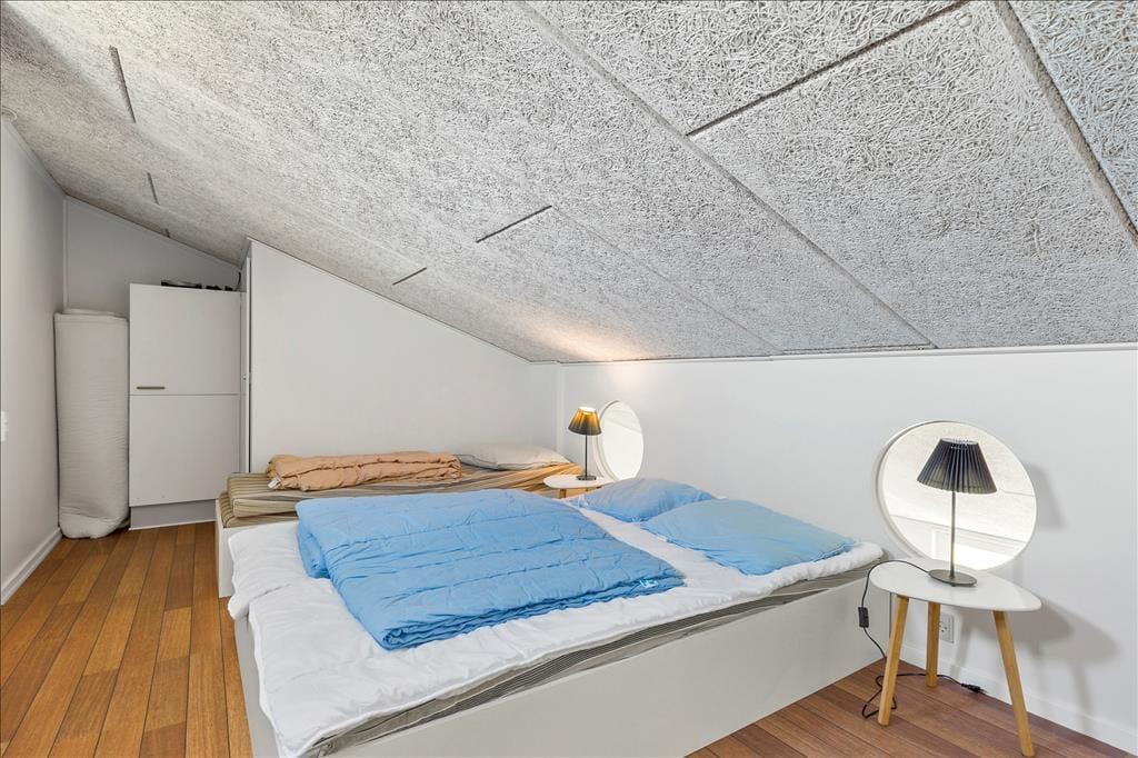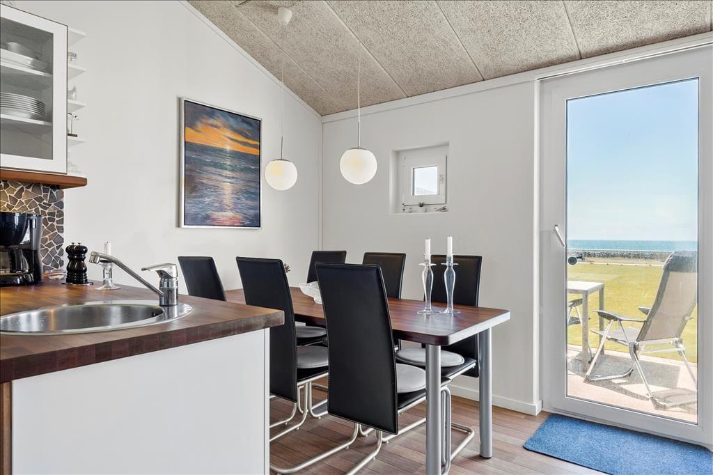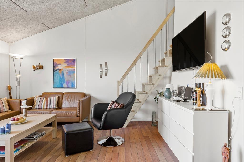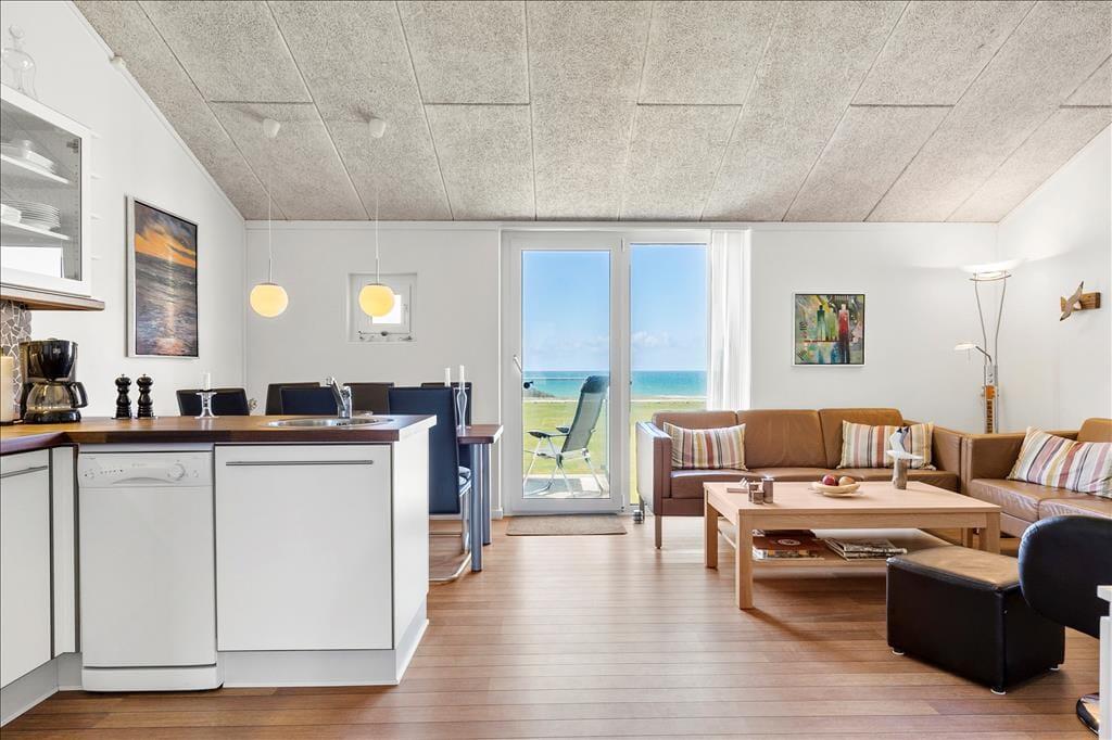 Vesterhavet er helt sikkert noget af det, der lokker mange feriegæster til Nr. Lyngby og omegn, og her i lejligheden behøver I slet ikke bevæge jer ud i det fri for at nyde synet: Selv når I står og forbereder aftensmaden i køkkenet eller hygger jer ved spisebordet, har I udsigt til vandet. I det hele taget er lejligheden behagelig at opholde sig i – blandt andet takket være møblementet, der er både pænt og komfortabelt. Opholdsrummet, hvor køkken og stue er forenet, er lejlighedens største rum, og planløsningen byder derudover på et funktionelt badeværelse og et godt soveværelse med dobbeltseng. En trappe fører op til en rummelig hems, som er udstyret med både en enkeltseng og en dobbeltseng, så i alt er der plads til fem feriegæster i lejligheden.