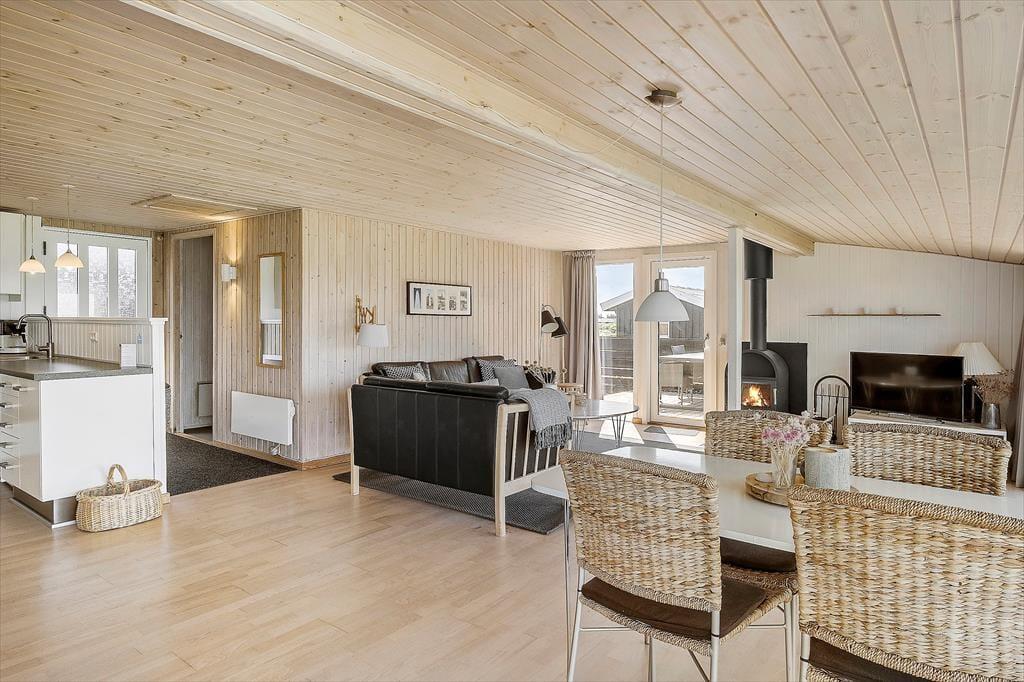 Hvis I er til imponerende udsigtspunkter, frit udsyn og flot natur, skal I unde jer selv at holde ferie i huset. Her på adressen bliver I nemlig belønnet med det vildeste vue i stuen, hvor et vinduesparti dækker hele den vestvendte væg, og selv når I børster tænder på badeværelset kan I kigge ud på Vesterhavets blå bølger. Køkkenet ligger i åben forbindelse med stuen, så her går I ikke glip af noget – heller ikke det hyggelige samvær, der finder sted i opholdsrummet. I stuen er der for øvrigt brændeovn, og hvis I ellers kan løsrive blikket fra udsigten, er der tv med Chromecast. Er det ved at være sengetid, kan I sige godnat og se frem til en god nats søvn på sommerhusets to soveværelser.