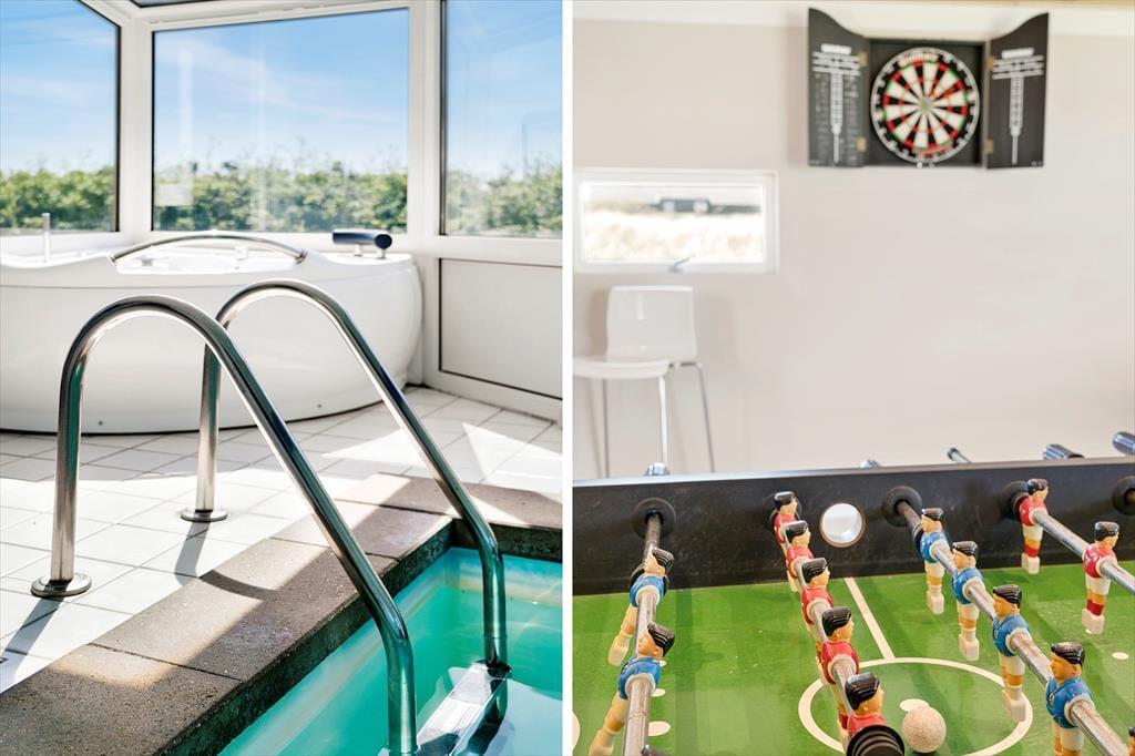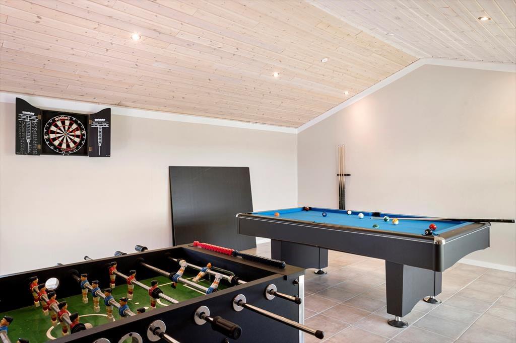 Sommerhuset er rummeligt og har en moderne indretning, så her er alt, hvad der skal til for at få en sjov og afslappende ferie med familie eller venner. Med fire soveværelser og to badeværelser passer planløsningen ideelt til otte personer – for eksempel to børnefamilier, hvis det er sådan en ferie, du er i gang med at planlægge. Et nyt og veludstyret køkken, der er holdt i smukke farvetoner, ligger i forlængelse af stuen. Her kan du og dine kære samles om langbordet til spil og hygge, mens køkkenholdet tilbereder lækre retter. Efter en lang dag på farten kan du forkæle dig selv med et varmt spabad eller et dyp i den indendørs pool. Og i annekset finder du et helt nyrenoveret aktivitetsrum med blandt andet bordfodbold og poolbord, når der skal dystes i spil.