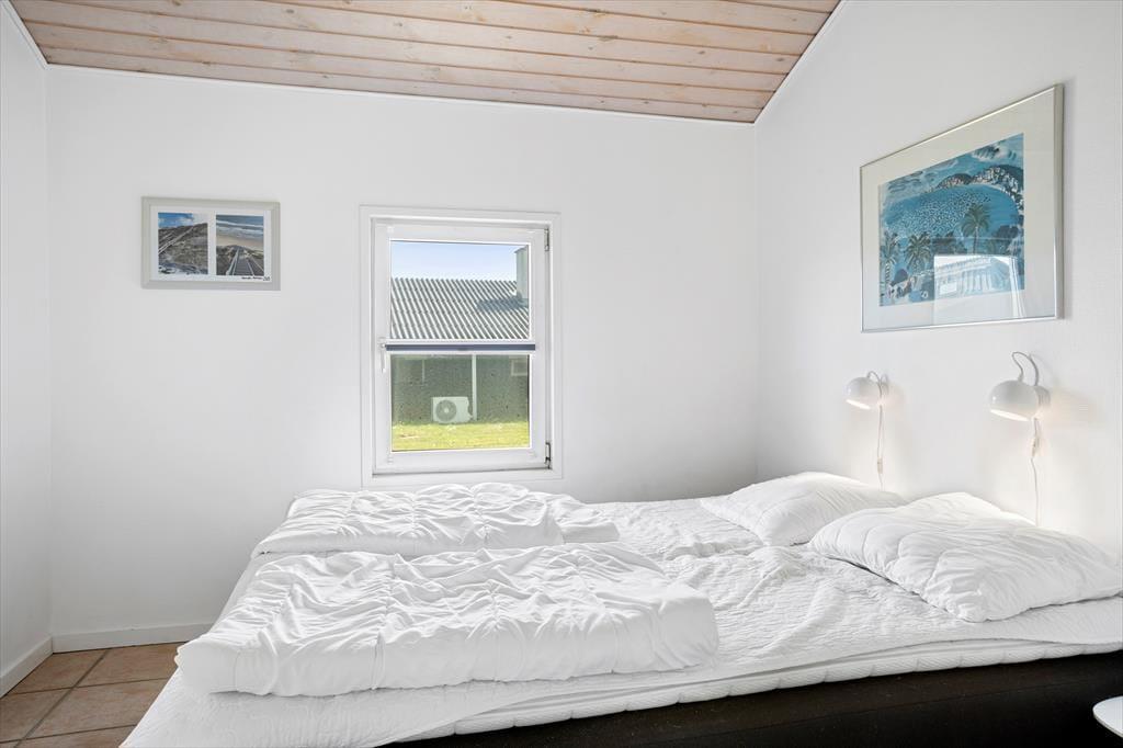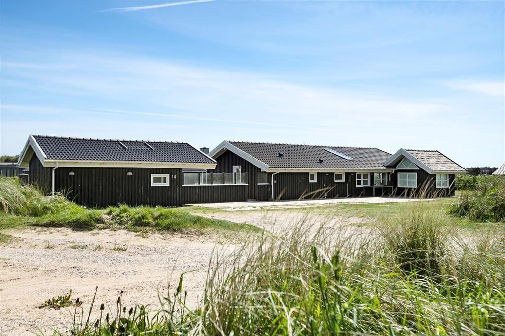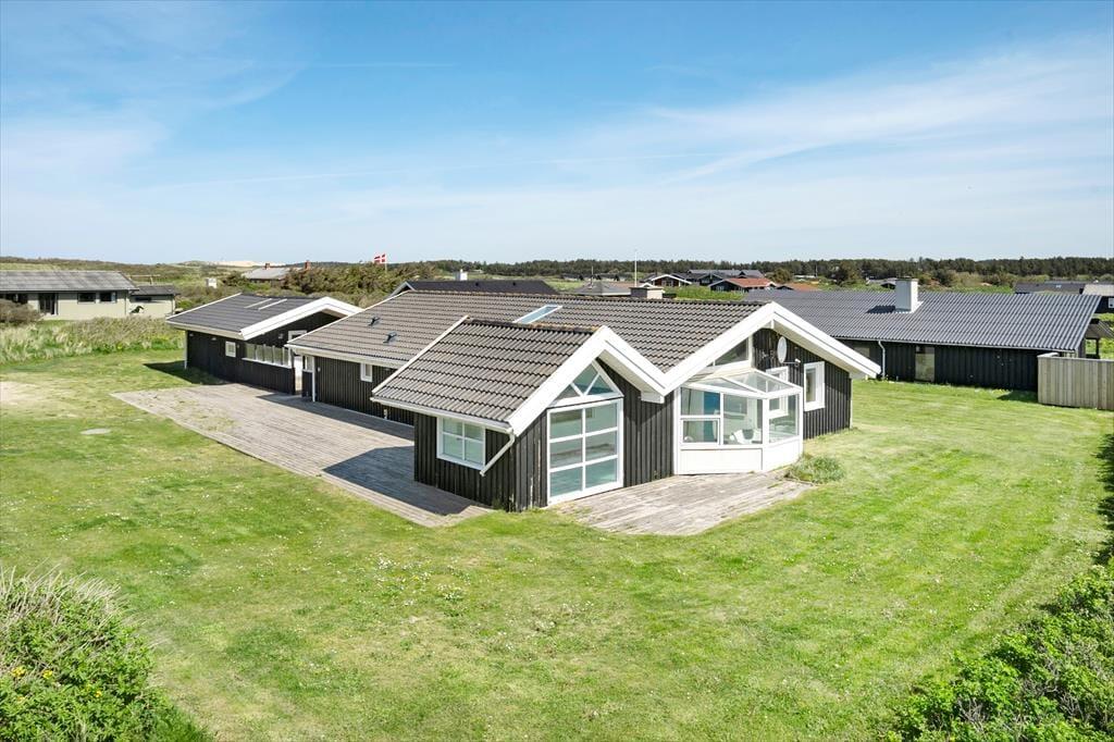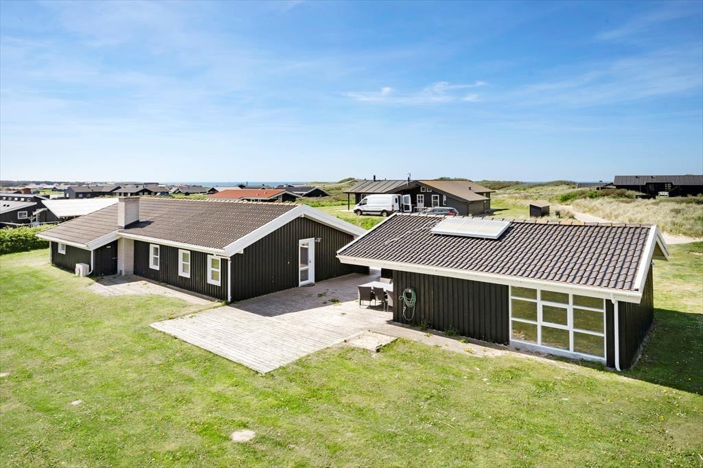 Rundt om sommerhuset breder en stor og skøn træterrasse sig, og her er der rig mulighed for at finde et dejligt læsted i sol eller skygge. Du og familien kan frit finde roen til fordybelse eller leg, og sammen kan I nyde de lyse sommeraftener efter en dejlig dag med oplevelser – og hvis I ikke har fået nok af Vesterhavet, kan I måske endda slutte af med en lille aftentur til kysten, der ligger få minutter væk. På terrassen står der en grill klar, så dæk op til en lækker sommermiddag, mens børnene leger. Rundt om huset breder en god græsplæne sig med masser af plads til leg og andre aktiviteter.