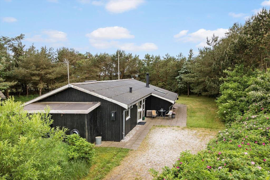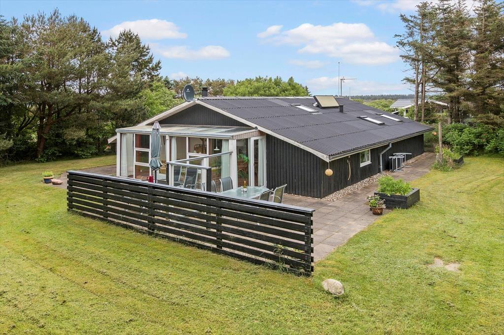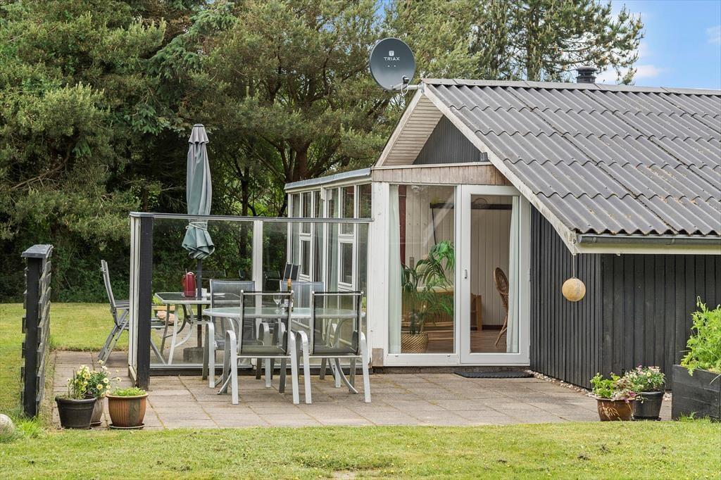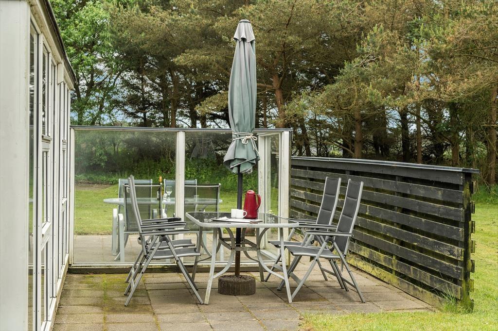 Et flisebelagt terrassemiljø breder sig hele vejen rundt om sommerhuset, så du har mange gode solkroge og opholdspladser med læ at vælge imellem. Der er havemøbler, liggestole og en parasol til rådighed, og hvis du får lyst til at lave et rigtigt sommerligt aftensmåltid, kan du tænde op i grillen og lade duften af kul og frisktilberedte lækkerier sprede sig. Græsplænen kan fint fungere som underlag for en omgang vikingespil eller andre havelege, mens randbeplantningens hybenbuske og fyrretræer sørger for at skærme udearealerne godt af, så I kan lege, solbade og slappe af på ugeneret vis.