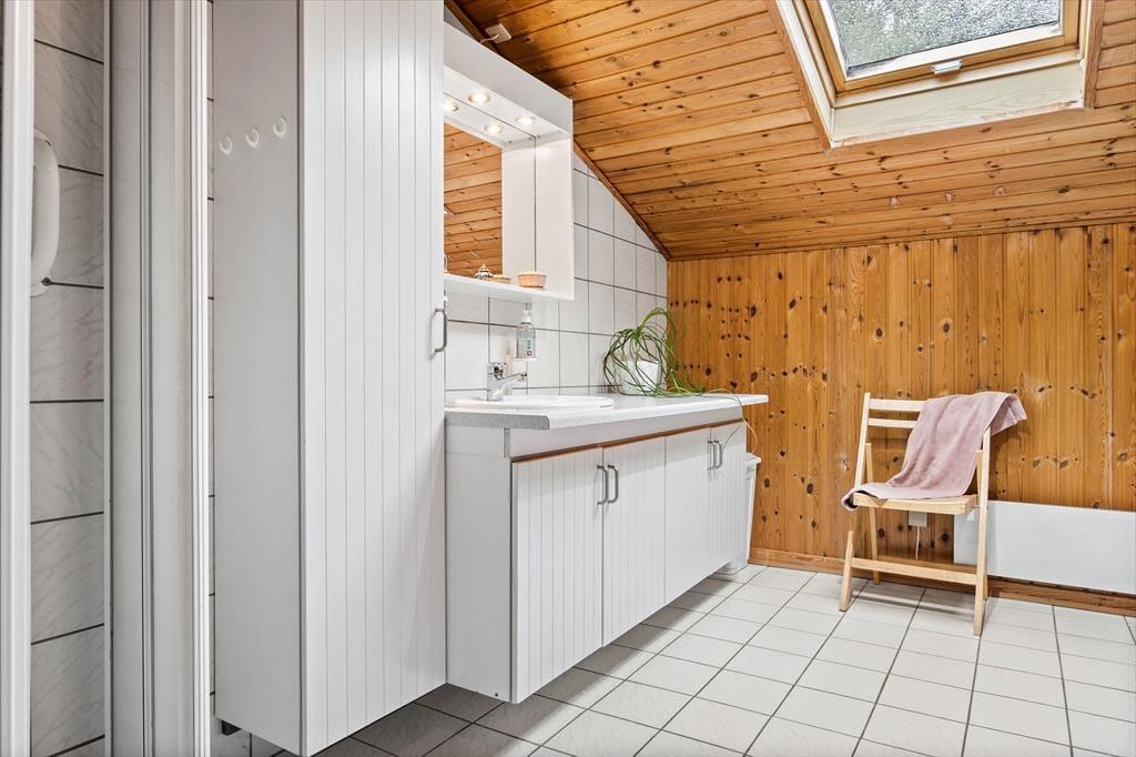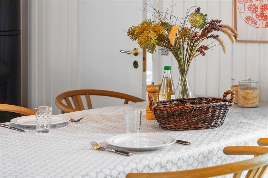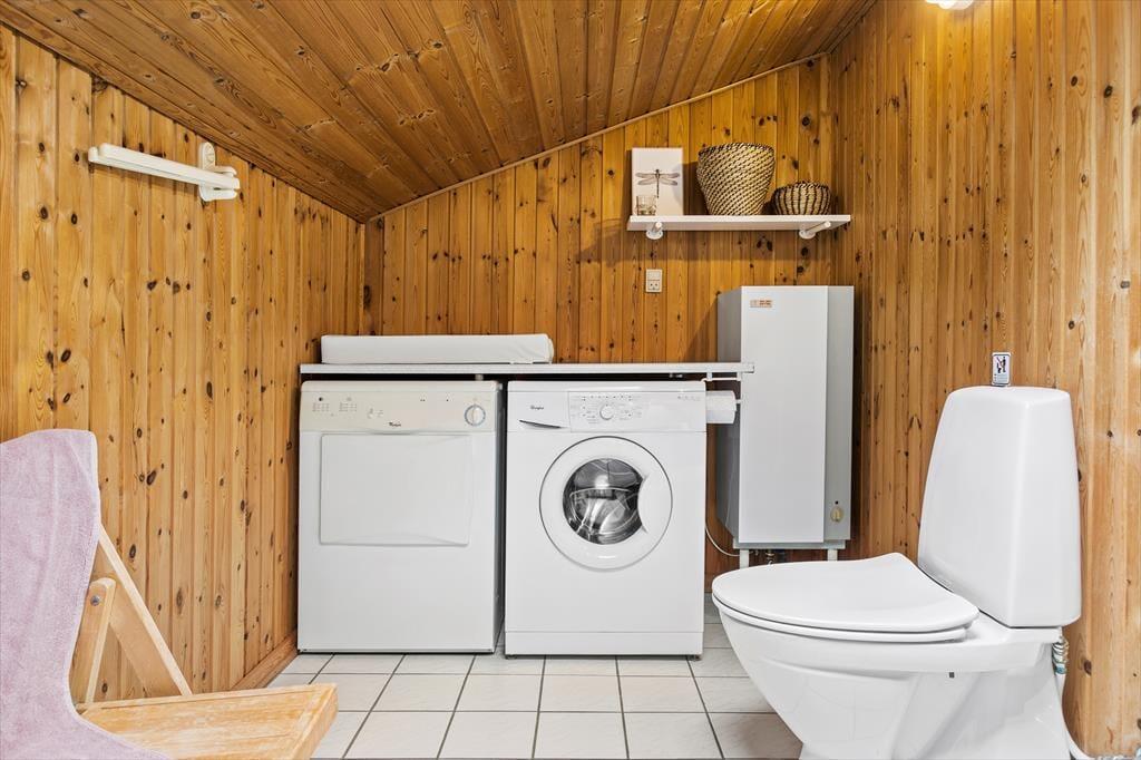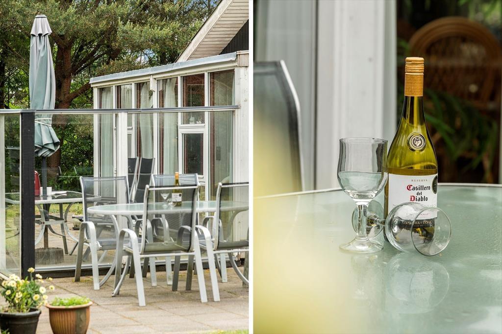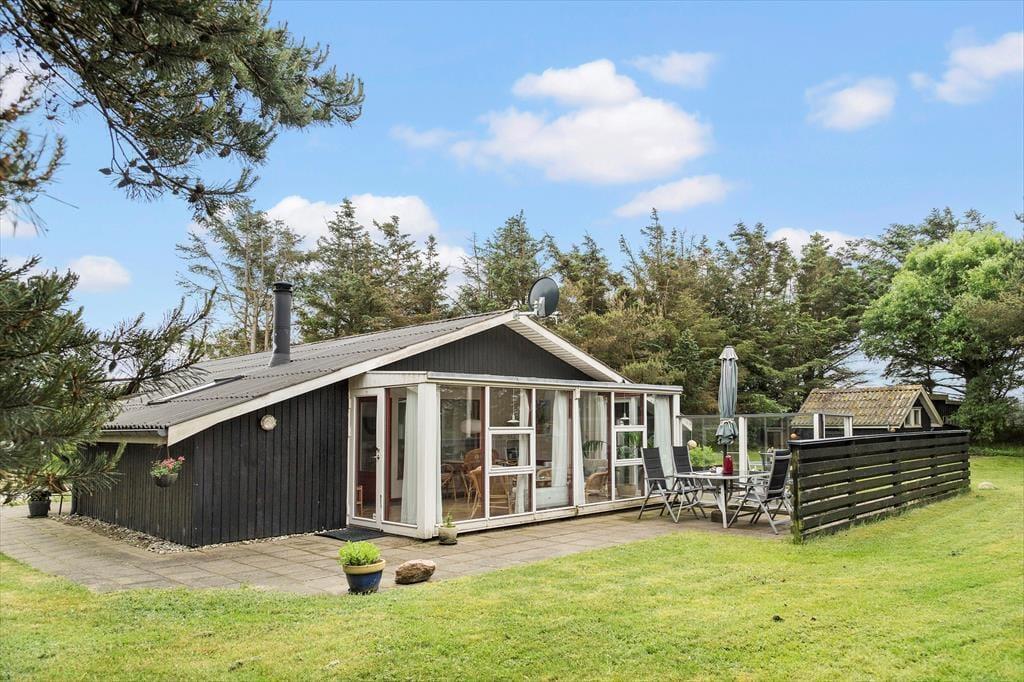 Et flisebelagt terrassemiljø breder sig hele vejen rundt om sommerhuset, så du har mange gode solkroge og opholdspladser med læ at vælge imellem. Der er havemøbler, liggestole og en parasol til rådighed, og hvis du får lyst til at lave et rigtigt sommerligt aftensmåltid, kan du tænde op i grillen og lade duften af kul og frisktilberedte lækkerier sprede sig. Græsplænen kan fint fungere som underlag for en omgang vikingespil eller andre havelege, mens randbeplantningens hybenbuske og fyrretræer sørger for at skærme udearealerne godt af, så I kan lege, solbade og slappe af på ugeneret vis.
