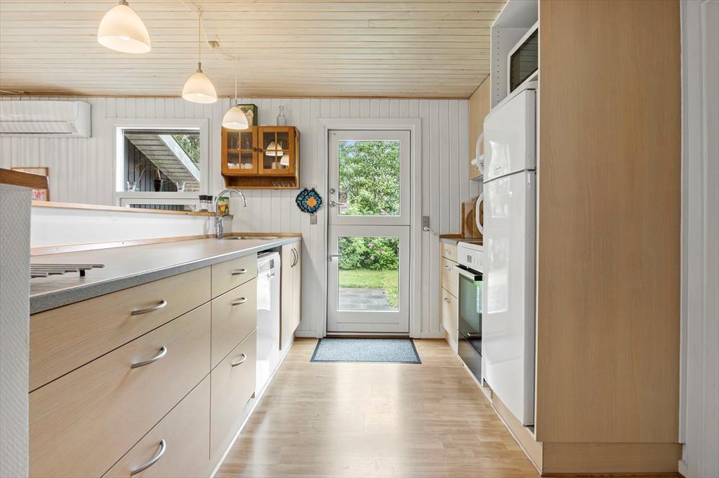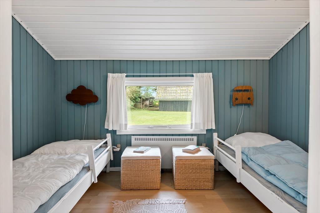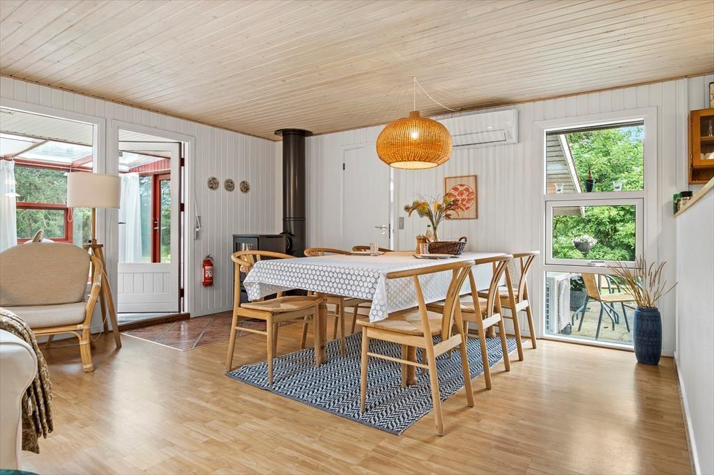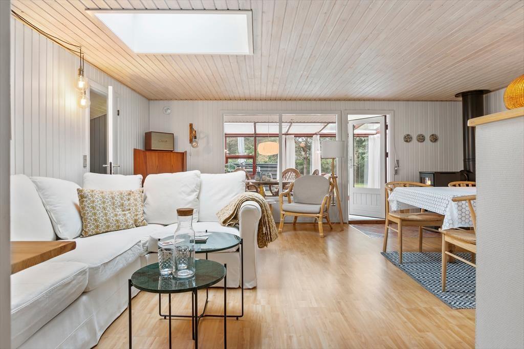 Det velholdte sommerhus er opført i 1984, så det har efterhånden ligget her på den lukkede vej i en del årtier – og det er sikkert medvirkende til, at hyggestemningen og følelsen af ro er i top både inde og ude. I stuen er der brændeovn, et stort fladskærms-tv og åben forbindelse til køkkenet, og en glasdør giver dig adgang til en dejlig udestue, når du og dine kære gerne vil føle jer endnu mere forbundne til den grønne grund. Soveværelser er der fire af, og de ligger godt fordelt i huset, så I alle kan sove både godt og længe.