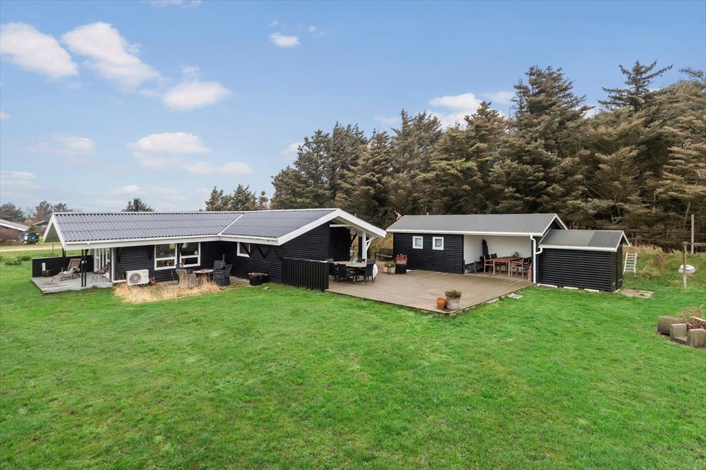 Udenfor er der flere skønne terrasser, hvor du kan nyde den friske luft og de solrige dage. Den overdækkede terrasse giver mulighed for at sidde og hygge sig, selv når vejret ikke er helt med på noterne. De store solrige terrasser er perfekte til både afslapning på en liggestol og til hyggelige måltider med familie og venner. Den private og ugenerte have giver plads til leg og afslapning, og her kan du virkelig komme ned i gear.