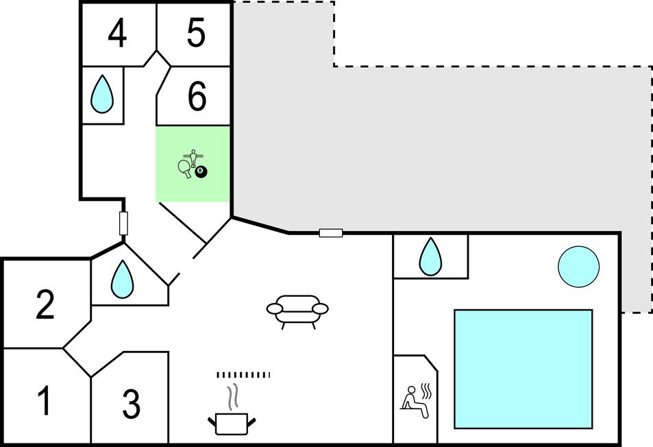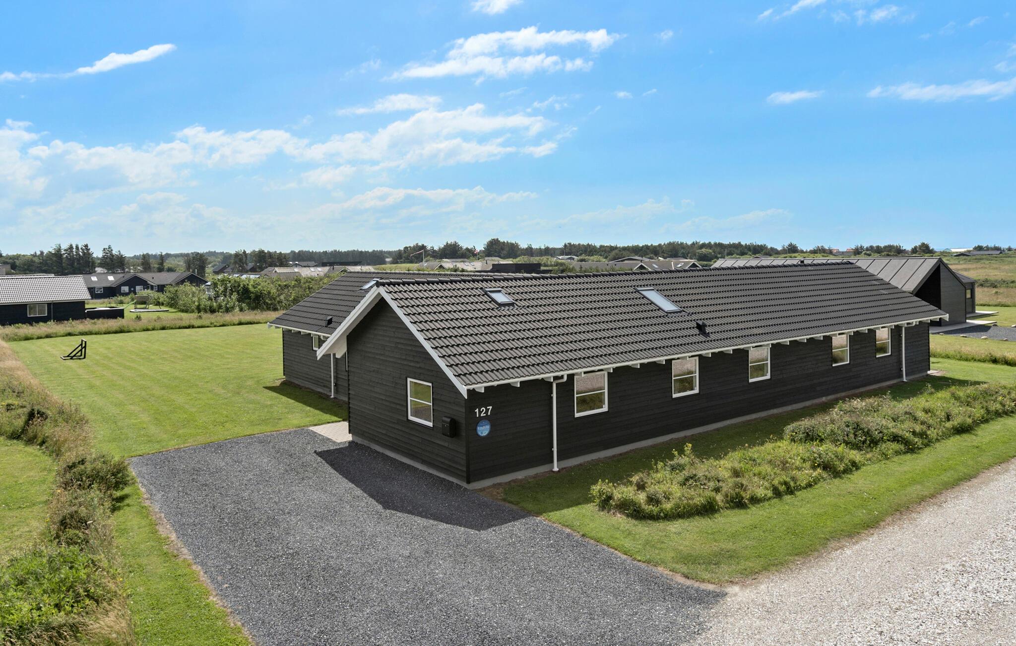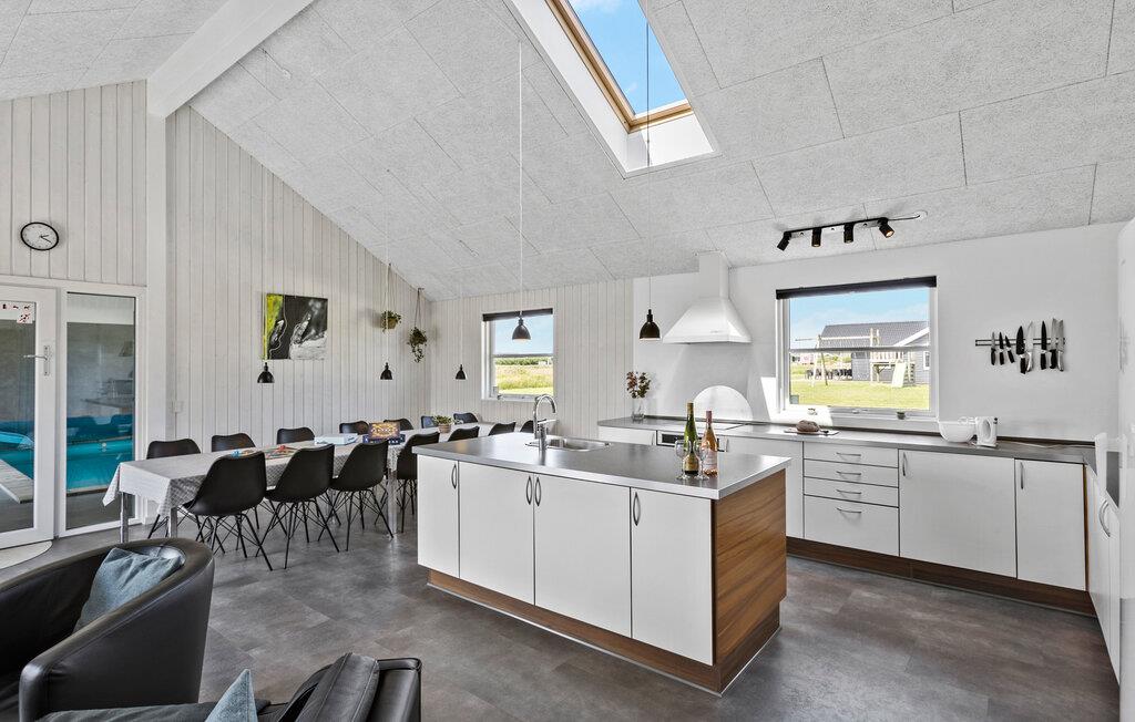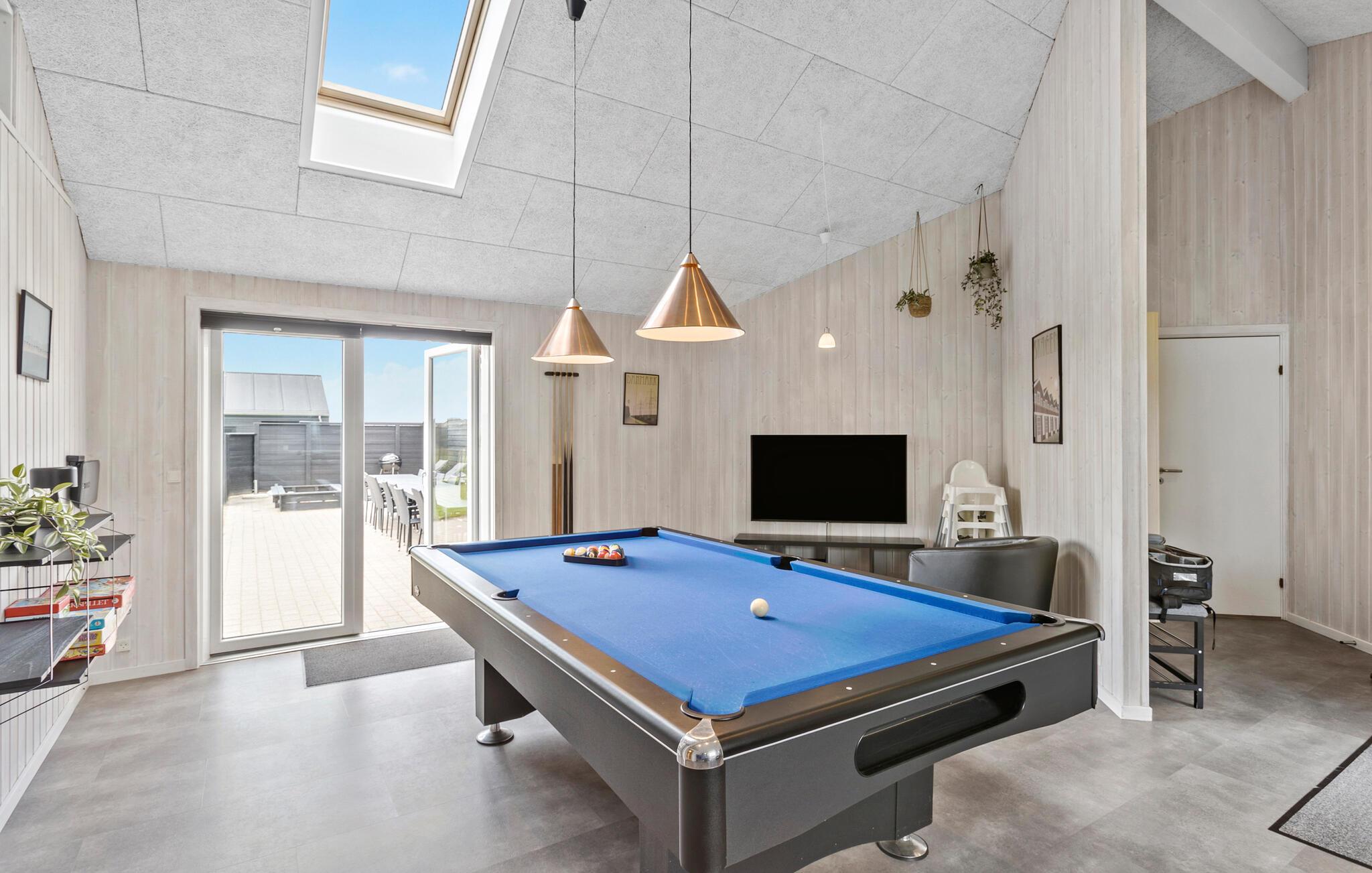 Dette skønne feriehus er særdeles godt indrettet til at opfylde den store families behov for at holde ferie sammen, hver for sig. Huset har således to afsnit med soveværelser og bad og to afdelinger med aktivitets muligheder, enten det dejlige poolområde hvor der kan bades eller slappes af i det skønne store 4 personers spabad, eller aktivitets rummet hvor der er flere spændende aktiviterter for den legesyge feriegæst. Udenfor er der en dejlig stor terrasse og en stor åben plæne med mulighed for både boldspil og afslapning. Huset ligger mellem kystbyerne Løkken og Lønstrup, så der er fine muligheder for at lave en god handel, eller nyde et veltilberedt måltid mad i en af byernes mange butikker og restauranter.