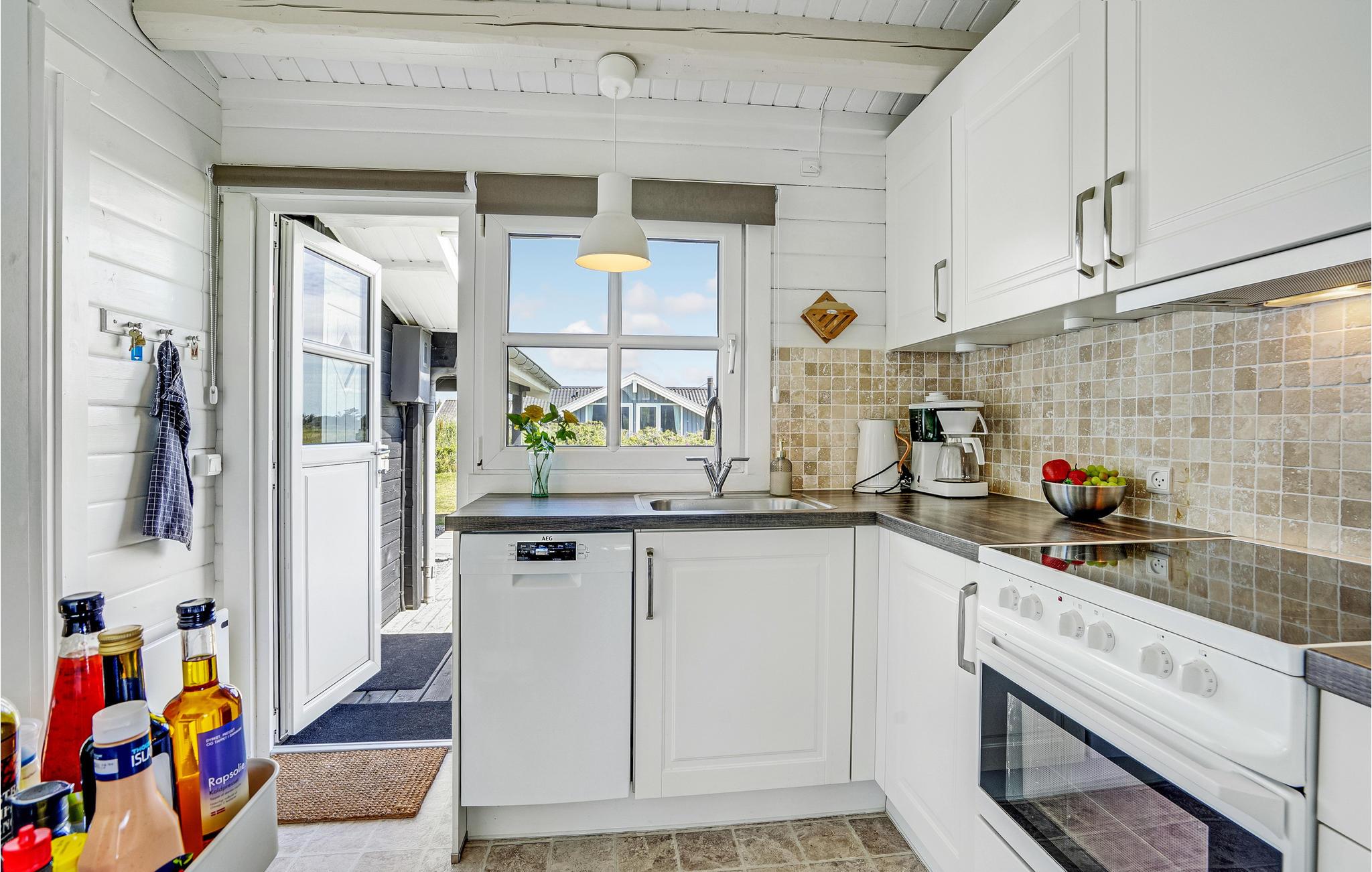 Der er udsigt til åbne arealer og det altid betagende Vesterhav fra dette velholdte bjælkehus, der er lyst og hyggeligt møbleret. Nyd livet på terrassen der er afskærmet af huset på to sider, så her er dejligt læ. Sid under den overdækkede del også længe efter duggen og mørket er faldet er faldet. Til børnene er der gynge og sandkasse til mange timers leg og god plads til boldspil og andre sjove udendørs aktiviteter. Løkken er en af de mest klassiske badebyer ved vestkysten, med sine hvide badehuset ved den brede sandstrand, hvor I kan køre helt ud til vandet. Her er fiskerbåde hvor I kan købe pivfrisk fisk, de karakteristiske bunkere og en frisk vind, som både windsurfere, paraglidere og jer der vil sætte en drage op, sætter pris på.