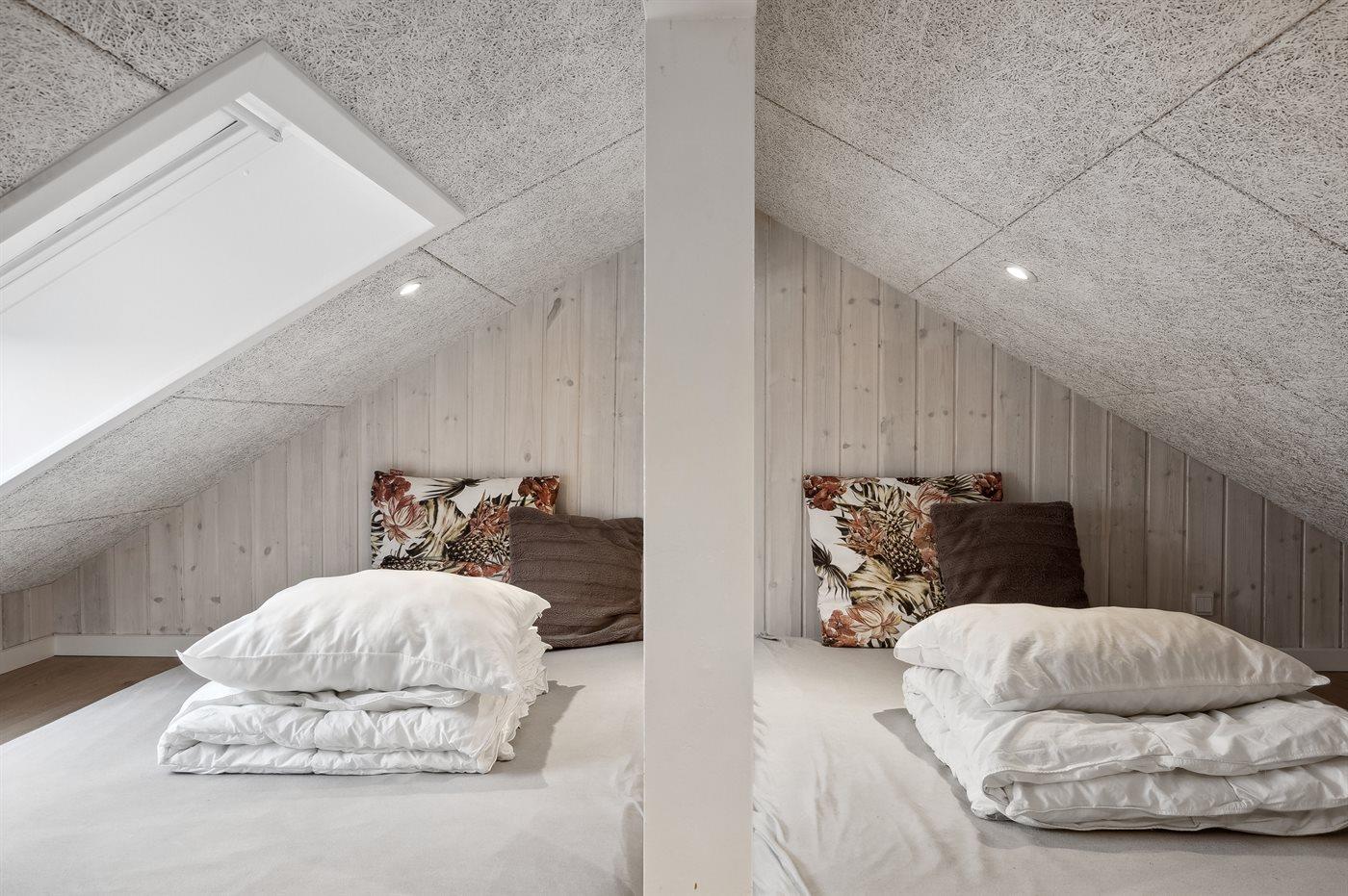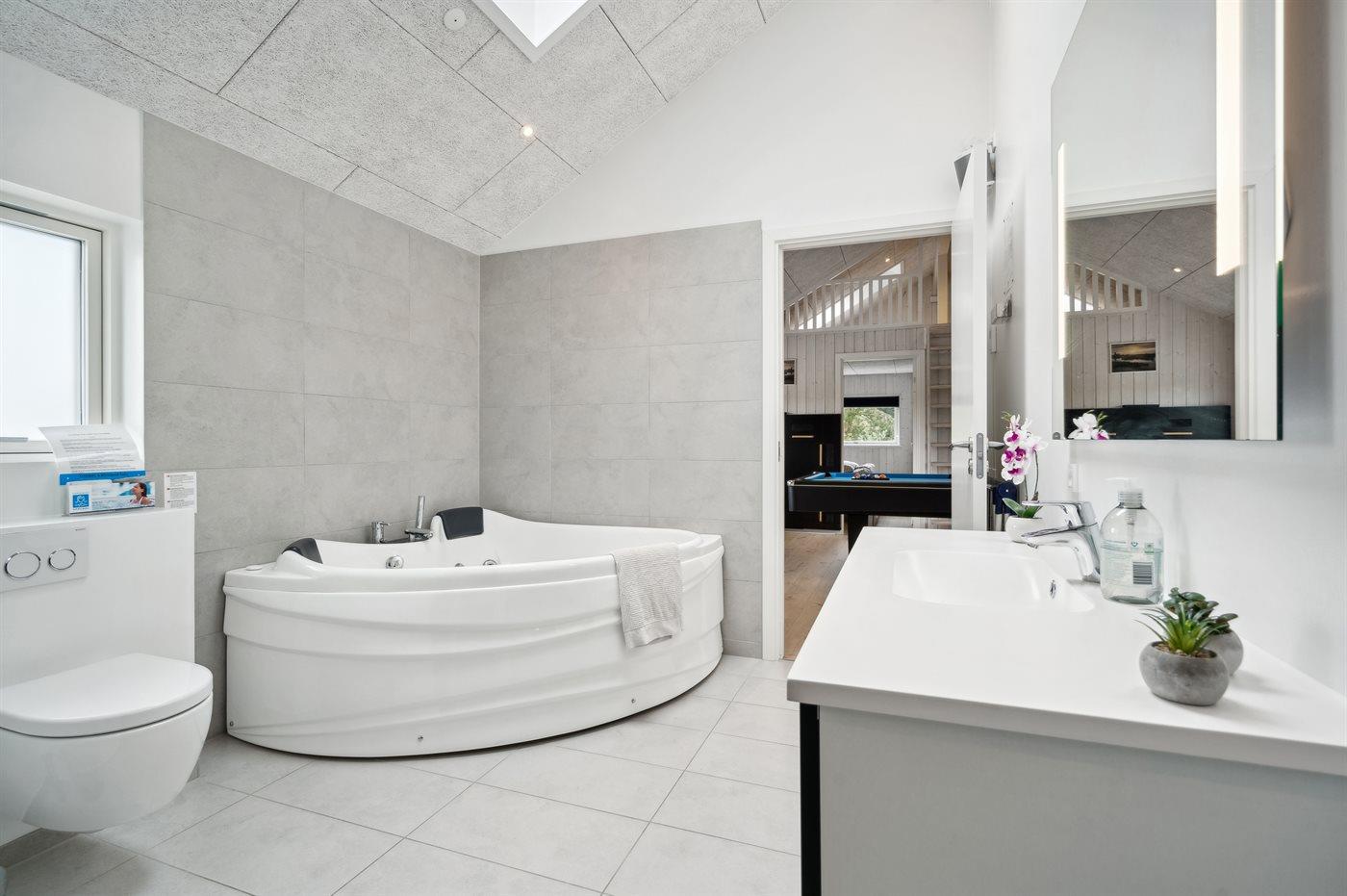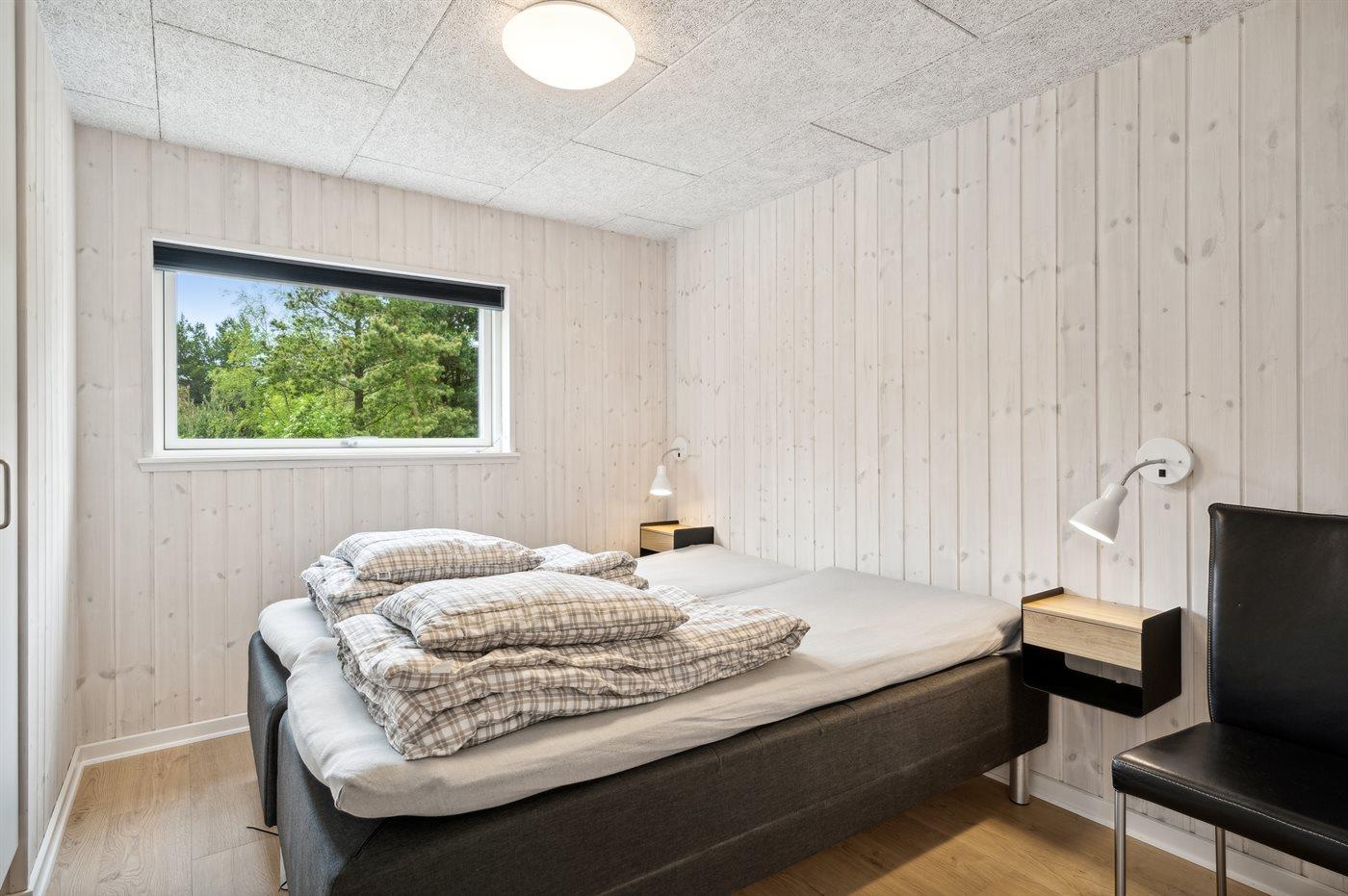 Sommerhuset har fire store soveværelser med rigelig skabsplads samt en hems med yderligere to sovepladser. Der er desuden to komplette badeværelser, hvoraf det ene er udstyret med både spabad og sauna. Gulvvarme i hele sommerhuset sørger for økonomisk opvarmning via en luft/vand-varmepumpe. Og selvfølgelig er der både vaskemaskine og tørretumbler til rådighed.