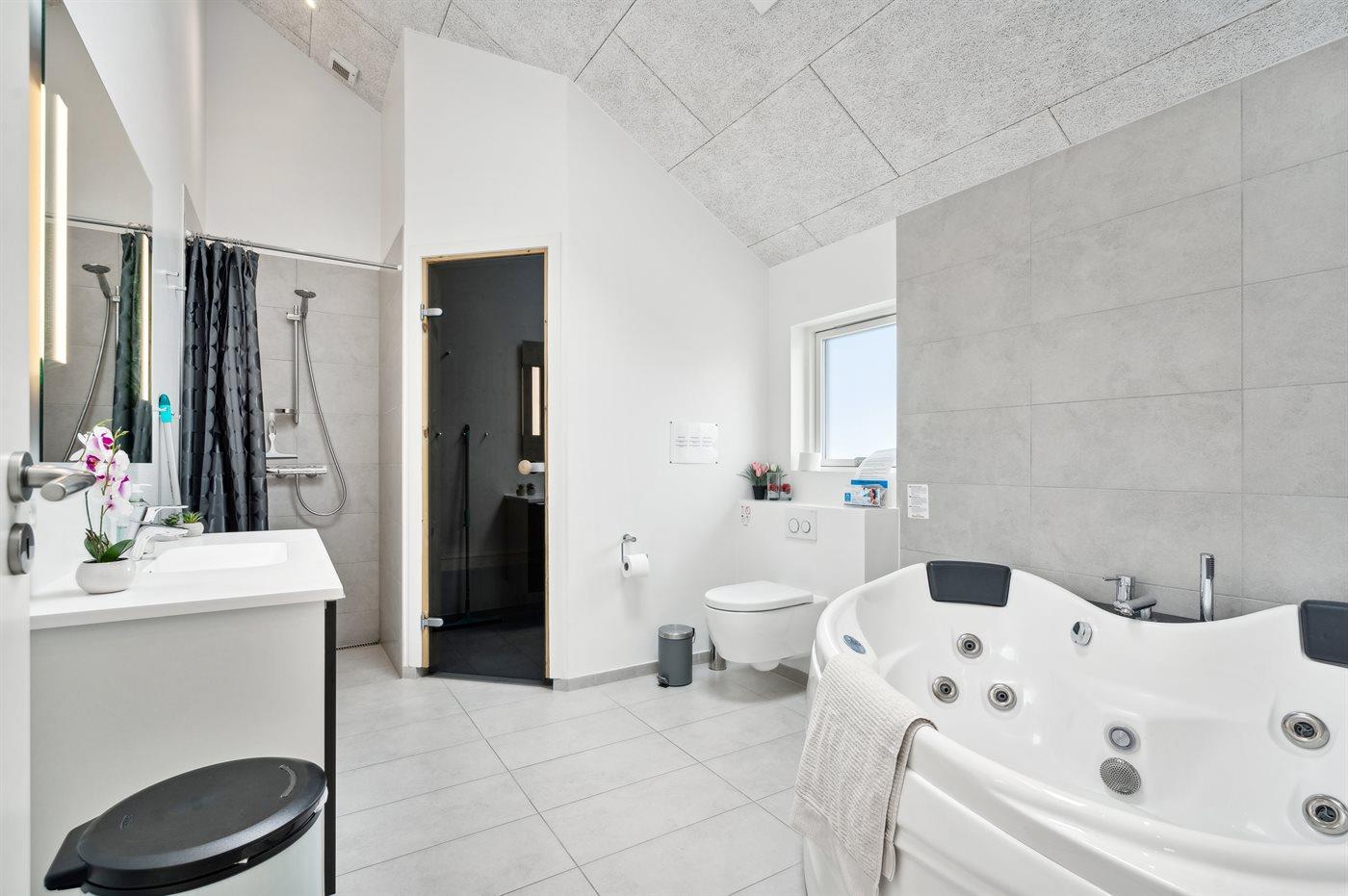 Der er 2 badeværelser med bruseniche og 2 toiletter. Der er gulvvarme på 2 badeværelser. I saunaen er der mulighed for afslapning.