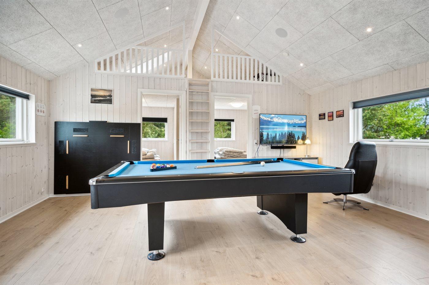 Dette sommerhus er opført med de bedste materialer og har et stort, lyst køkken/alrum, hvor der er plads til hele familien. Fra opholdsstuen er der direkte adgang til den store flisebelagte terrasse, hvor I finder et rummeligt udendørs spabad. I forlængelse af alrummet er der et aktivitetsrum med billard, bordfodbold og ikke mindst en arkademaskine med flere tusinde spil, hvor I kan hygge jer i mange timer. Der er tv med både danske og tyske kanaler samt internet til rådighed.