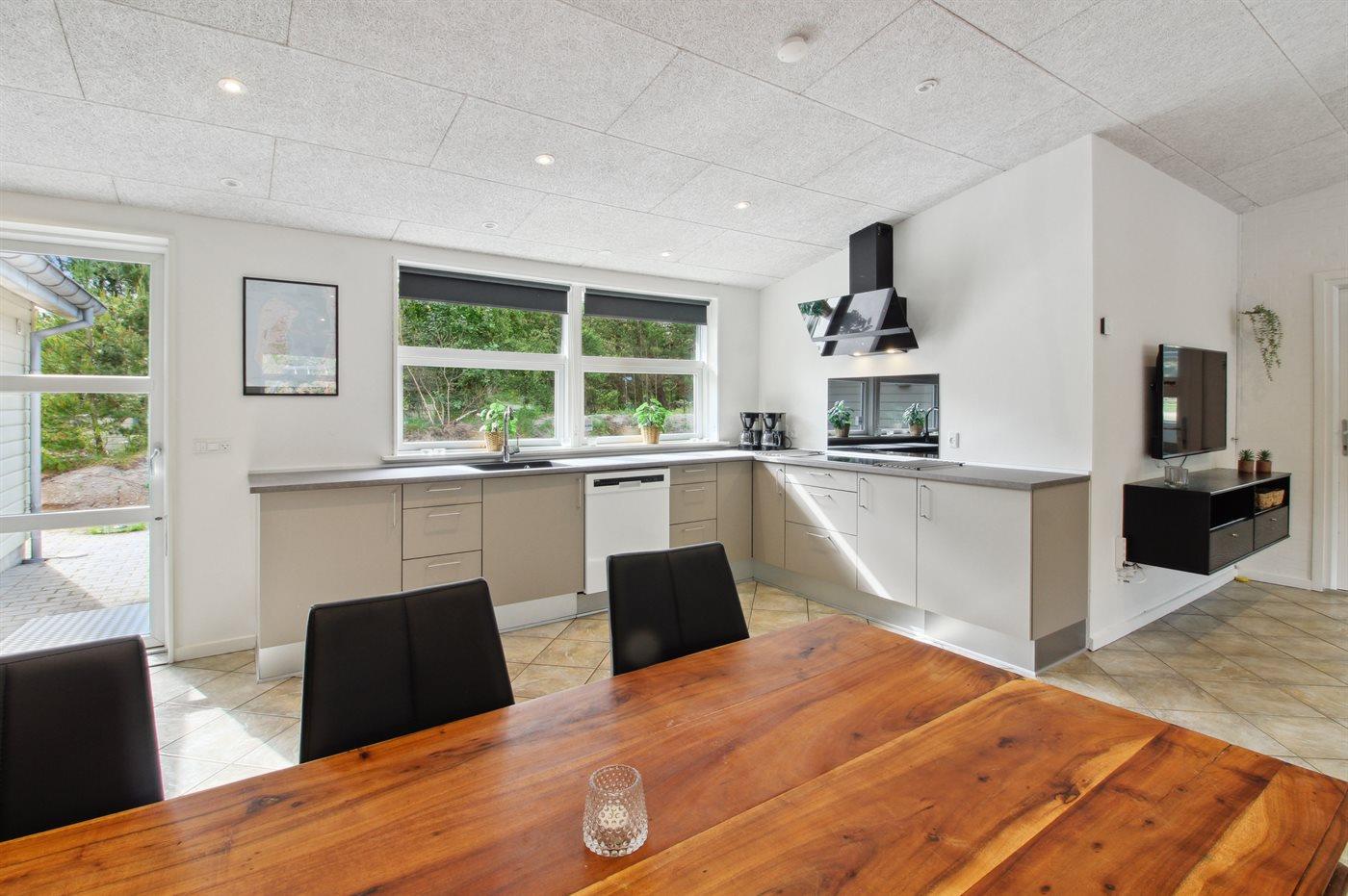Køkkenet er udstyret med 1 køleskab. Der er 4 elkogeplader, bageovn, mikrobølgeovn samt opvaskemaskine.
