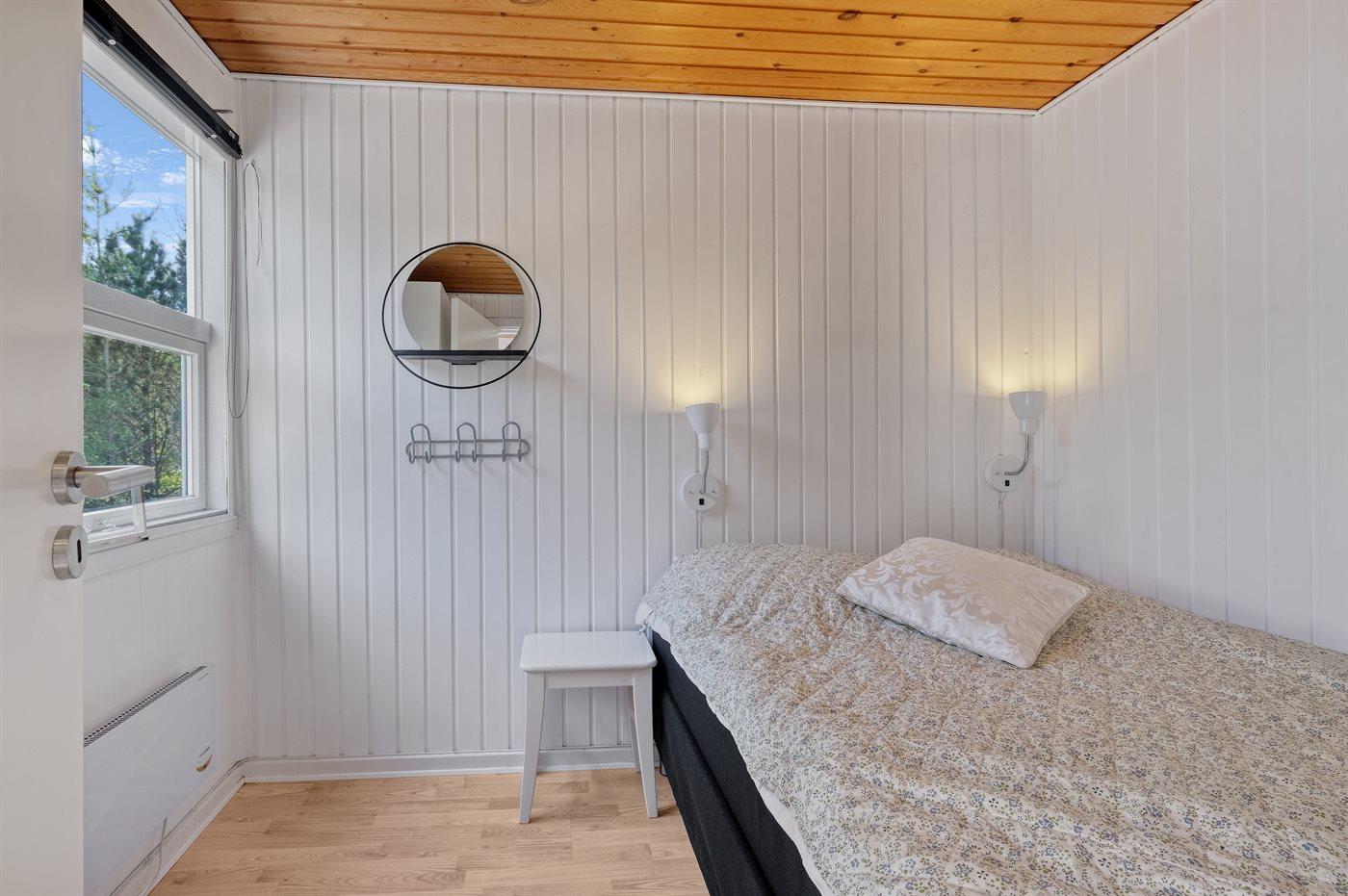 Der er i alt 3 soveværelser. Sovepladserne fordeler sig på: 2 sovepladser i dobbeltseng. 1 soveplads i enkeltseng. 2 sovepladser i køjeseng. Derudover er der 1 stk. barneseng.
