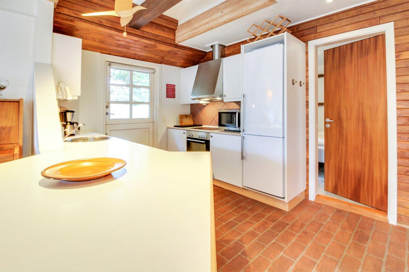Køkkenet er udstyret med 1 køleskab. Der er 4 elkogeplader, bageovn, mikrobølgeovn samt opvaskemaskine.