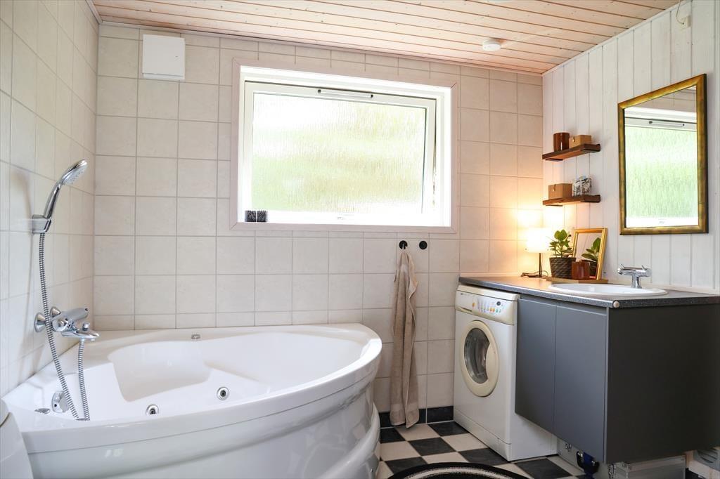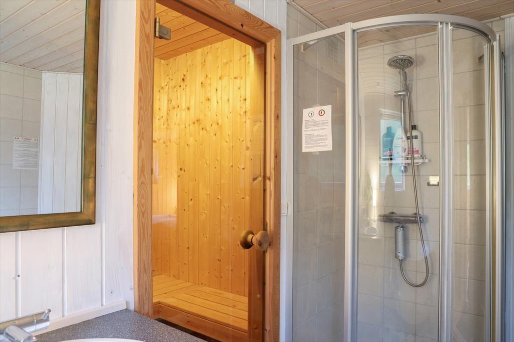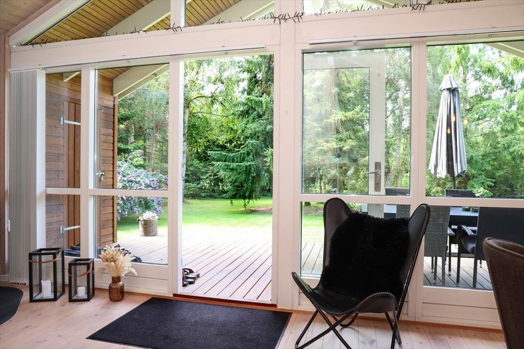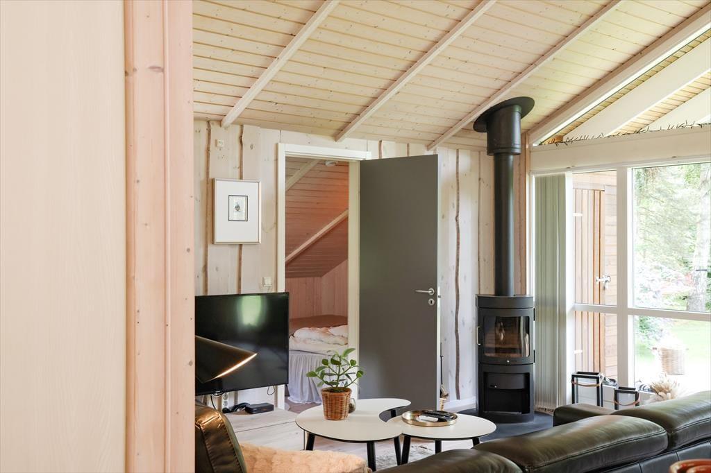 Indendørs fremstår sommerhuset lyst, indbydende og i moderne stil. Der er godt lysindfald i huset fra de store vinduer, især i stuen hvor der også er udgang til den store træterrasse. Sommerhusets hjerterum er den store stue, hvor der er åben forbindelse til køkkenet. Det er her alle kan samles om bordet og nyde en lækker brunch inden dagens aktiviteter og samles om aftenen til aftenhygge med brætspil og gode historier. I det dejlige badeværelse er der både spabad og sauna, så her har du virkelig mulighed for at blive forkælet. Sommerhusets rummelighed giver mulighed for at flere generationer mødes til en skøn ferie eller forlænget weekend.