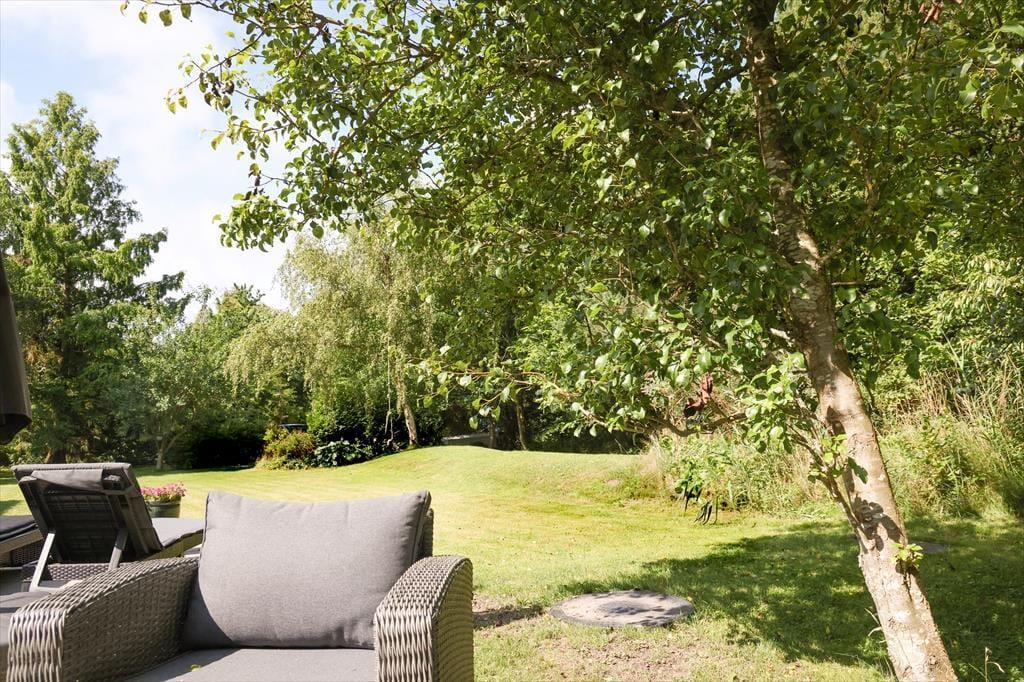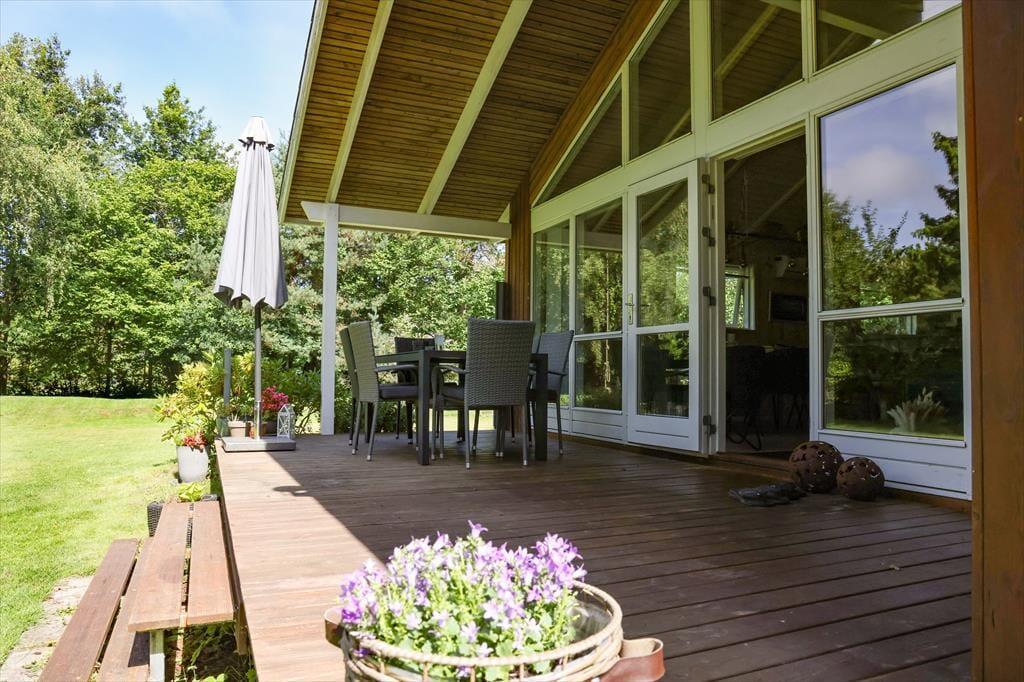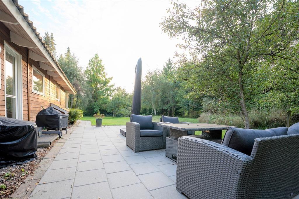 Udendørs kan sommerhusets store træterrasse nydes, her kan du ligge og slikke sol eller nyde en god bog imens børnene boltrer sig i haven med medbragte havespil. Der er på den solrige terrasse plads til, at alle kan samles til en god frokost eller middag om aftenen. Sommerhusets store grund er godt afskærmet så du og familien kan nyde jeres ferie i rolige omgivelser. Husk også at snobrød ved bålstedet sammen med børnene er et sikkert hit.