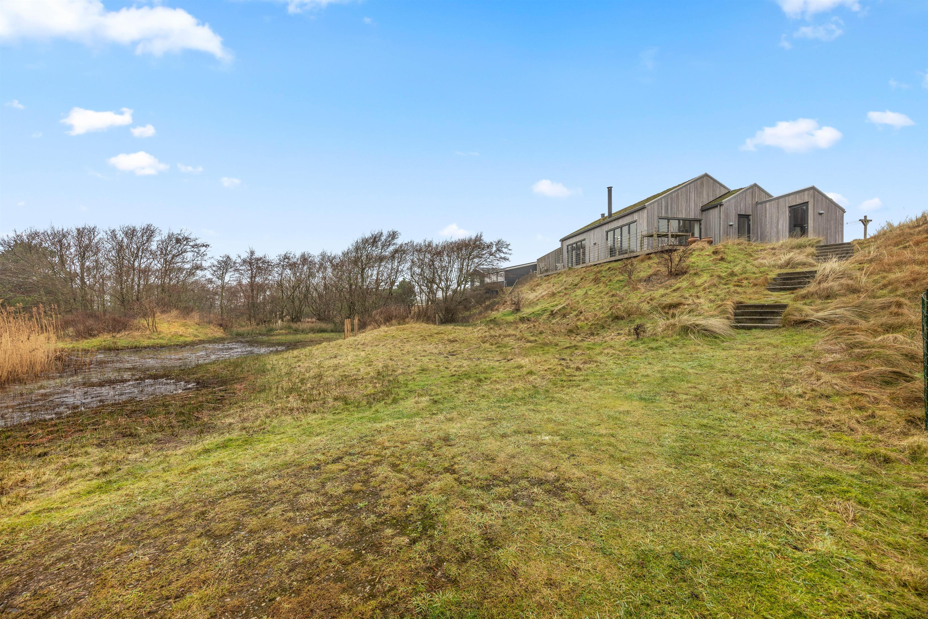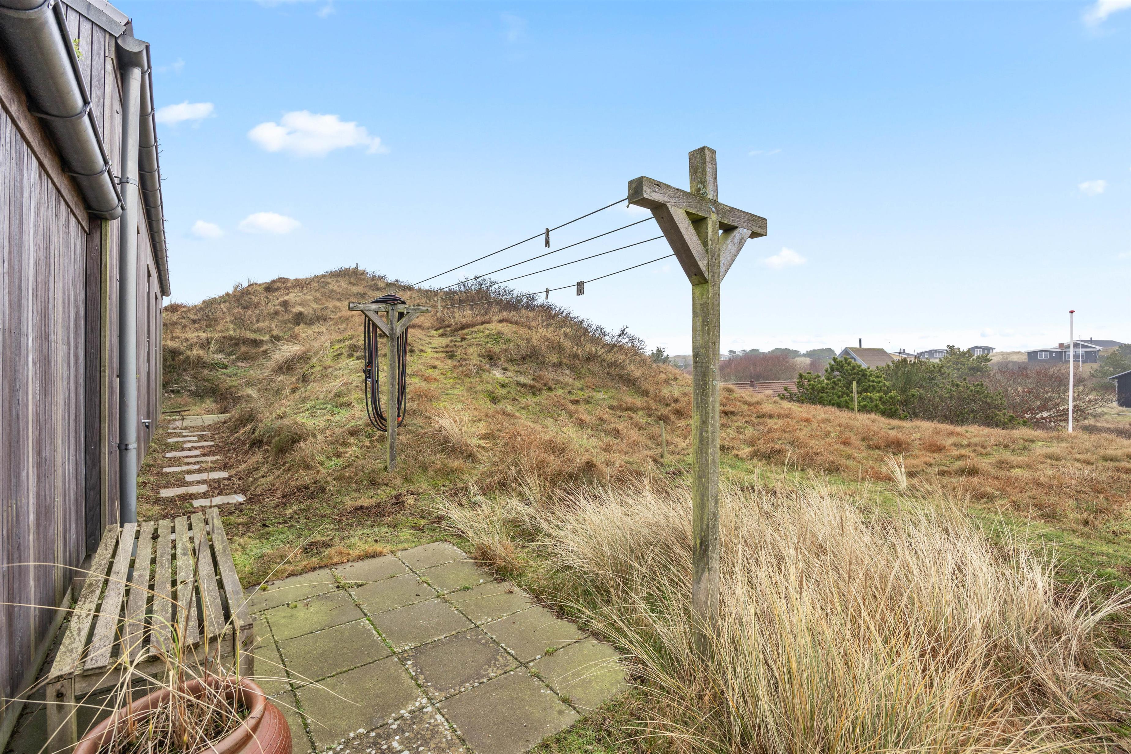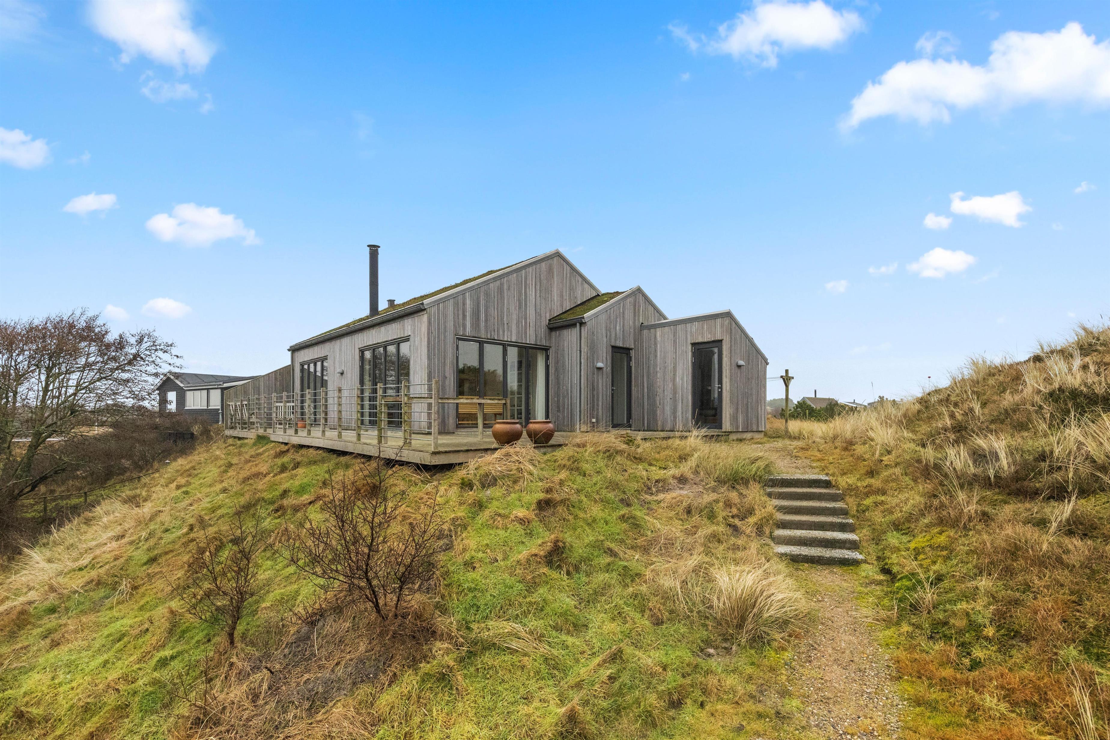 Sommerhuset ligger på en ca. 3.000 m² stor klitgrund, hvorfra I kan nyde en fantastisk panoramaudsigt. Den åbne terrasse med havemøbler og liggestole indbyder til afslapning. Her kan I solbade, holde hyggelige grillaftener eller nyde morgenkaffen i den friske, salte havluft.