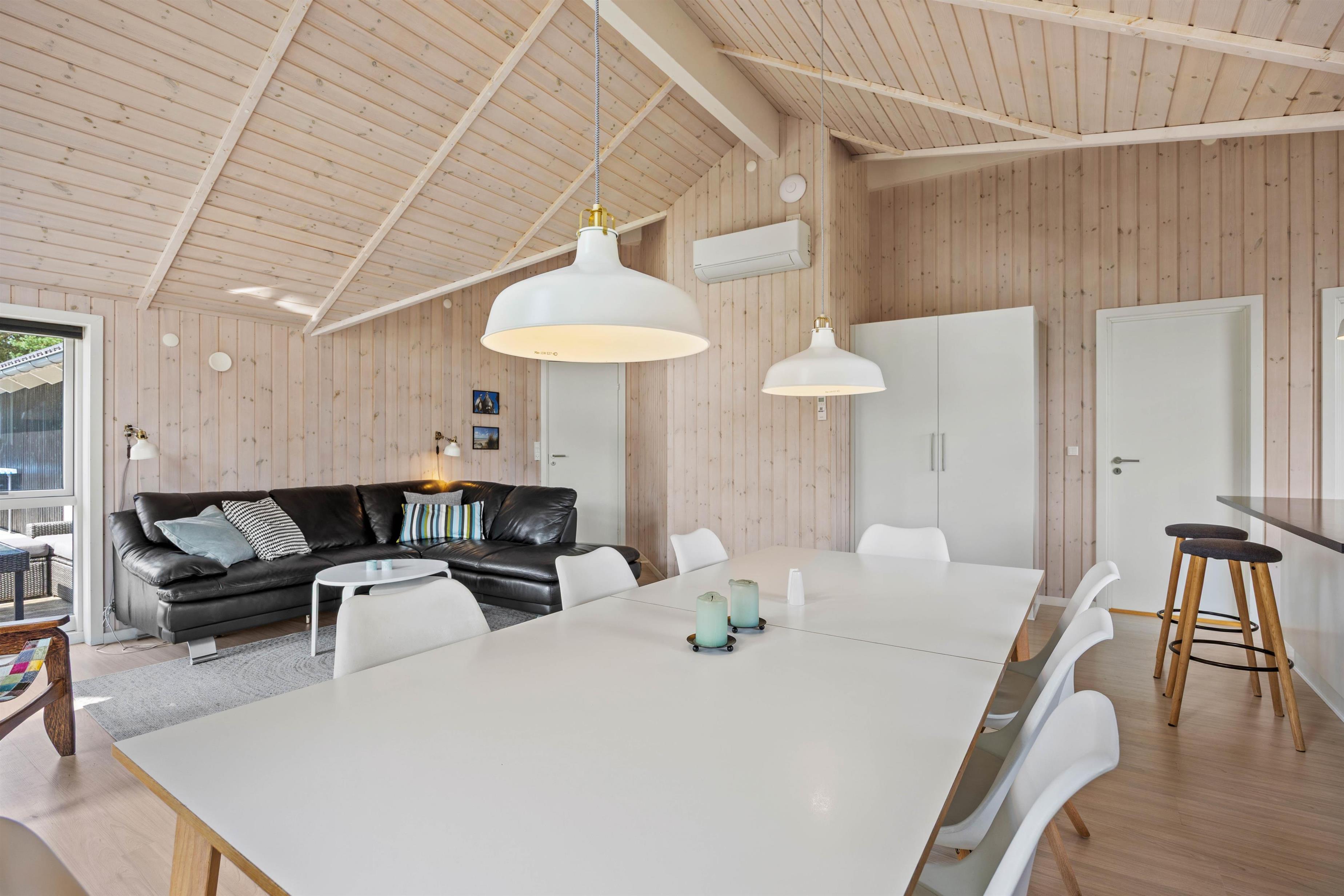 Det åbne opholdsområde udgør hjertet i feriehuset. Her er køkken, spisestue og stue i åbent plan og skaber en lys og indbydende atmosfære. Mens I laver mad sammen, kan I samtidig snakke, spille eller slappe af. Den hyggelige brændeovn sørger for en behagelig varme på kølige dage, mens den moderne varmepumpe sikrer et behageligt indeklima hele året. Den åbne indretning skaber en rummelig fornemmelse, der gør jeres ophold ekstra behageligt.