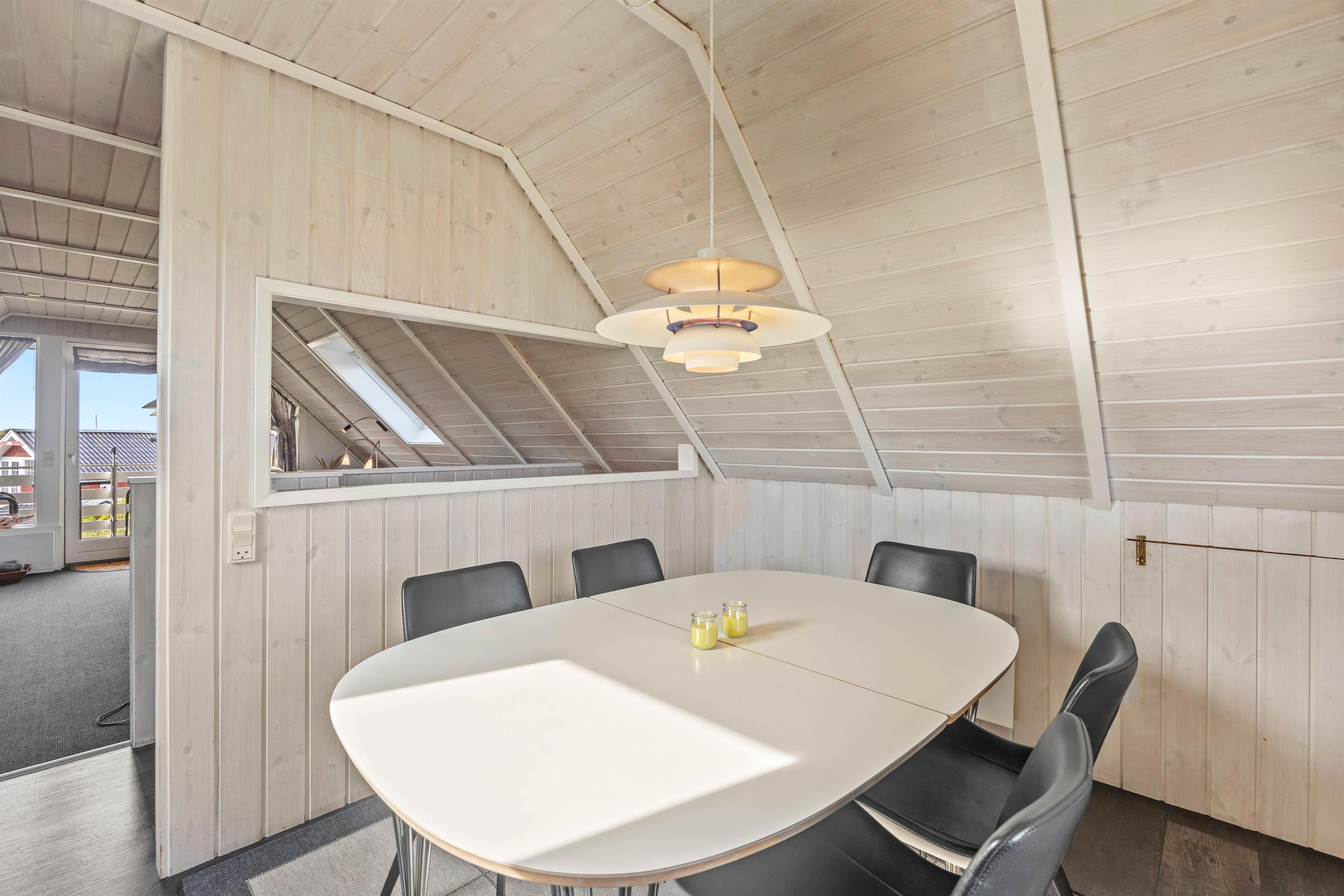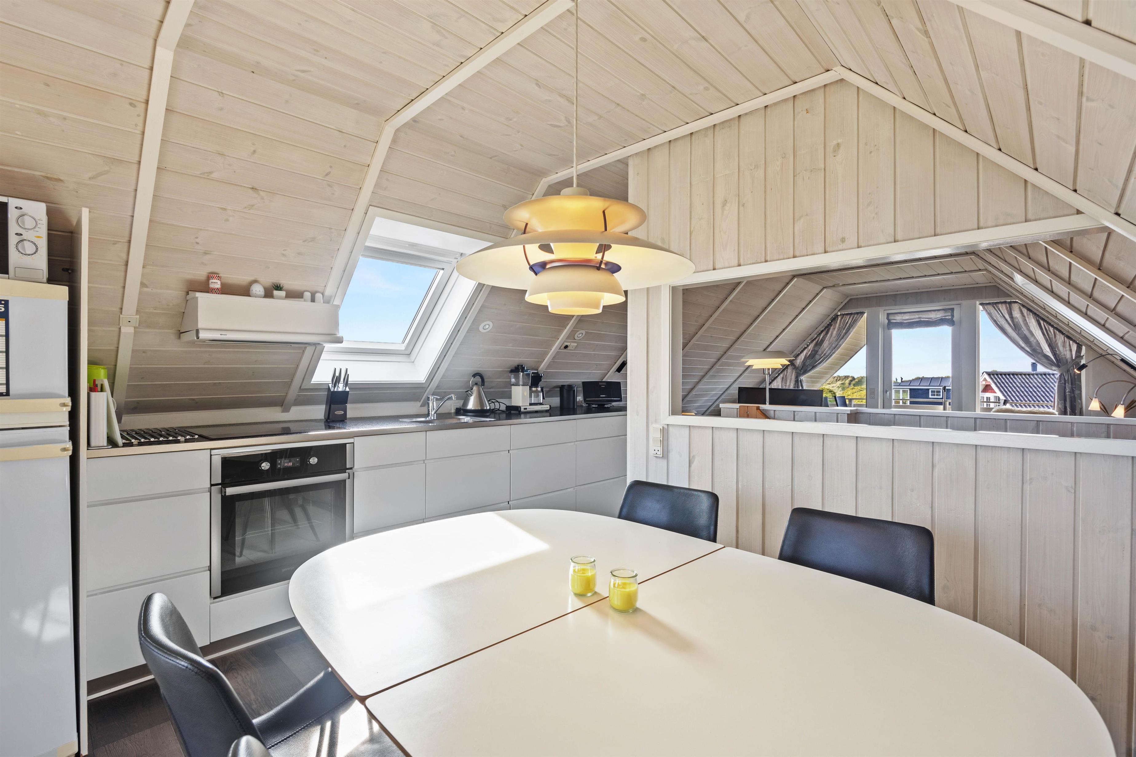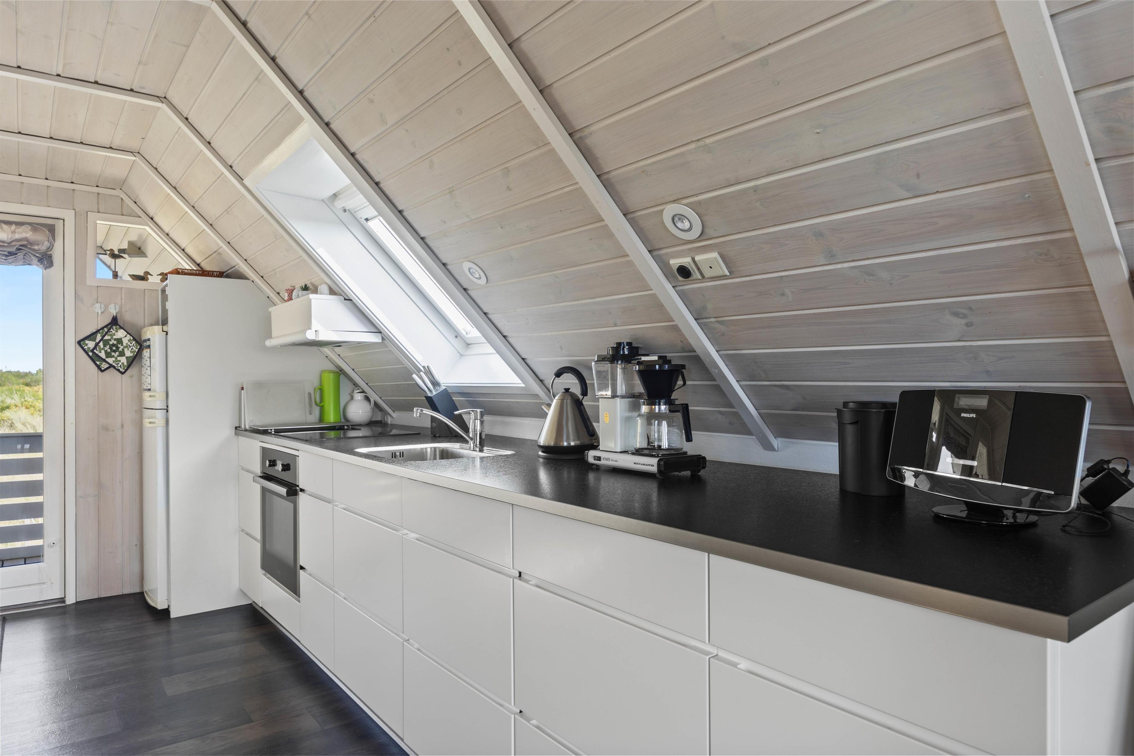 Sommerhusets hjerte, alrummet, finder I på førstesalen. Her ligger køkken, stue og spiseplan i åben forbindelse, så I virkelig kan nyde hinandens selskab, når I er i alrummet. Den hyggelige feriestemning i alrummet bliver fuldendt af brændeovnens knitren i baggrunden.