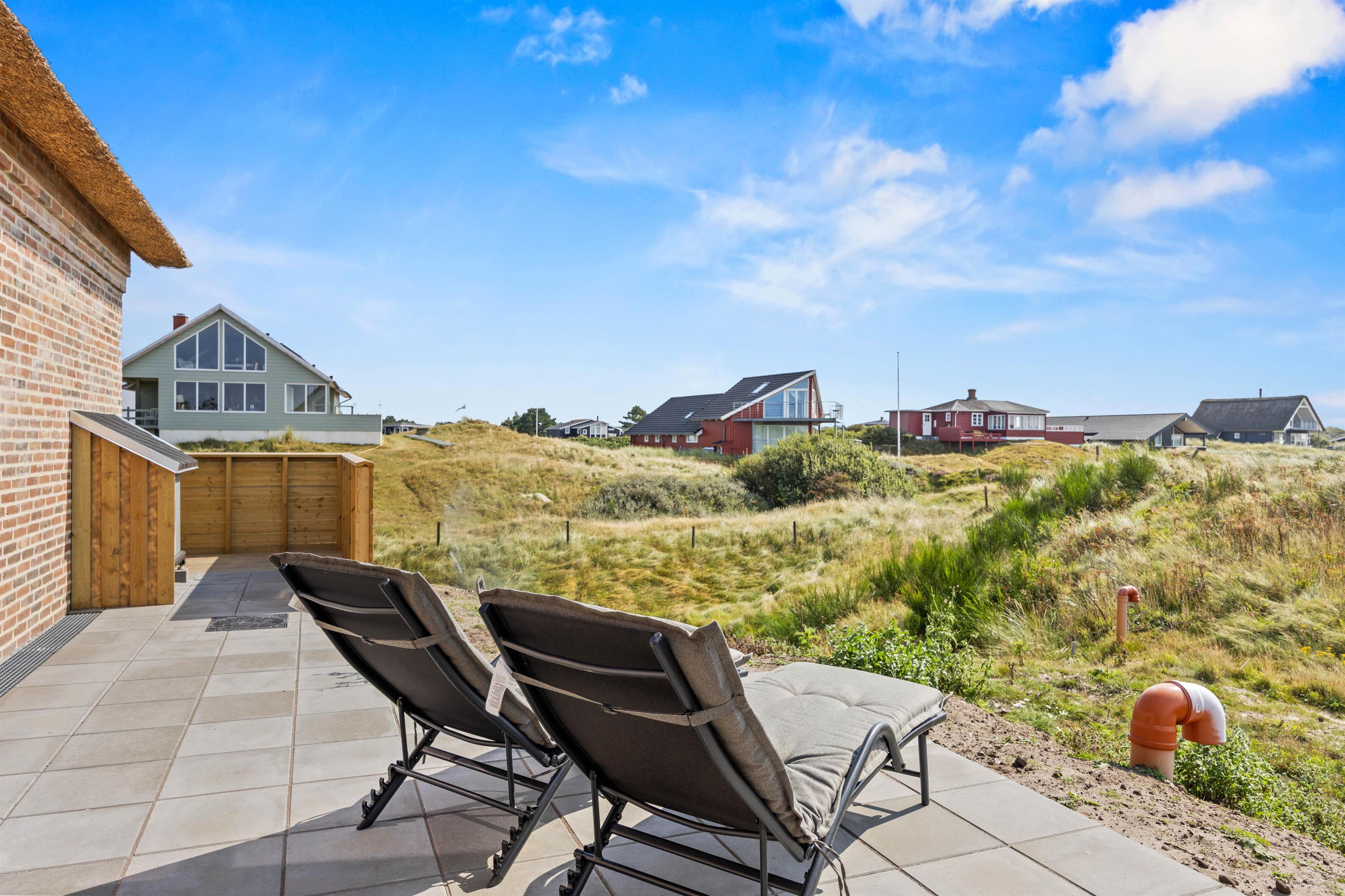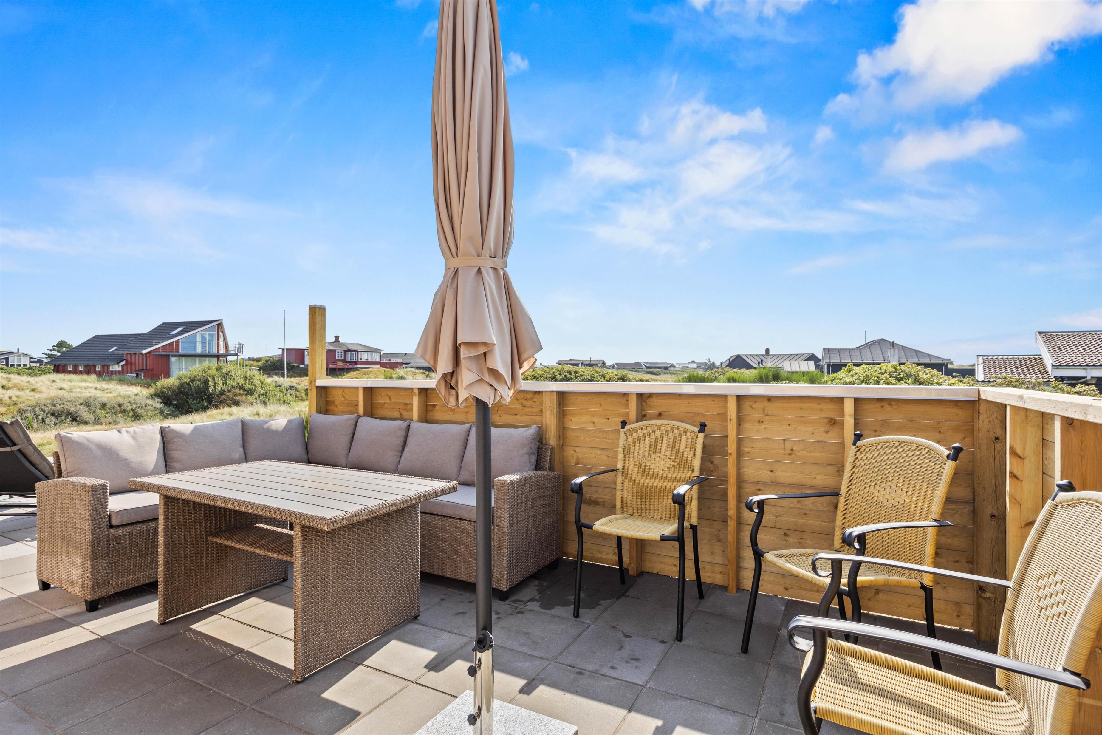 Rundt om feriehuset indbyder den åbne terrasse med havemøbler og liggestole til afslapning i den friske havluft. Her kan I nyde solen, mens jeres hund finder sit eget hjørne på grunden. På blot 200 meter står I med fødderne i sandet på den brede strand i Rindby, hvor der er rig mulighed for gåture, badeture og skønne timer ved havet.