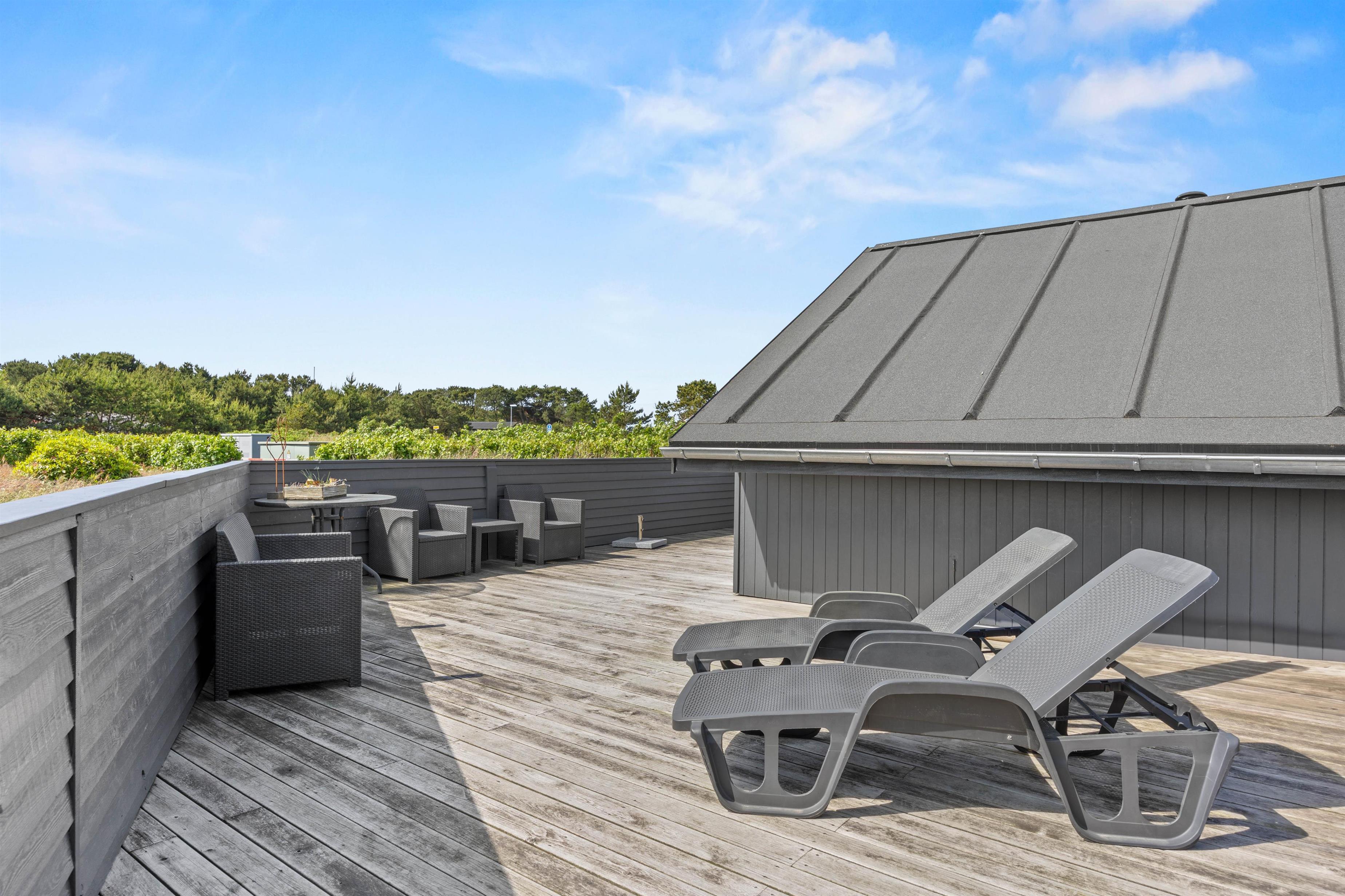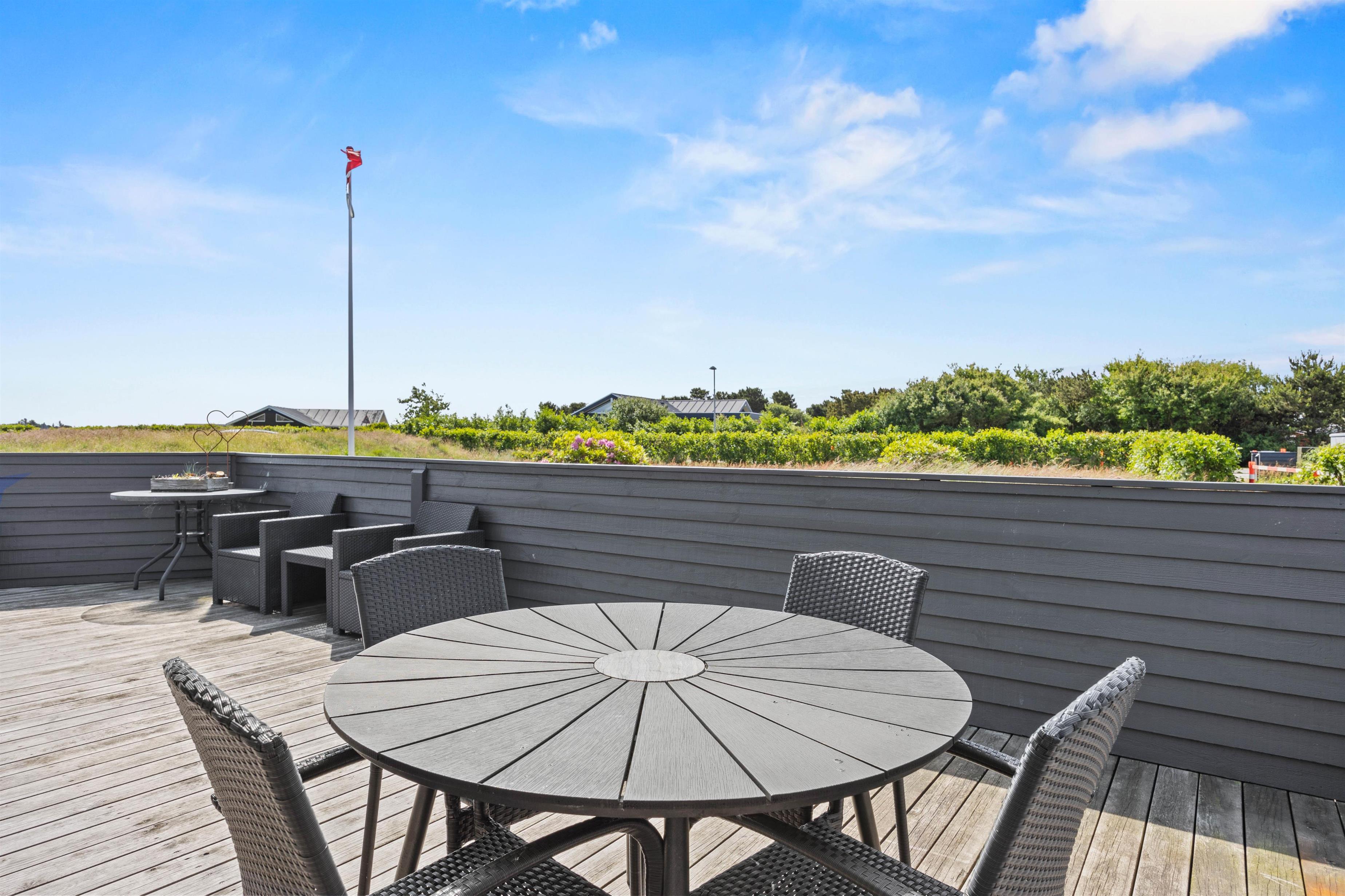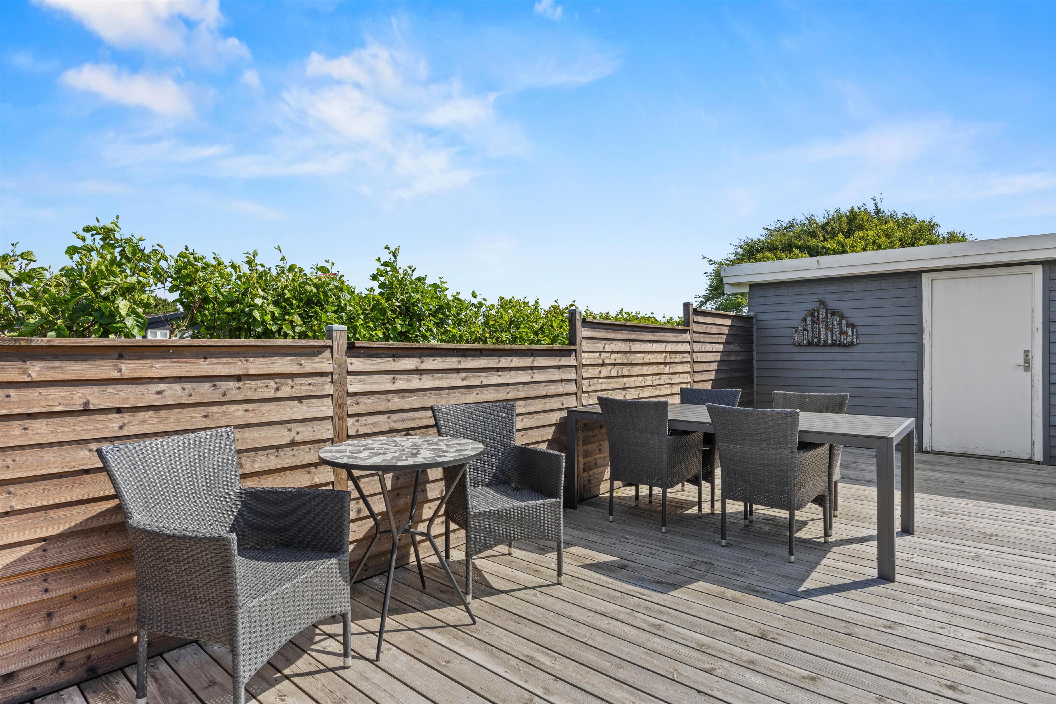 En dejlig dag i det fri er oplagt at nyde på feriehusets terrasser. Terrasserne varierer med både åbne, overdækkede og lukkede områder med læhegn og ”privatliv” alt efter behov.