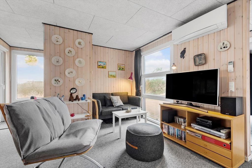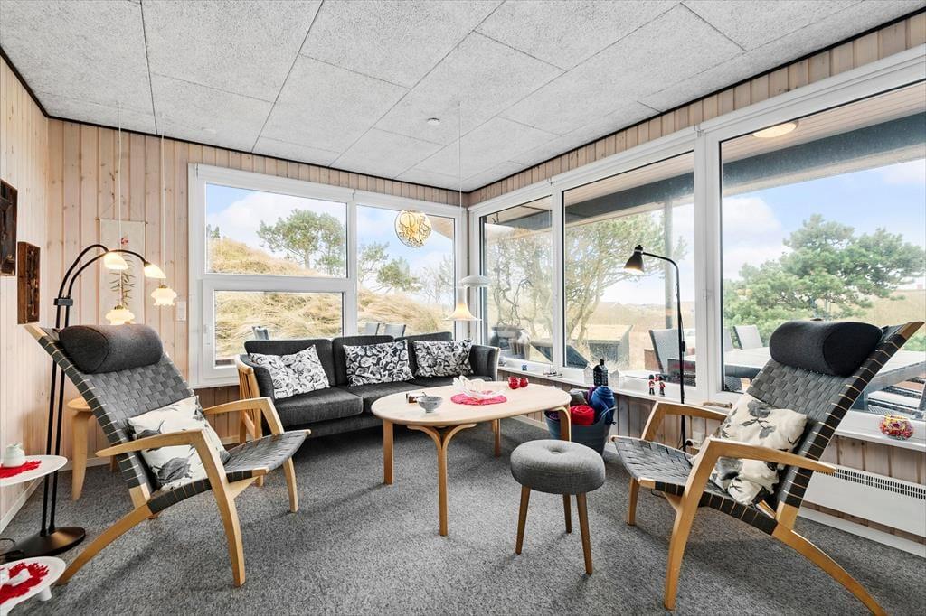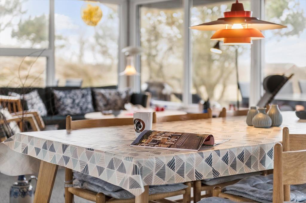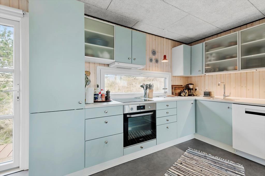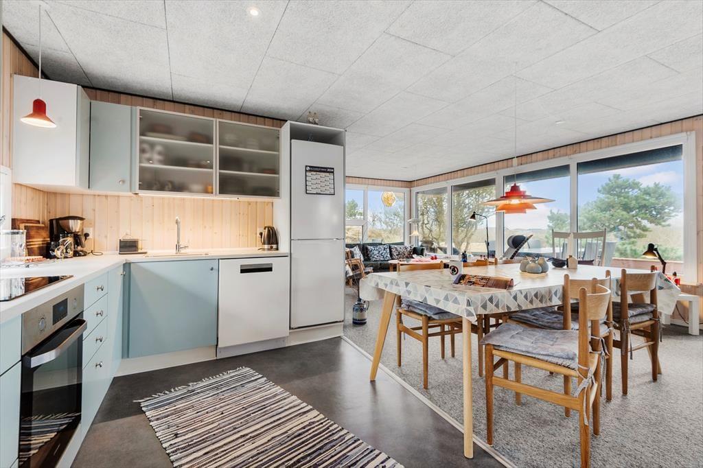 Sommerhuset har en dejlig placering i klitterne, så du kan se lige ud på bølgende marehalm og krogede fyrretræer, men også videre ud over området. Særligt i stuen sørger de store vinduer for at invitere lyset og naturen indenfor, og selvom du slapper af inden døre, bliver du stadig mindet om, at du er på ferie langt væk fra hverdagens trummerum. Både sofaafdelingen og spisebordet er hyggelige samlingspunkter, og hvis I er flere i familien, der kan lide at lave mad, kan I sagtens stå flere i det åbne køkken, når der skal skæres sprød salat eller laves velduftende gryderetter.