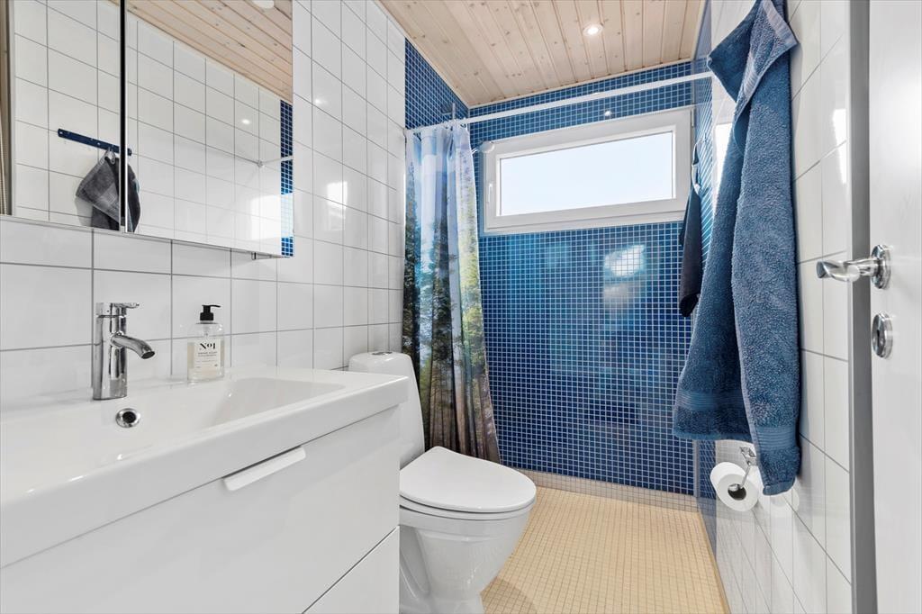 Husets badeværelse er pænt og rummeligt, men hvis solen skinner, og vinden er lun, er det måske mere fristende at tage morgenbad under åben himmel. I hvert fald er der etableret en udendørsbruser med varmt vand som del af terrassemiljøet, der breder sig sydvest for huset. Terrassen byder på et stort åbent areal, og der er også et overdækket område, hvor du kan blive siddende længe ude om aftenen, uden at skulle tænke på, om duggen snart vil falde. Er sommervejret alt for godt til at gå indenfor, kan du sågar sove ude i det fri takket være husets hyggelige shelter.