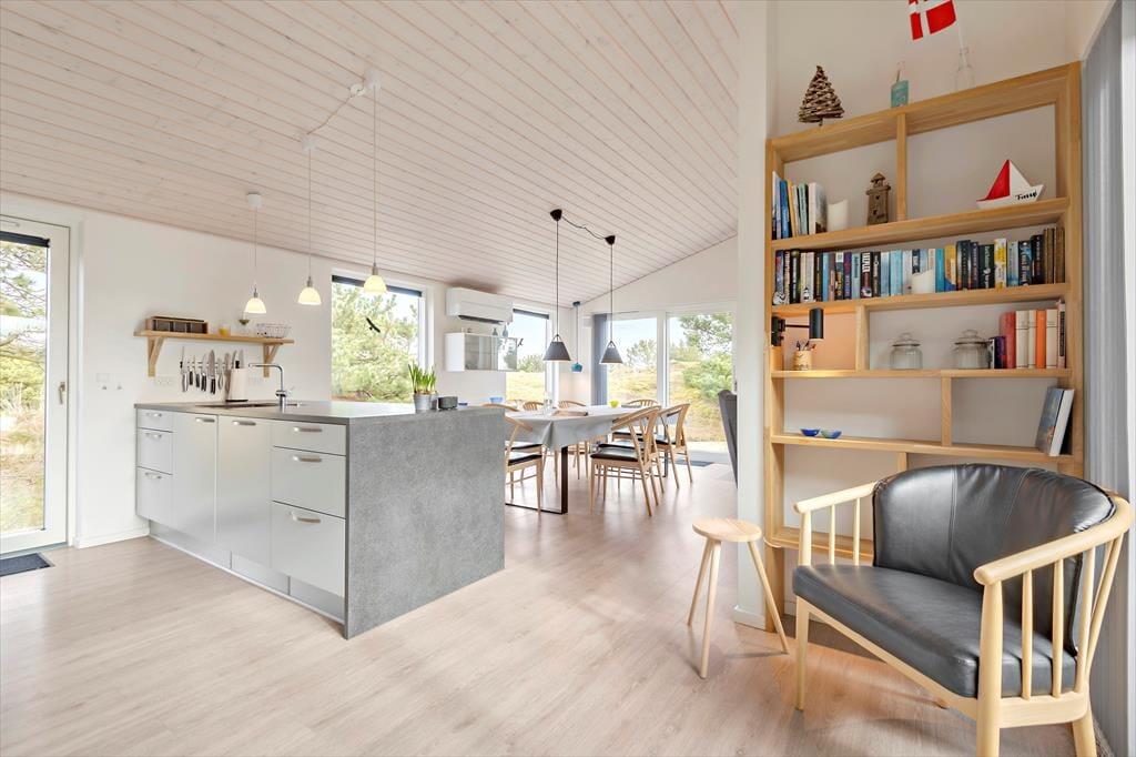 Sommerhusets planløsning er gennemtænkt, så både nattesøvnen, morgenbadet og de sociale stunder kan udspille sig i skønne omgivelser. I den ene ende af huset ligger tre gode soveværelser og to pæne badeværelser samlet – det vil sige, at du har mulighed for at trække dig tilbage for at sove, selv hvis de andre skulle have lyst til at blive længe oppe for at høre musik og spille spil i opholdsafdelingen. Når I alle sammen hygger jer her, har I god plads til både sofaafslapning og lækre middage såvel som madlavning i det åbne og veludstyrede køkken. Der er brændeovn i det lyse og højloftede rum, og de store vinduespartier sørger for, at både solen og naturen bliver inviteret helt indenfor.