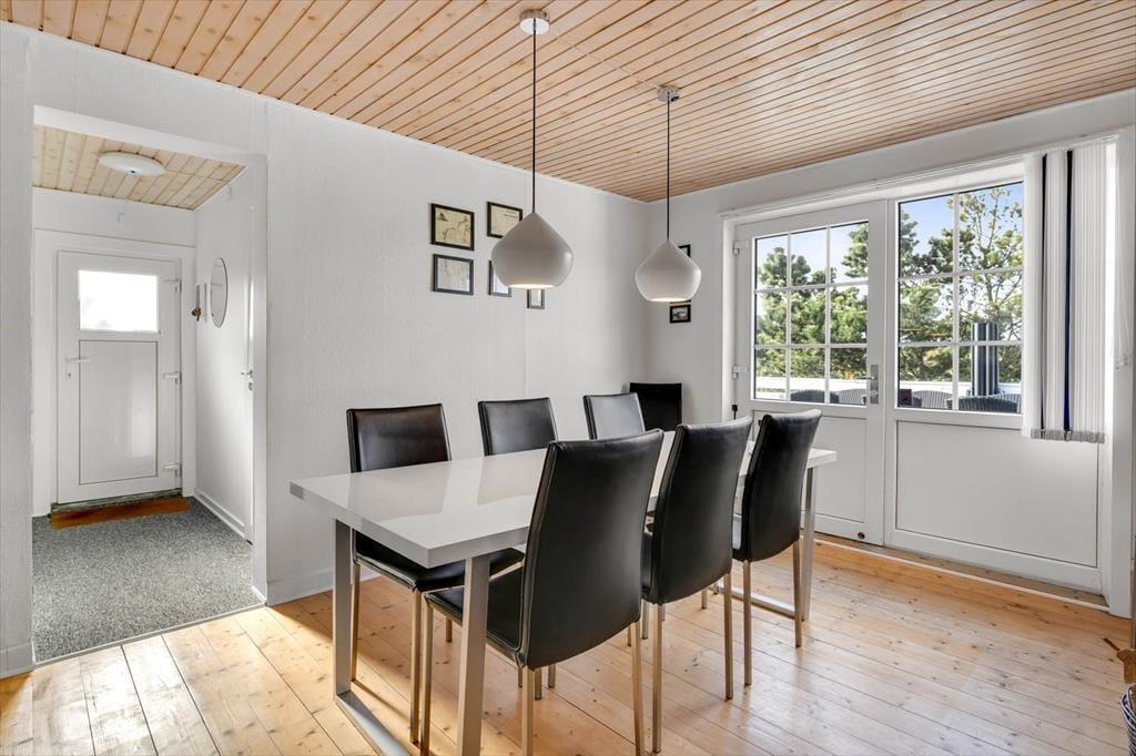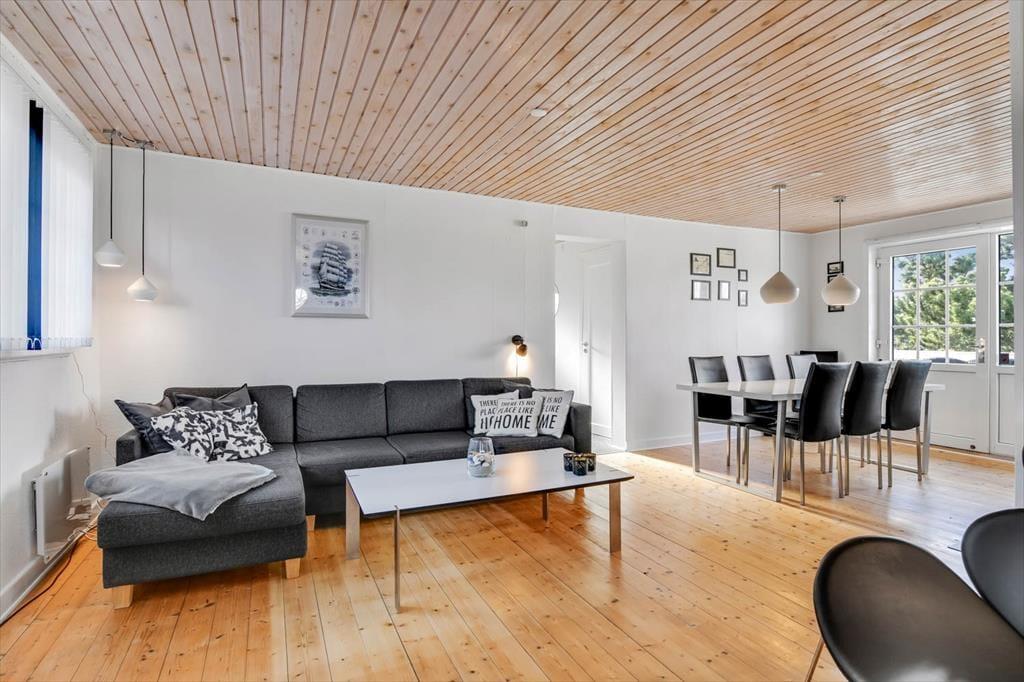 Indenfor mødes du af en varm og imødekommende stemning, hvor den enkle indretning og de fine detaljer skaber ro for øjet og plads til samvær. Opholdsrummet fungerer som husets naturlige hjerte, hvor det åbne køkken og stuen med spiseplads smelter sammen i ét – perfekt til lange feriedage med nærvær og hygge. De karakteristiske, runde vinduer i gavlen er med til at give huset sin egen særlige charme og lukker et smukt lys ind i rummet, der forandrer sig i takt med dagens timer. Her er hverken pyntet unødigt eller overmøbleret – og netop dét giver plads til, at du og dine kære kan sænke skuldrene og finde jer godt til rette. Uanset om I samles til morgenmad, brætspil eller aftensmad, føles huset som et trygt og rart sted at være.