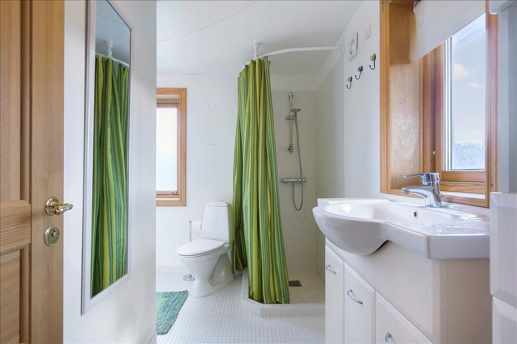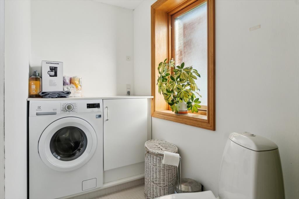 Pænt stort badeværelse med bruseniche, toilet og håndvask samt vaskemaskine.