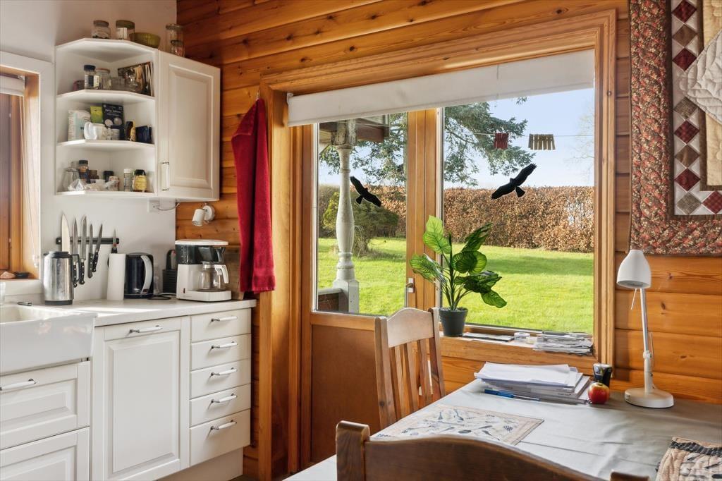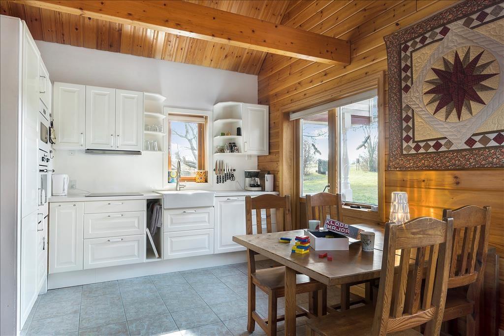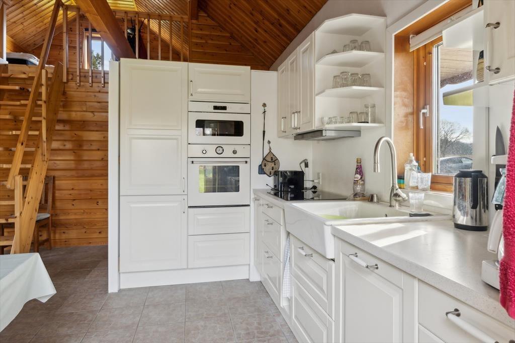 Pænt nyere køkken med ovn, mikroovn, 4 kogeplader, elkedel, kaffemaskine, emhætte, opvaskemaskine, samt alt service og køkkengrej.