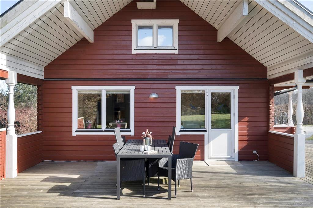 Udg. til stor skøn træterrasse med pæne havemøbler –