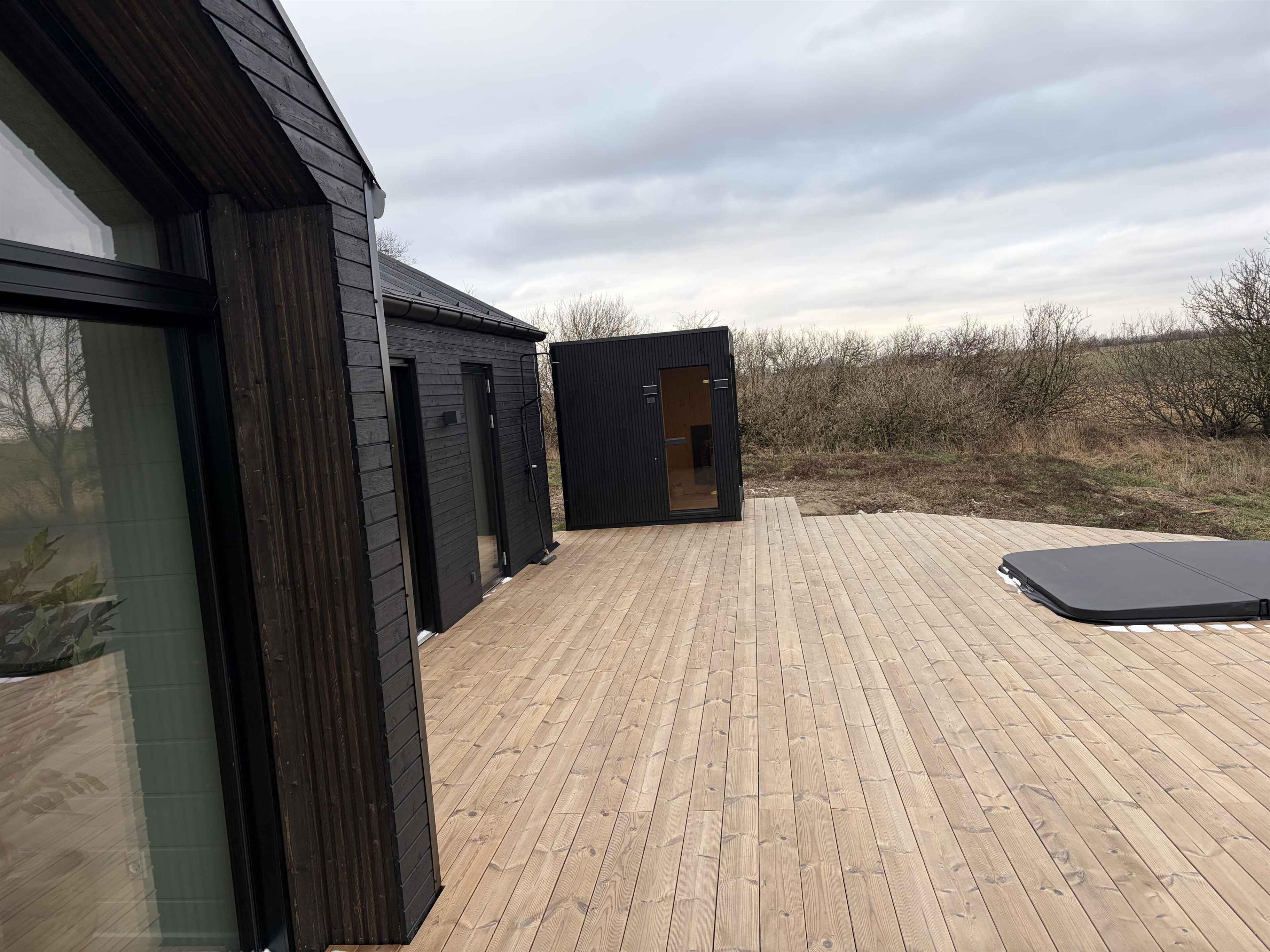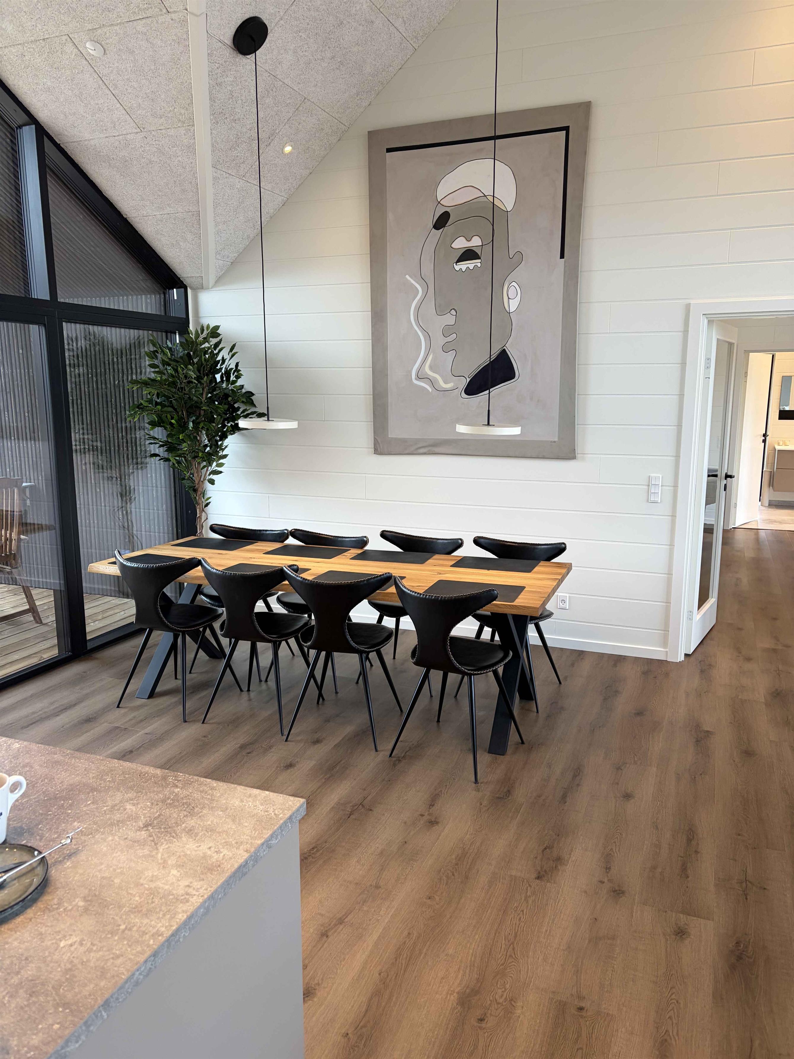 Sommerhuset er beliggende i roligt område, rådyrene går lige udenfor vinduerne sammen med andet vildt. Det er tæt på Sallings bedste badestrand, hvor man kan hygge sig bla. med restaurant og iskiosk. I området er der masser af stier, her kan man gå både i skov og tæt ved Limfjorden og selvfølgelig benytte badebroen, hvis man vil i vandet. Sommerhuset er tæt på Jeppe Åkærs kunstnerhjem og museum, der kan skimtes som den nærmeste nabo til den ene side. Sommerhuset er på 165m2. Indeholder entre, fordelergang til 2 værelser med dobbeltsenge, badeværelse, med indbygget armatur og stor bruseniche, stor køkkenalrum stue med alt i hvidevarer bl.a. opvaskemaskine, induktionskomfur med indbygget emfang, 2 stk ovne, køle- fryseskab, kaffemaskine, elkedel, stor indbygget vask. Spiseplads til 8 personer og service til samme antal. Lige udenfor er den overdækket terrasse, hvor man kikke op til stjernerne igennem et stort ovenlysvindue. Lige udenfor den overdækket terrasse står der en morsøpizzaovn til brænde som man kan benytte sammen med den kulfyrede webergrill. Stuen har stor sofa, 2 stole og en stor pilt ved den indbyggede brændeovn med glas, som man kan se i både køkken og stue. Aktivitetsrum, med div. spil og nyt billiard/ bordtennis og Dart. Her finder i de sidste 2 værelser med dobbeltsenge og hems, som kan benyttes til afslapning, Fra aktivitetsrummet kan du gå ind på badeværelse nummer 2 også med indbygget armatur,stor bruseniche. Endvidere er der her vaskemaskine og tørretumbler. Fra badeværelsets terrassedør er der adgang til den store 300m2 træterrasse, hvor der er en udendørsbruser med koldt og varmt vand. Spabad til 8 personer er nedsænket i terrassen. Opvarmes uden brug af brænde. fra 8 grader til 40 grader på ca. 1,5 time. Der er en udendørssauna med glas, så der er udsigt ud over limfjorden til 8 personer, saunaen er elektronisk opvarmet. Den store træterrasse tilbyder mange kroge, hvor man kan finde læ.