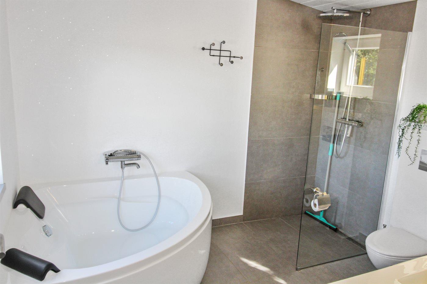 Der er 1 badeværelse med bruseniche og 1 toilet.. Badekar.