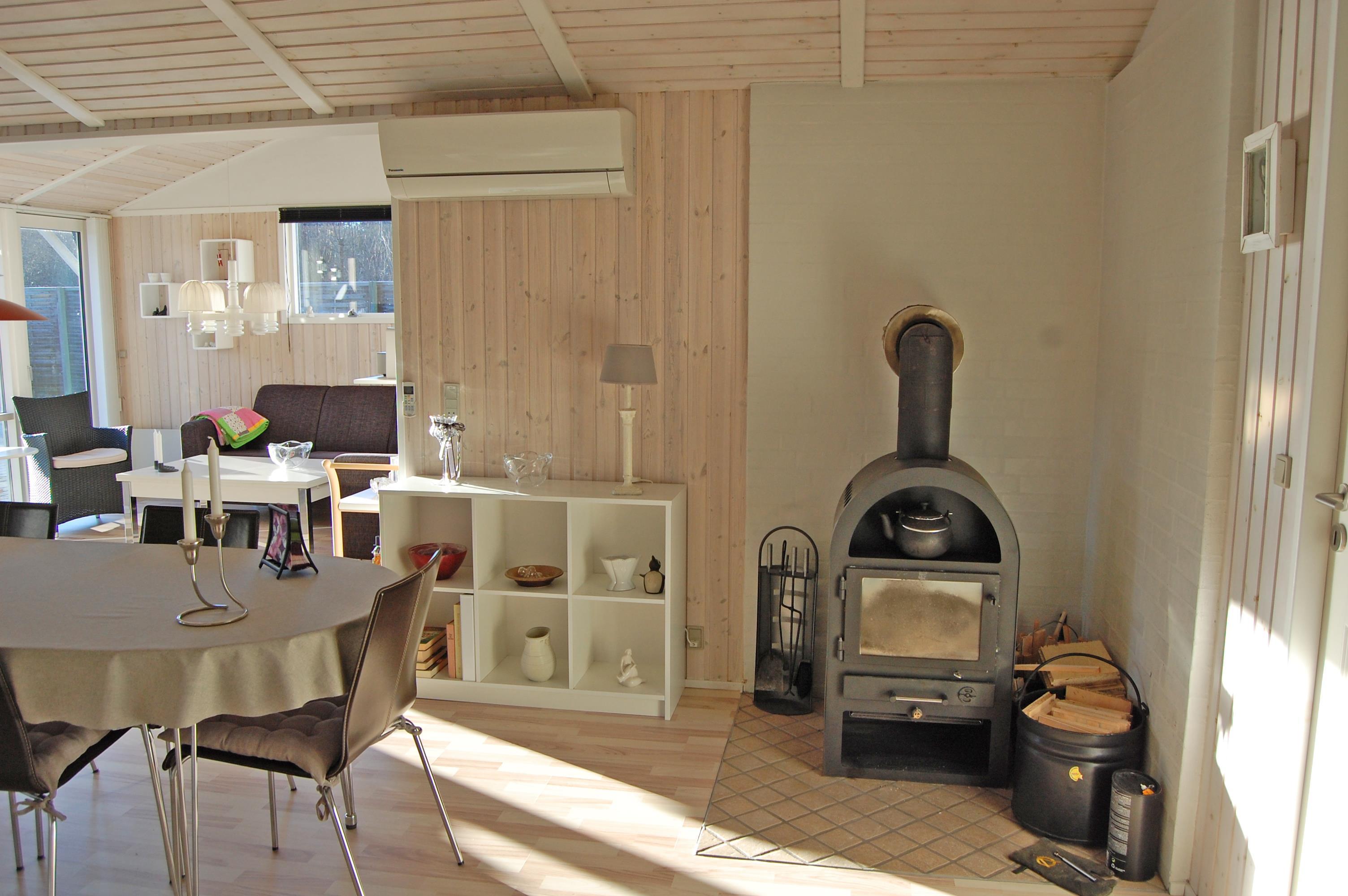Den lune hygge er sikret med brændeovnen, som er placeret ved spisepladsen. Stuen har et hyggeligt sofahjørne med god udsigt til haven og med udgang til den ene af terrasserne.