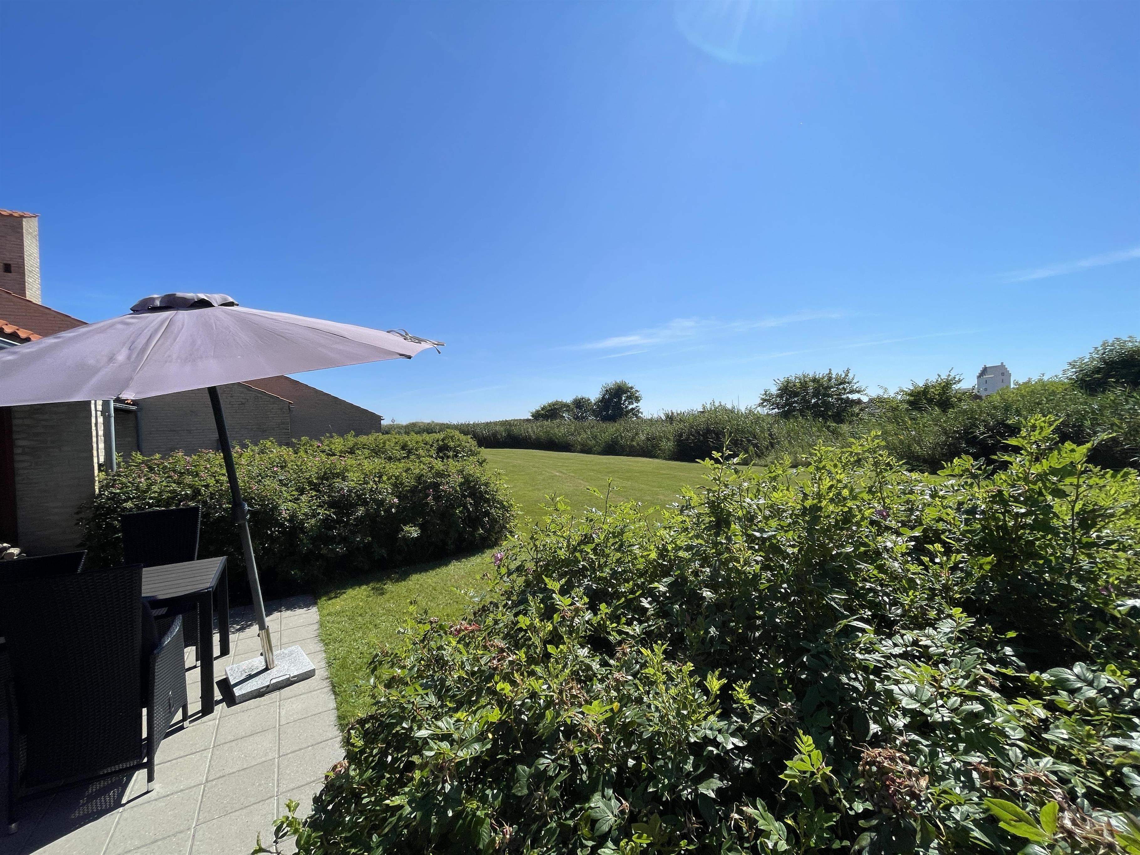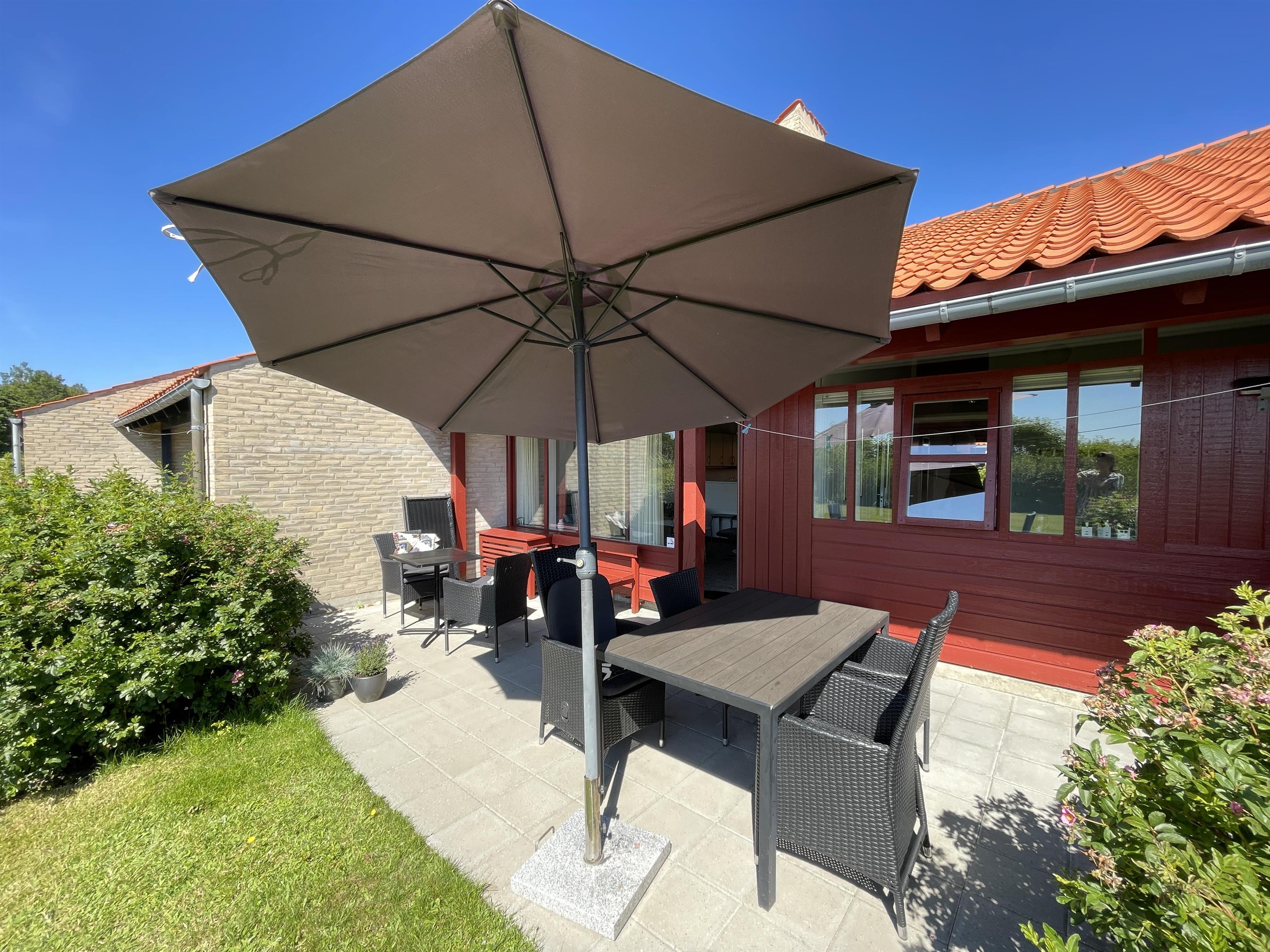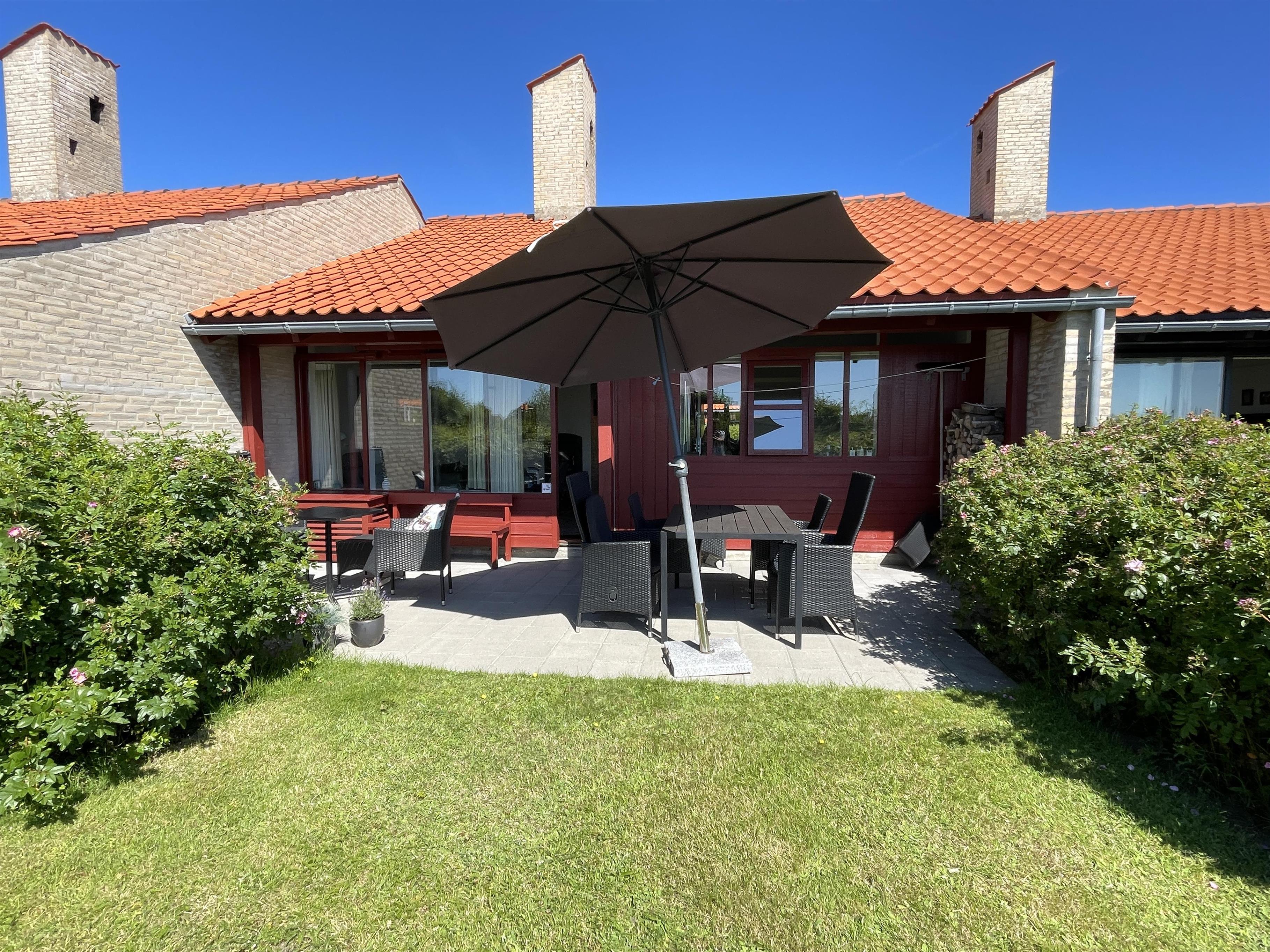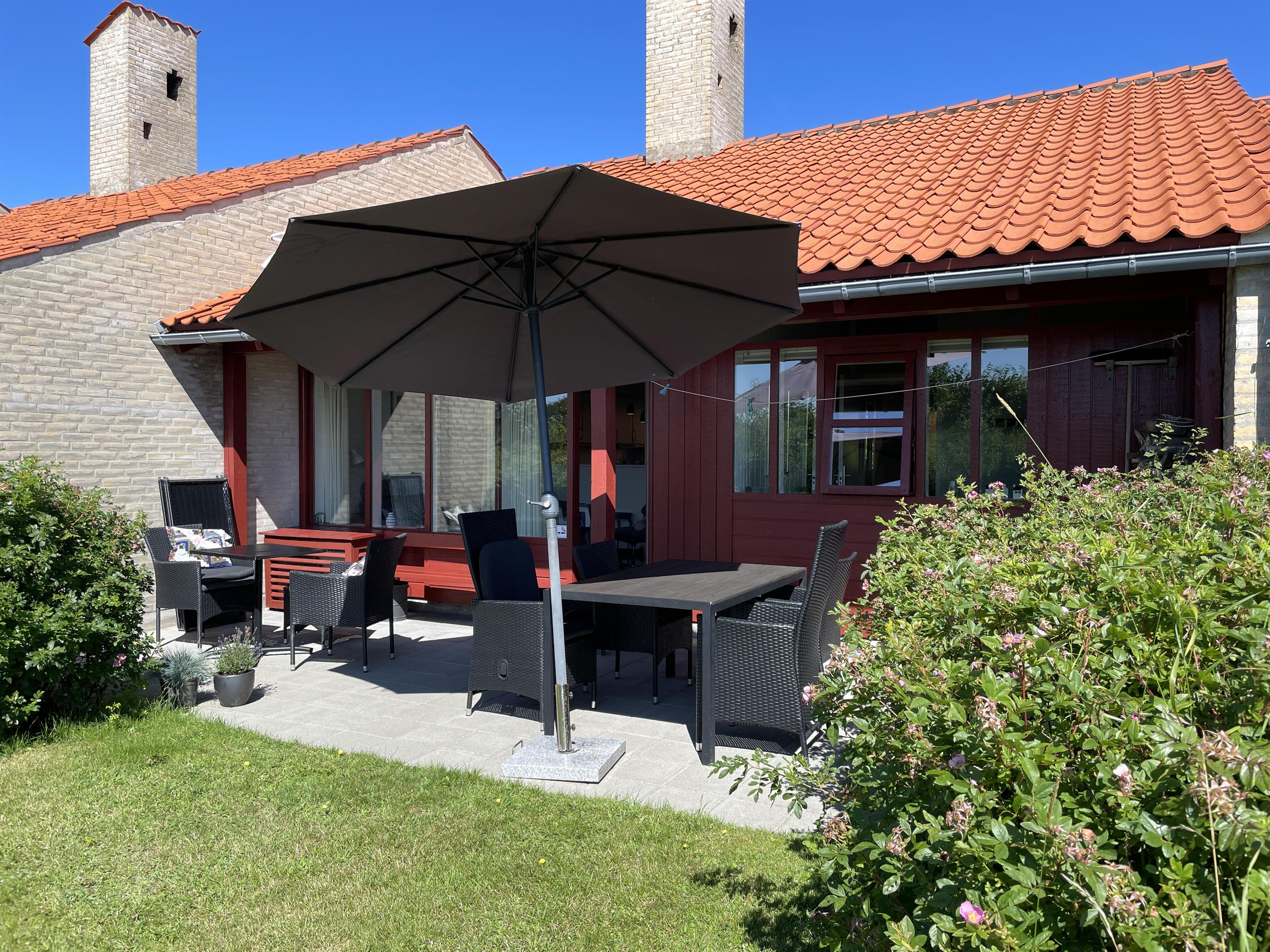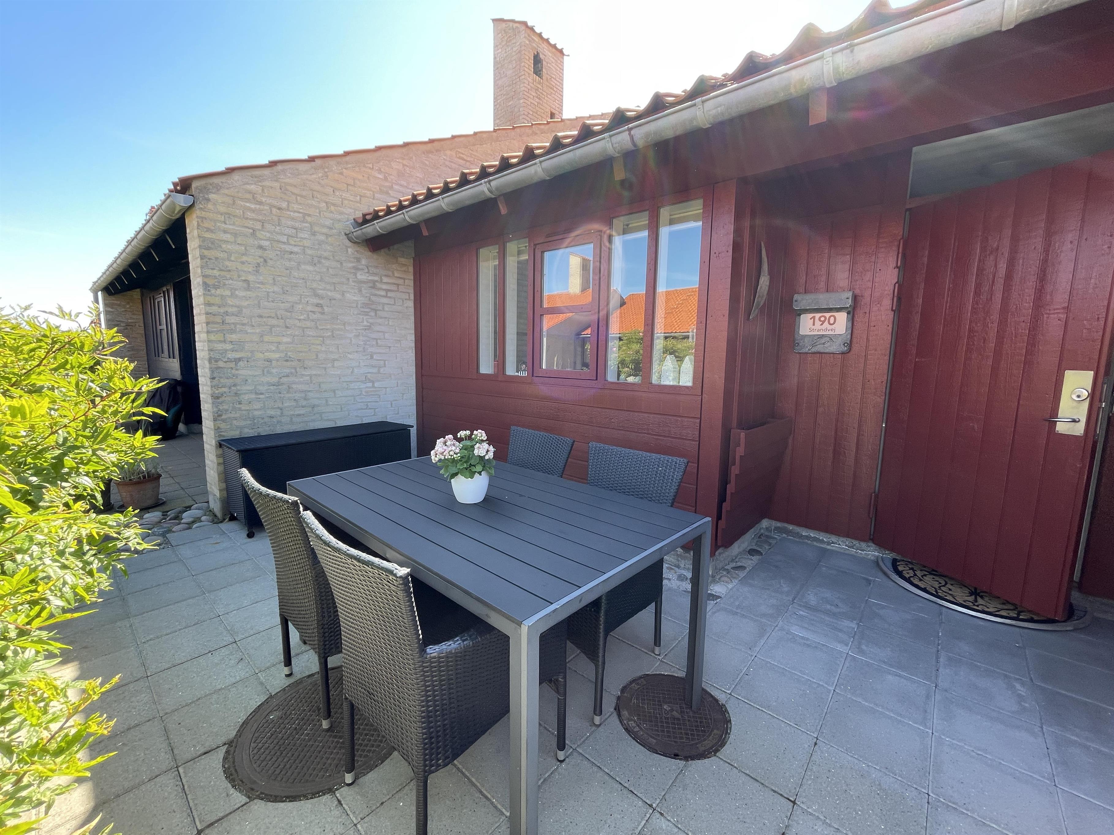 Fra stue og terrasse er der det smukkeste udsyn over åen og mod den gamle bydel og kirke - et smukt syn i dagtimerne, men også smukt når lysene funkler fra byens huse om aftenen - man fristes til at kalde det for Sæby's lille skyline. Terrassen er indrettet med flotte sorte flet havemøbler. Der er et havebord til 6 personer + 2 regulerbare stole og 2 fodskamler og et kaffebord til 2 (Ialt 10 stole og 2 x 6 mandsborde) - og på den store fælles græsplæne lige udenfor er der god mulighed for at udfolde sig som både barn og voksen. Foran huset er der også en terrasse.