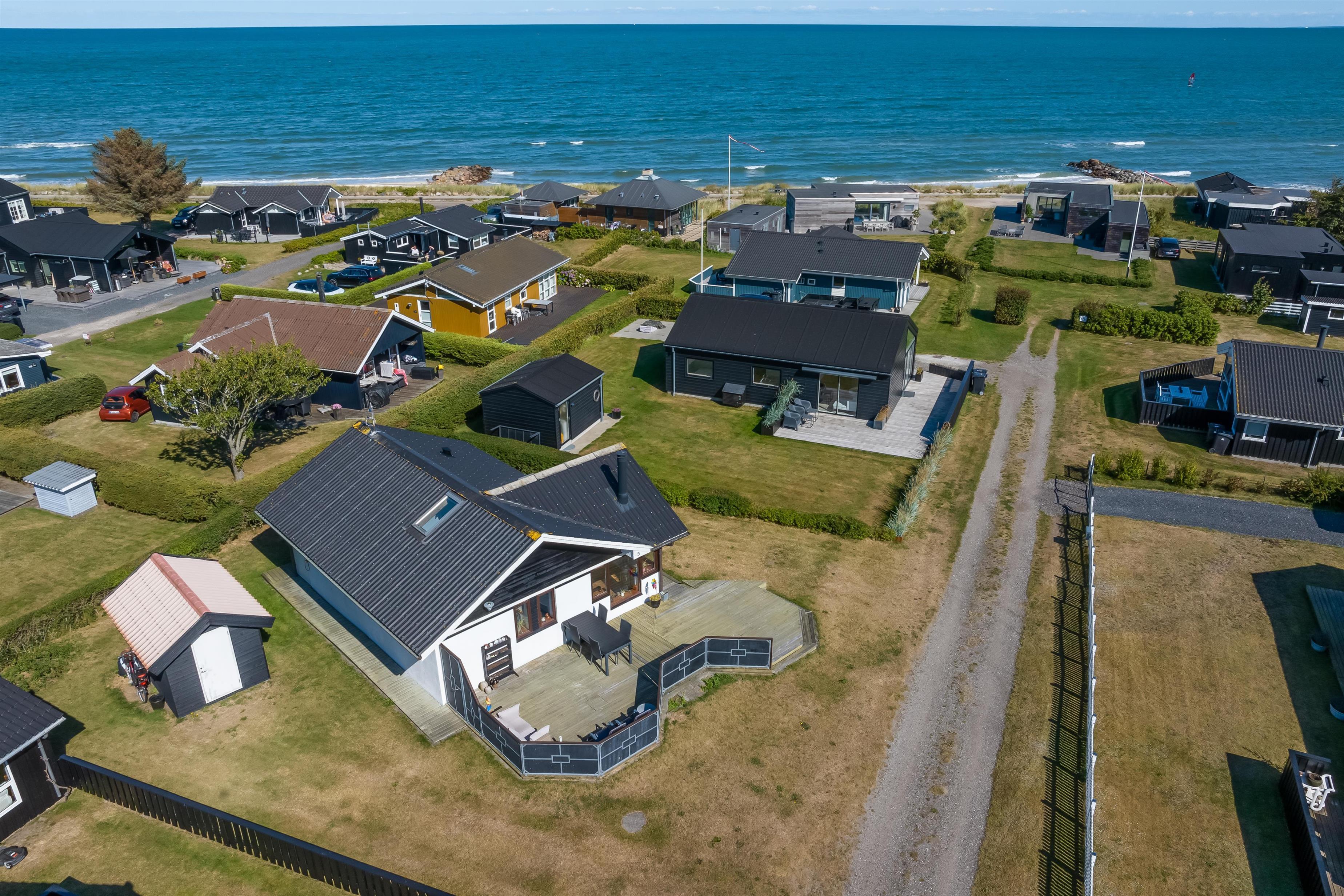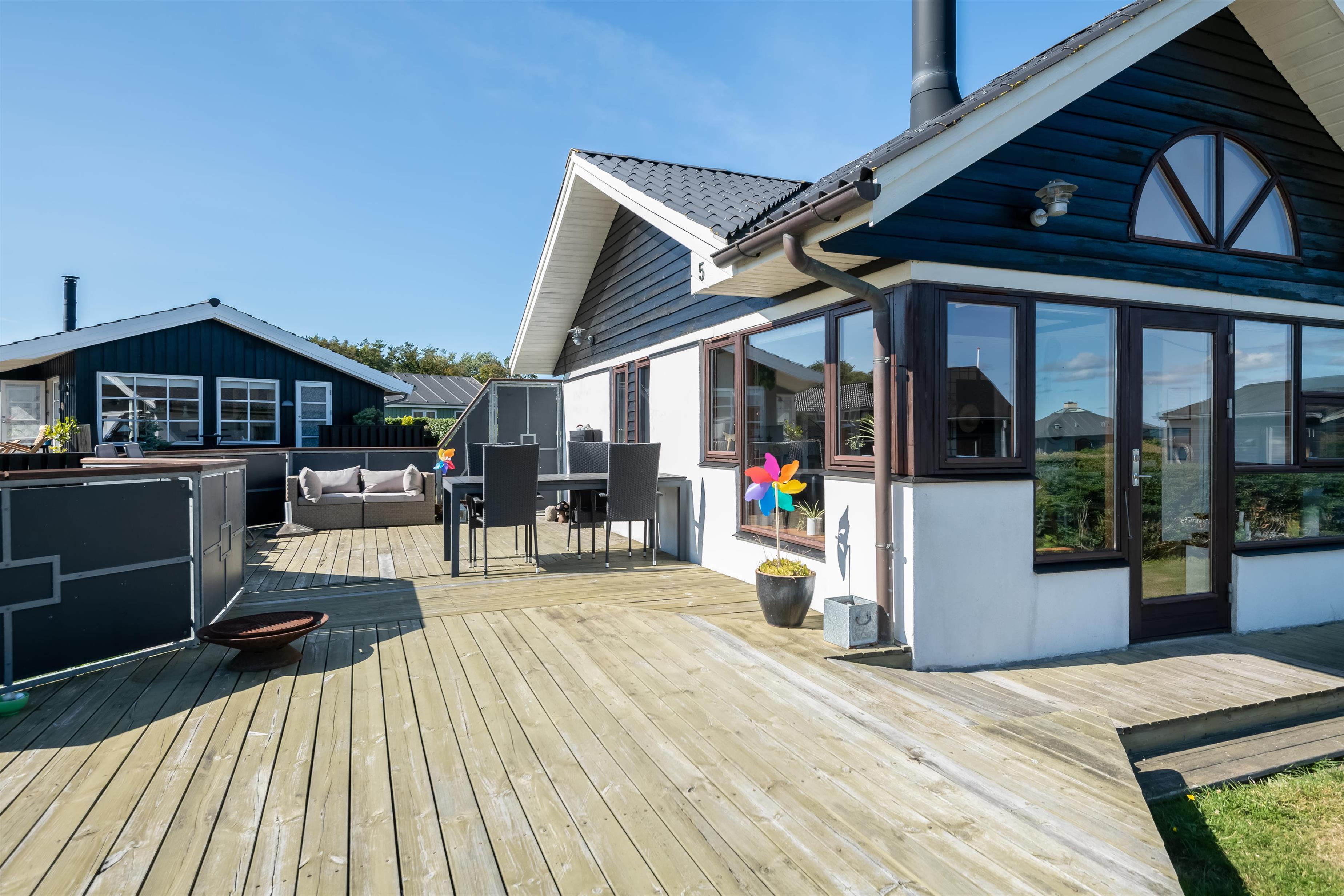 Køkken og stue går ud i et, med et super flot maritimt look, der skabes med skibsgulve, trækøkken, trædøre, træ/metal trappe og indretningen generelt. Rundt hele huset er der en dejlig stor træterrasse, med flere sidekroge og udgange både fra stue og køkken. Fra indkørslen er terrassen lavet sådan, at man kan, kører op med en kørestol, dog er der et små dørtrin ind/ud af huset. På bagsiden af huset er der en udebruser, så sandet nemt kan skyldes af efter en tur på den nærliggende sandstrand med blåt badeflag.