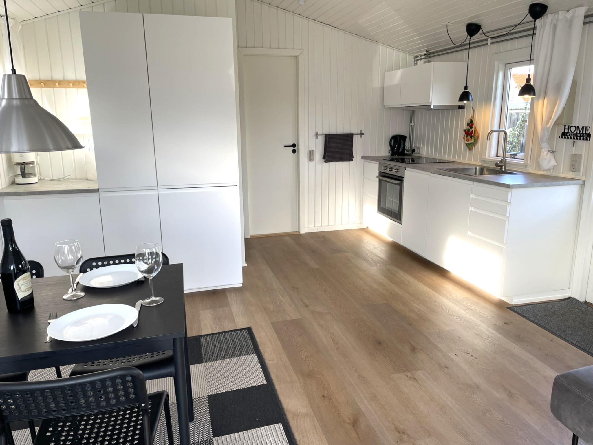 Det lille hus på 32 m² rummer et dejligt lyst køkkenalrum, et mindre soveværelse samt badeværelse, med vaskemaskine.