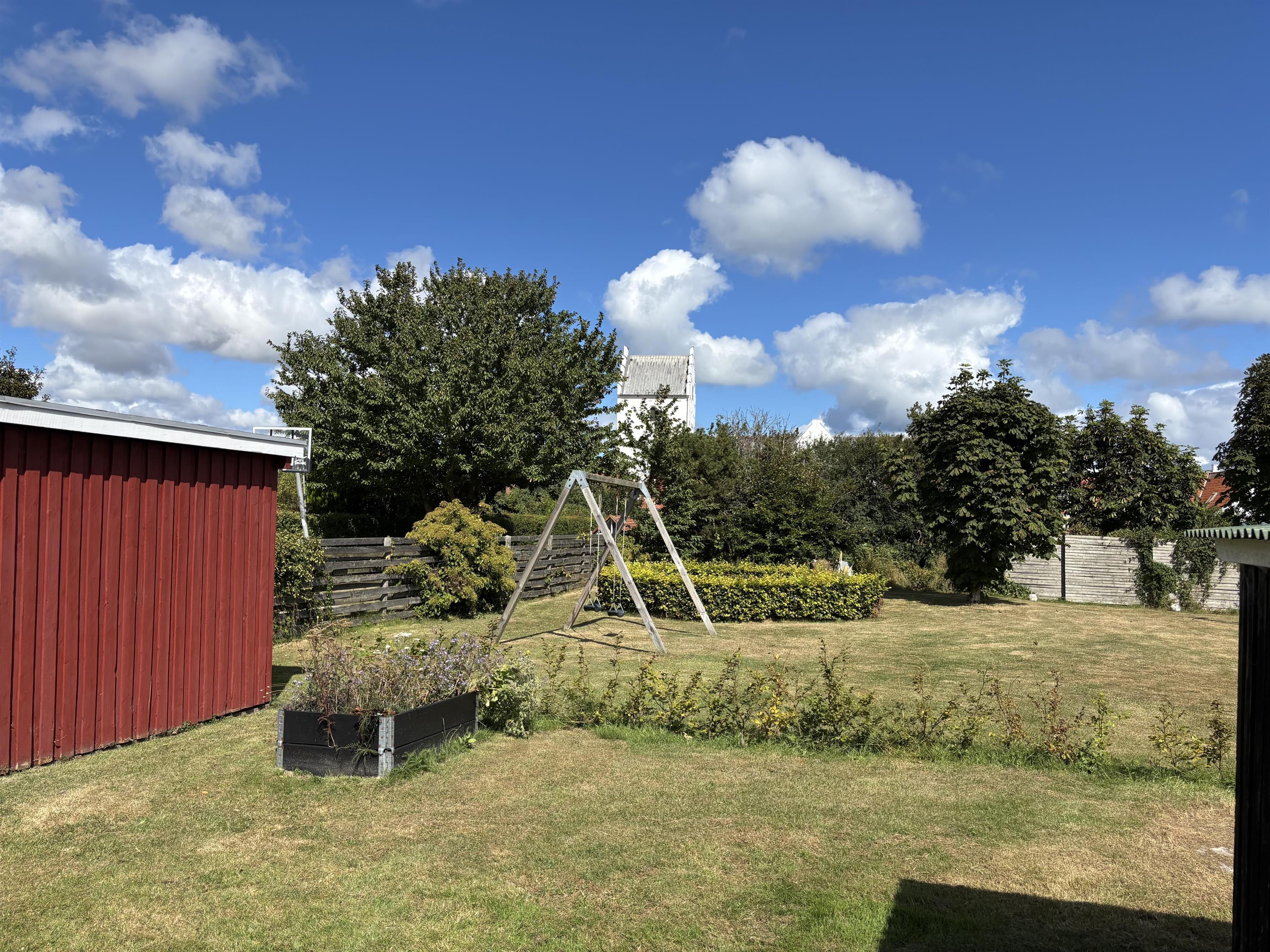 Haven deles med andre, og indeholder gyngestativ og trampolin.