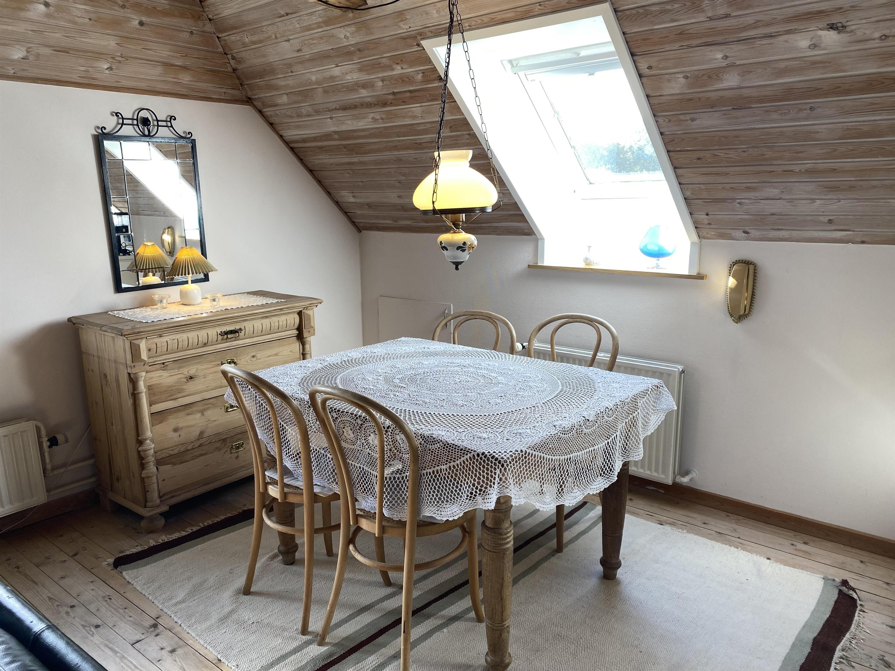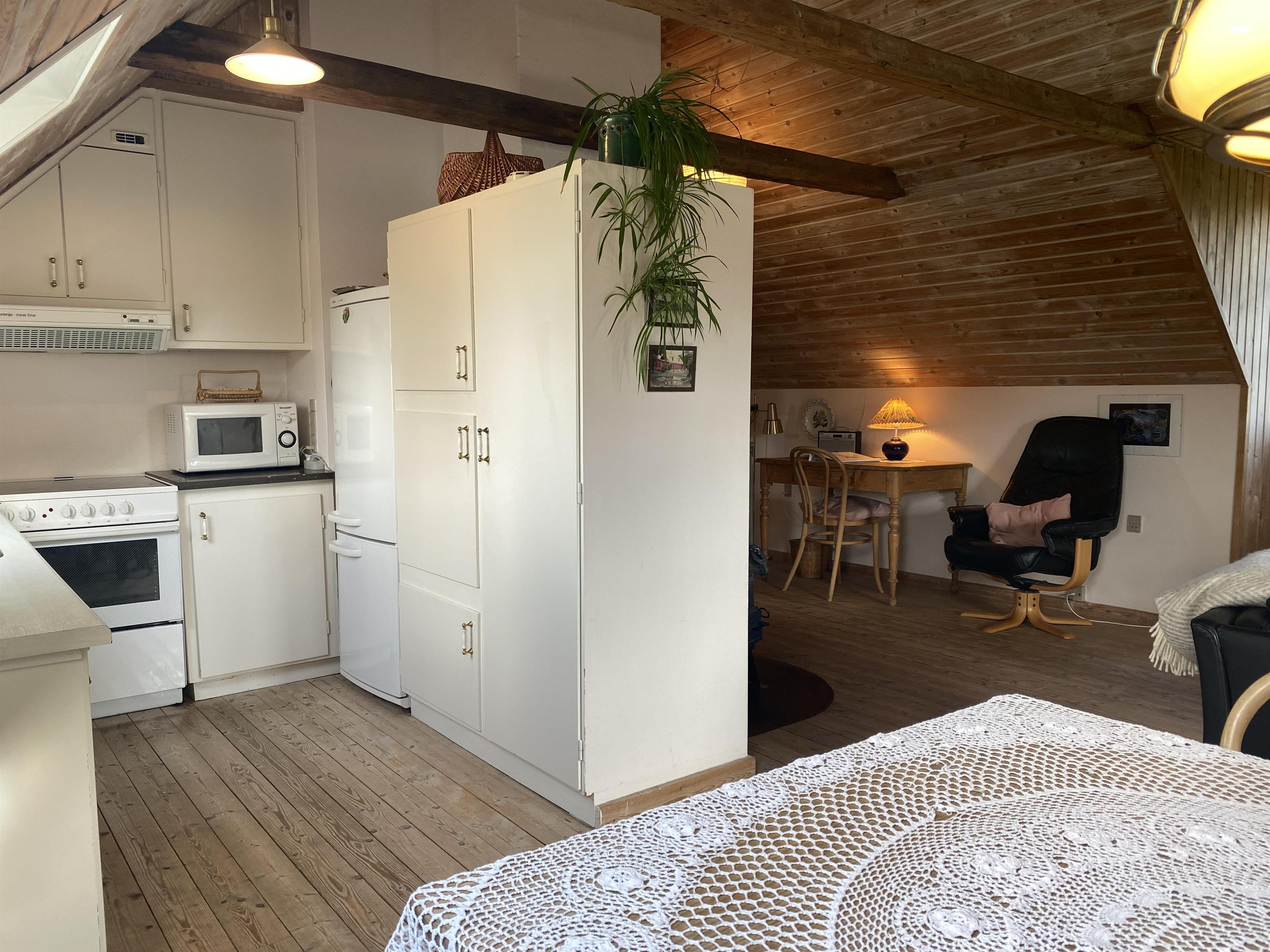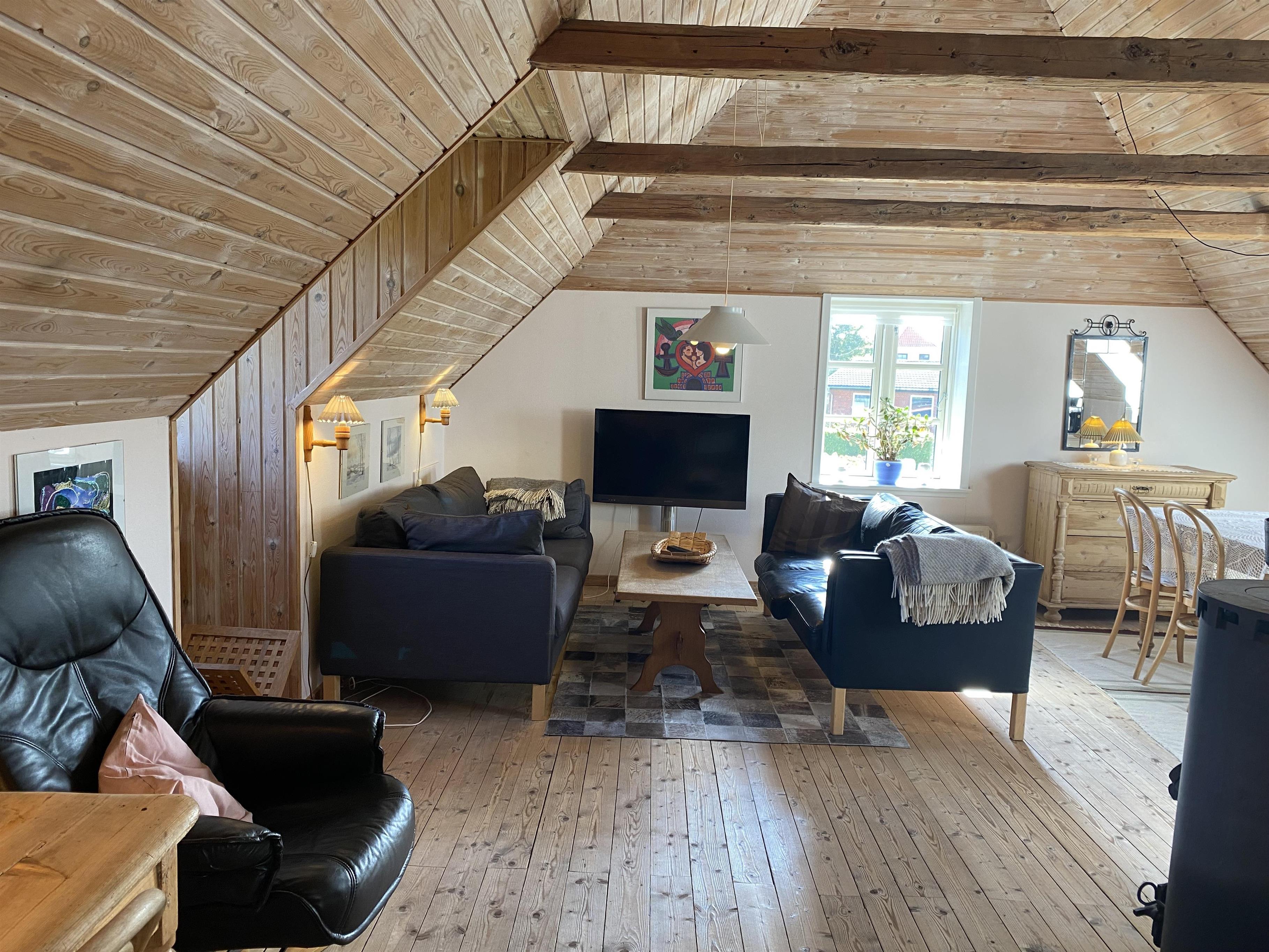 Lejligheden er indrettet i en personlig os hyggelig stil med god udnyttelse af rummene, og er i tråd med den flotte gamle ejendom og haven med gamle krogede træer. Et lille funktionelt køkken i et åbent rum med spisebord og et sofahjørne med fjernsyn indbyder til hygge og samvær. I rummet er der også en brændeovn, der kan hygge på de køligere aftener eller dage. Badeværelse med badekar, hvis der skal være ekstra afslapning på ferien. Der er to soveværelser, begge med dobbeltsenge, og derudover er der mulighed for opredning til en person på sovesofaen i stuen.