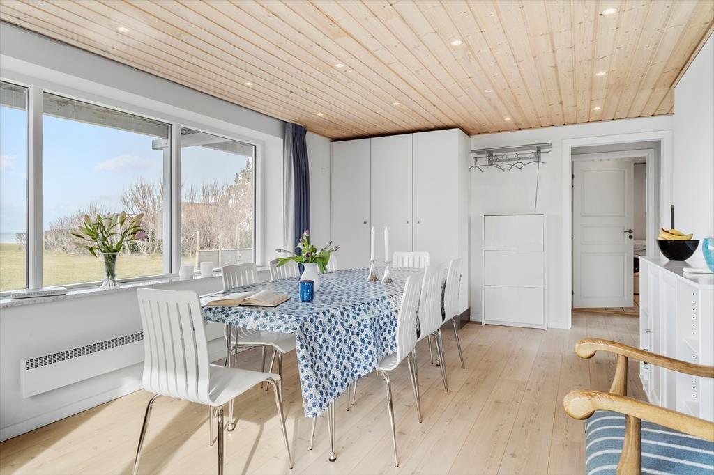 Ved spisebordspladsen er der også store, dejlige vinduer hvorfra der er udsigt til vandet. I denne lyse og indbydende spisestue kan alle samles og nyde dagens måltider. Her er også en 3-personers sofa og lænestol, så alle kan være samlet her, om man spiller et spil ved bordet eller hviler sig i sofaen. Fra en glashavedør er der udgang til en dejlig sydvendt terrasse, der er perfekt til at tage måltiderne eller morgenkaffen med ud på. I forlængelse af denne terrasse er også en overdækket terrasse, der vender mod vest og vandet.