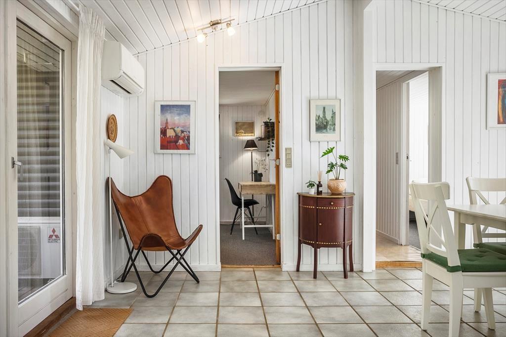 Når solen skinner – og det gør den heldigvis ofte over Limfjorden – rykker livet udenfor. Terrassen snor sig næsten hele vejen rundt om huset, så du altid kan finde en dejlig plet i solen eller i skyggen, afhængig af tidspunktet på dagen og humøret. Den overdækkede del af terrassen inviterer til lange aftener med grill og god vin, mens resten af udeområdet er ideelt til afslapning i liggestolen med en god bog. Her er der plads til både mennesker og dyr – og til at slippe hverdagens rutiner helt. Og når mørket falder på, kan I lytte til bølgerne i det fjerne og mærke den særlige ro, som kun et sommerhus tæt på vandet kan give.